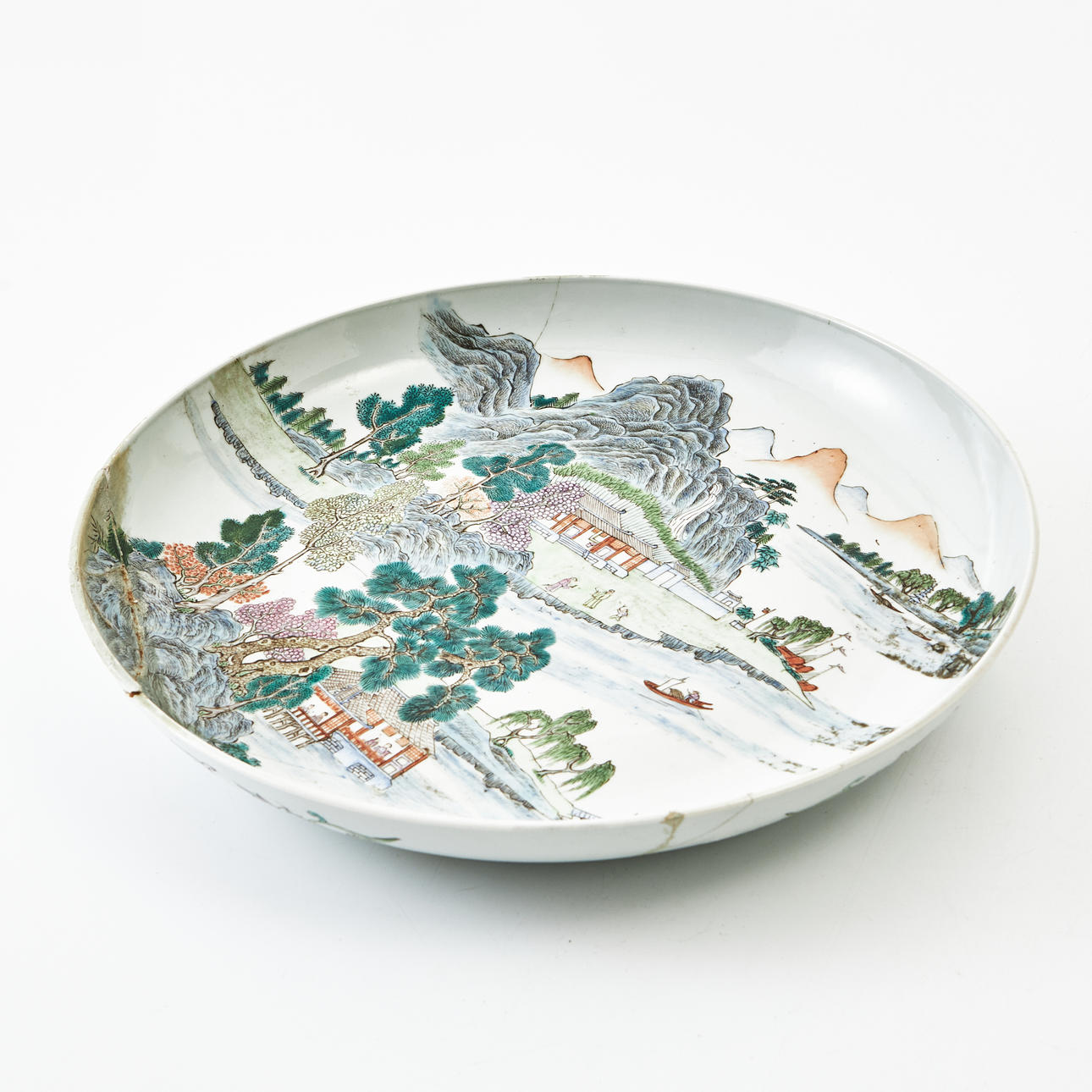 A Chinese porcelain dish, 19th century, river landscape decoration.