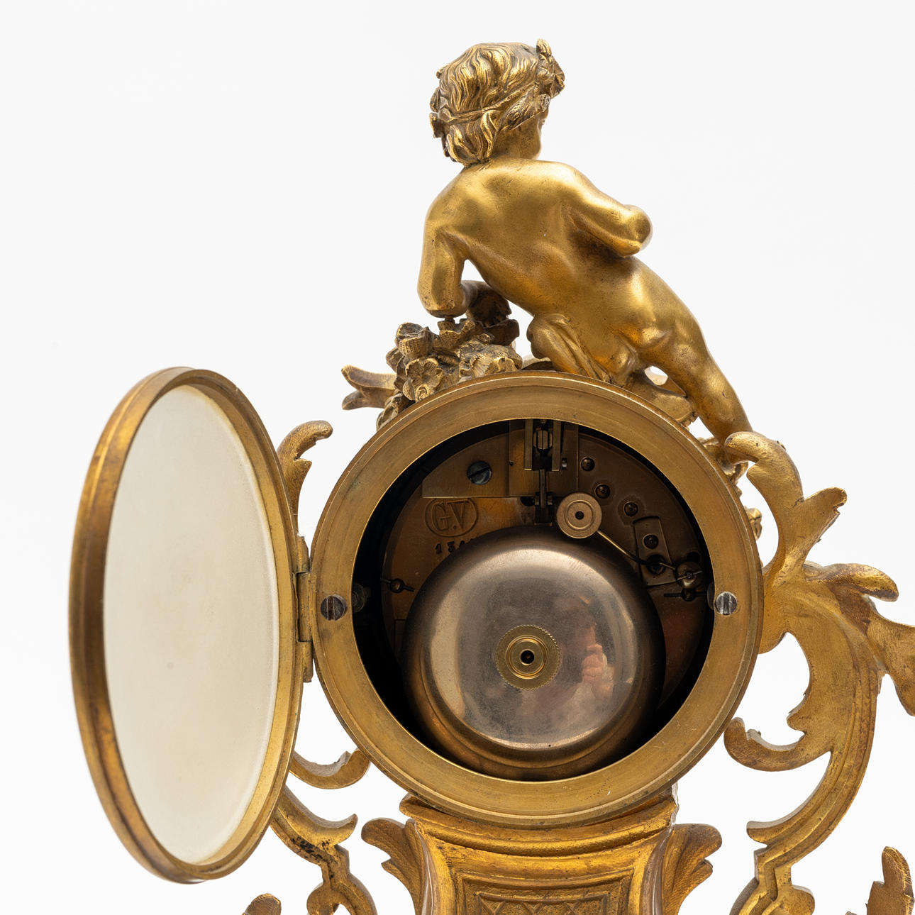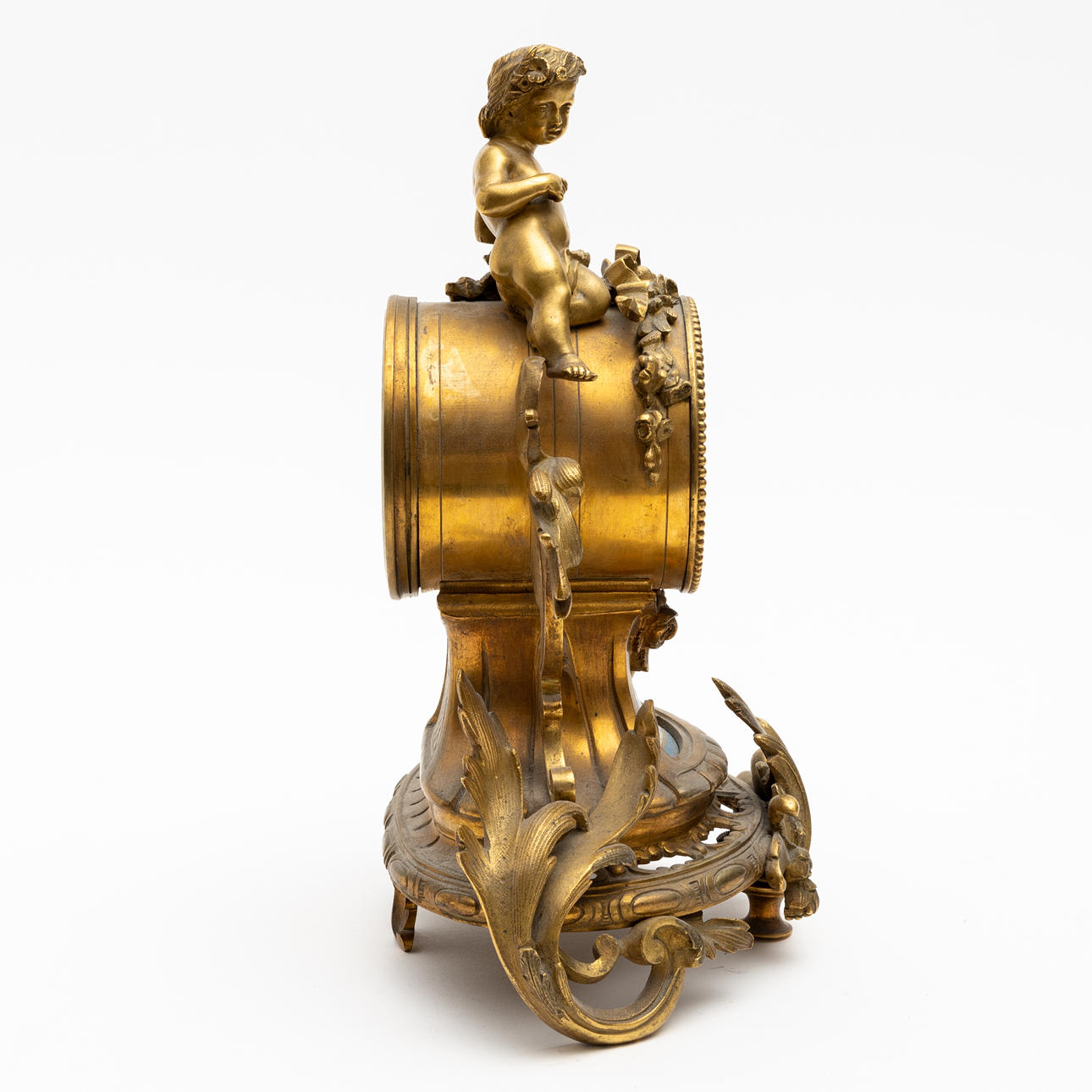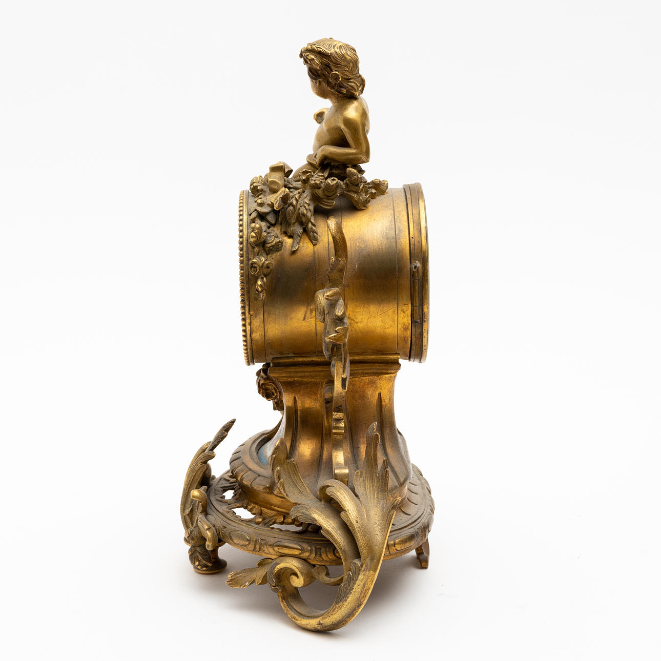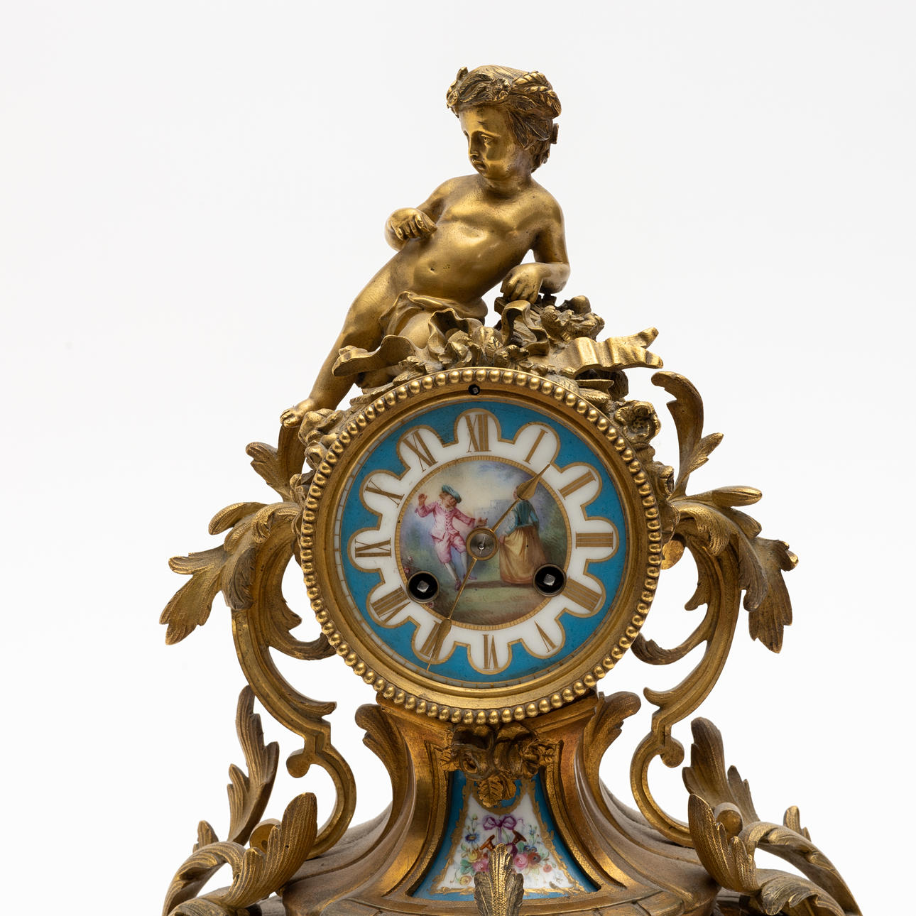 Decor in the form of foliage as well as boy with wreath in his hair. Dial and decorative part in enamel with polychrome figurine scene and musical instruments, width approx. 23 and height 29,5 cm. Clock key available. Condition Slight surface wear, dial with discolorations, not functional tested. Key/keys included. 334813