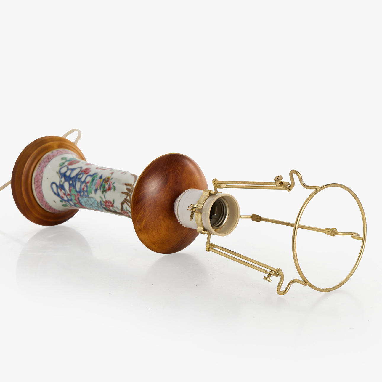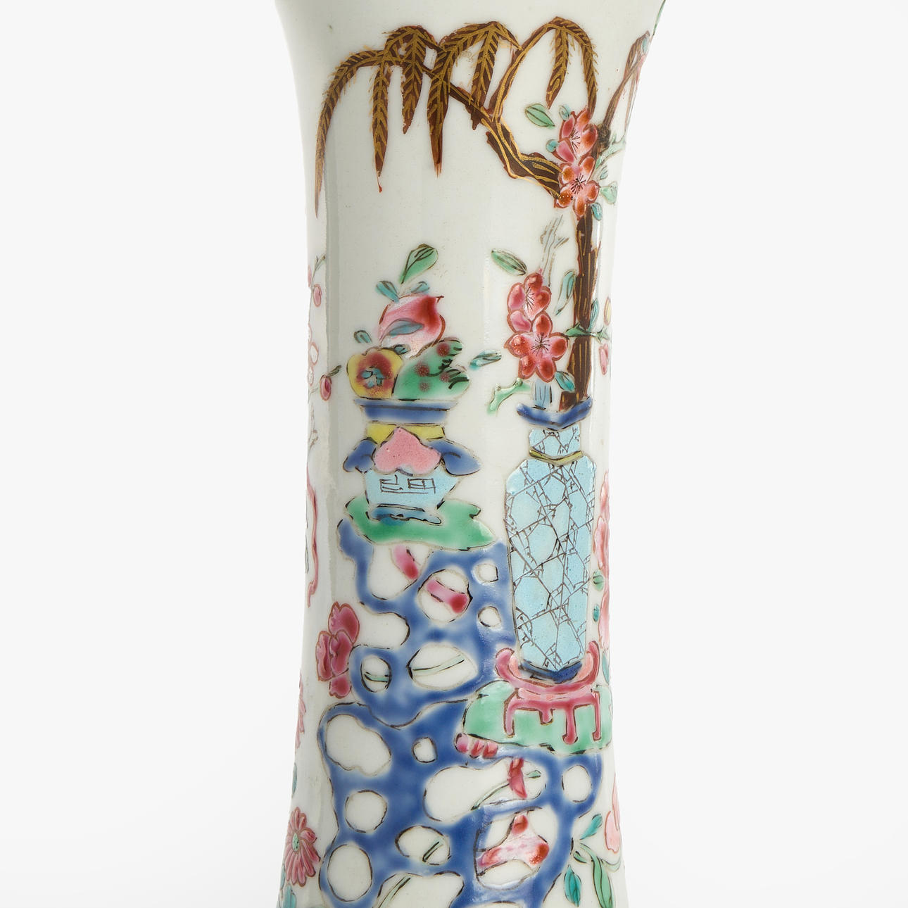Famille rose, motif of flowers and antiques, Height, vase 18,5 cm. Height with lamp mounting, 41 cm. Condition Drilled underneath for electricity. A small notch on the edge of the mouth. Small foot ring tags. The mouth and foot are not examined as these are hidden by the fitting. 119595