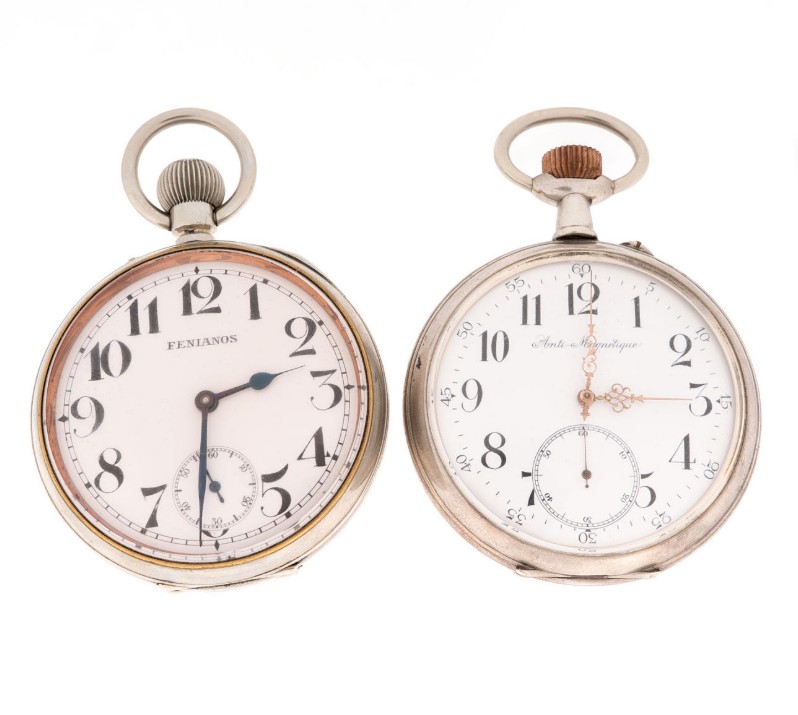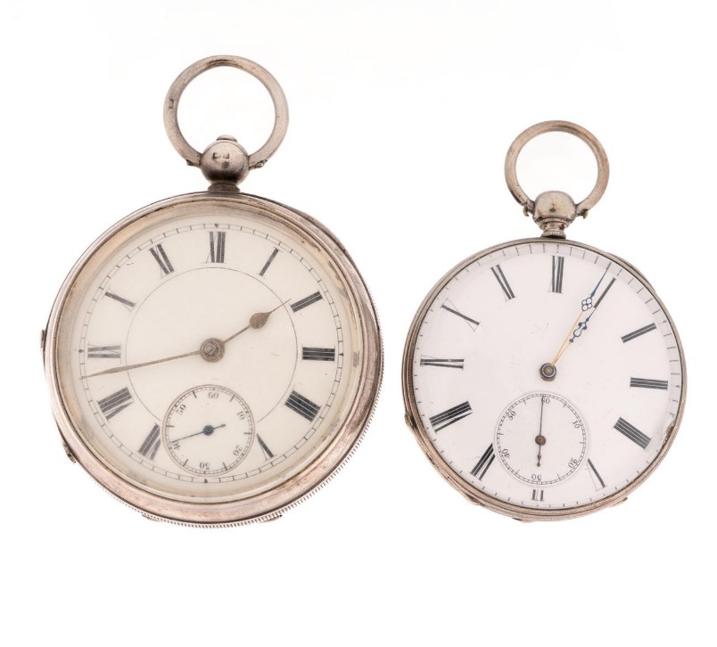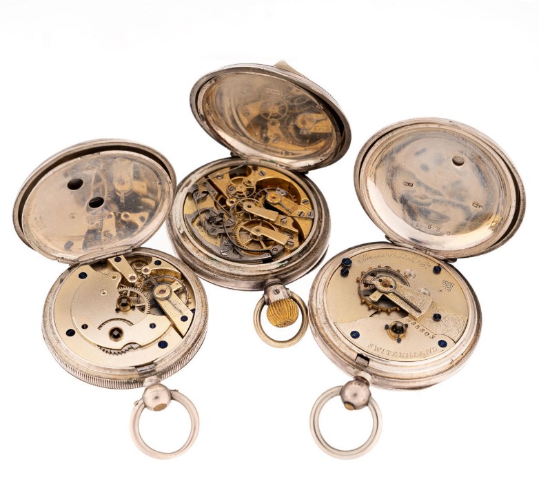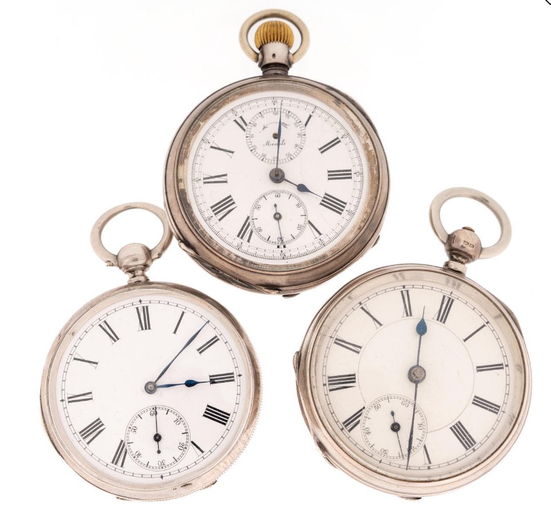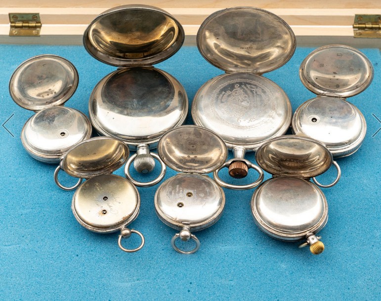 Collection of pocket watches in different sizes with cases made of silver & steel. Country of origin mainly England & France. 2pcs key pullers. Includes case and universal key. Diameter dimensions largest pocket watch: 75 mm Diameter dimensions minimum pocket watch: 45 mm. Condition Not functional tested, Minor scratches & wear, Personalized monograms present, No other remarks. 13979