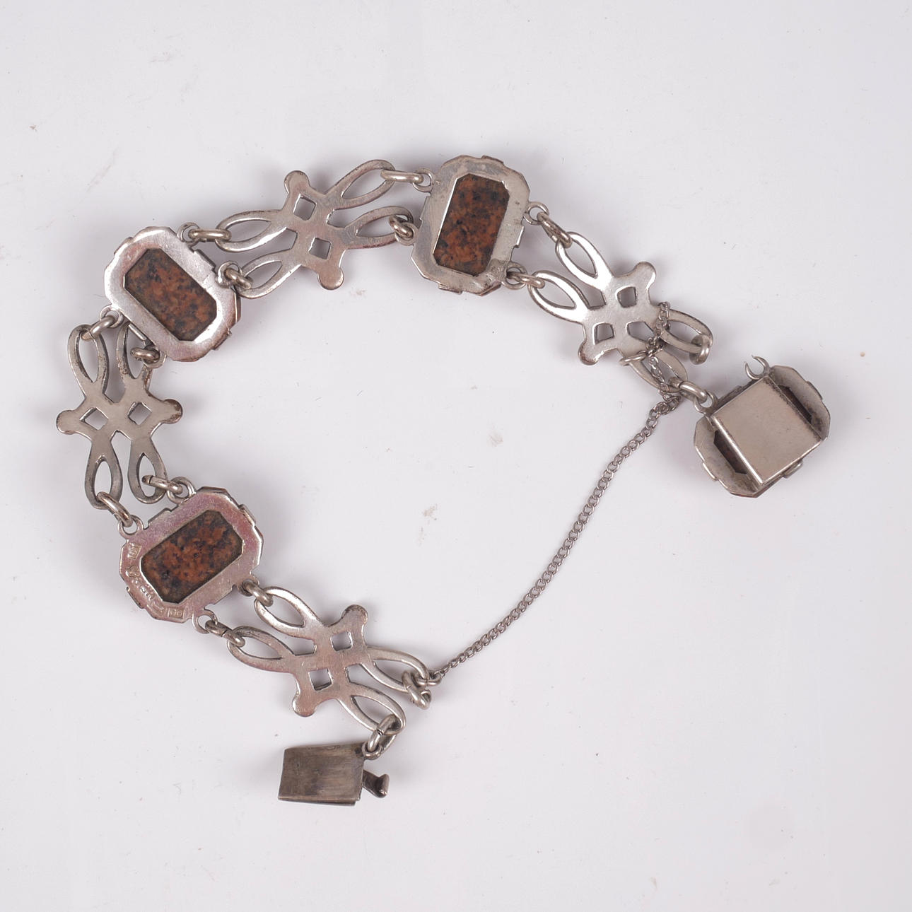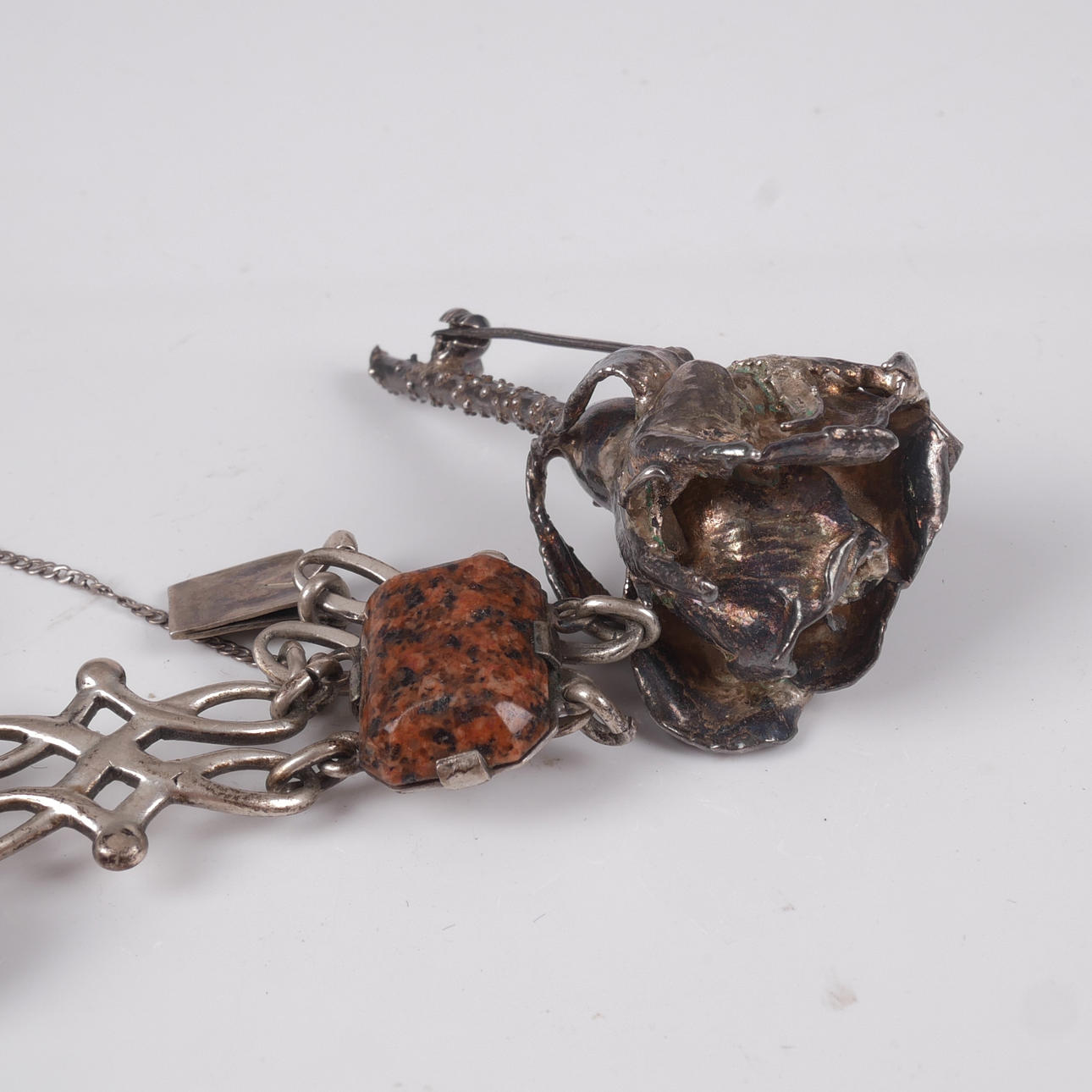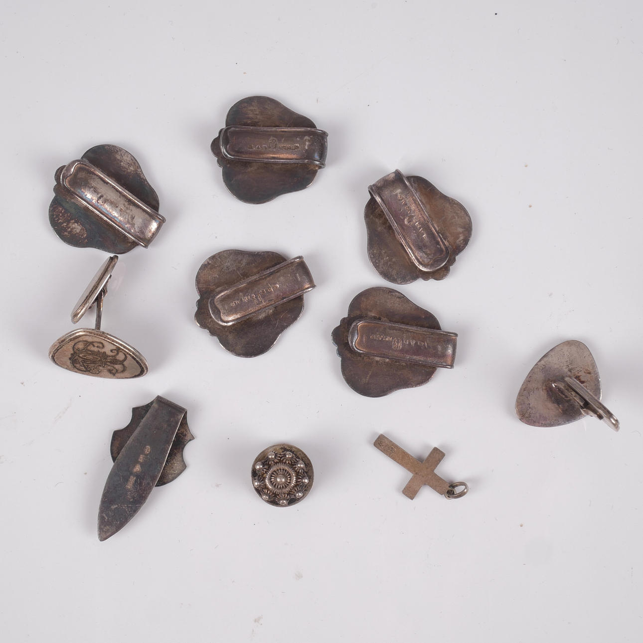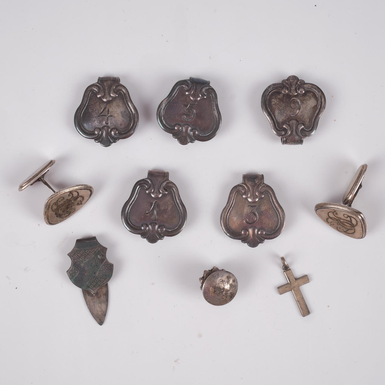 Markings 5 pcs for grogglas or similar nickel silver (Nos. 1, 3-6). Rose brooch “Flora Danica”. Cufflinks silver. Sprinkler glass with silver lid. Bracelet silver with stones. Pendant in the form of cross silver. Small prize trophy silver. Condition Usage and age-related wear. 14119