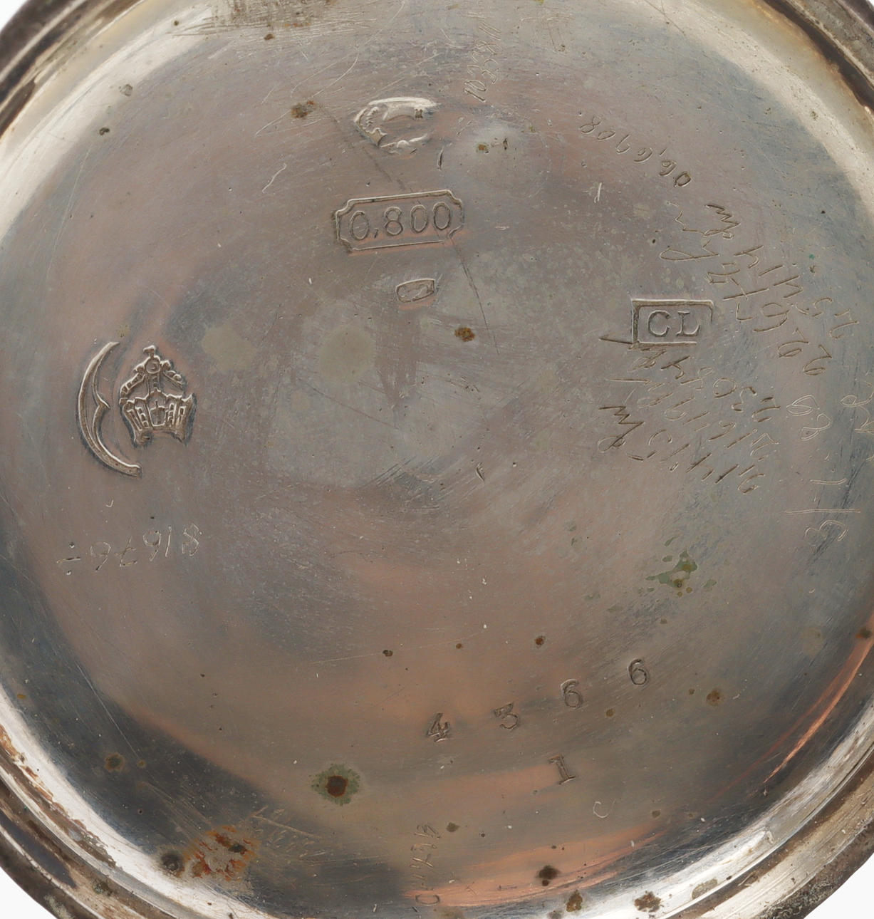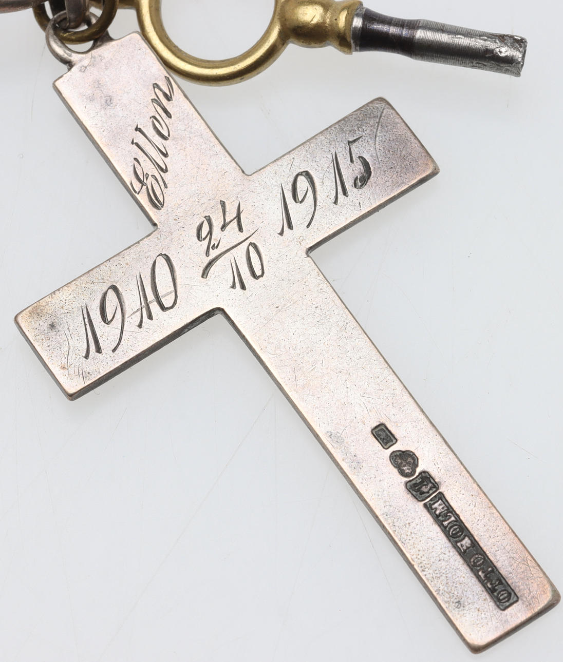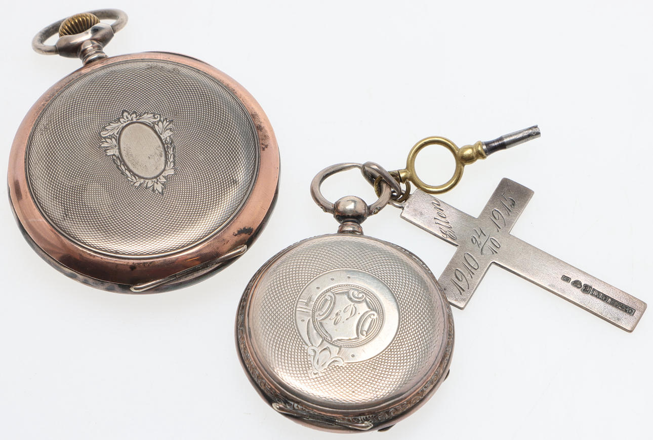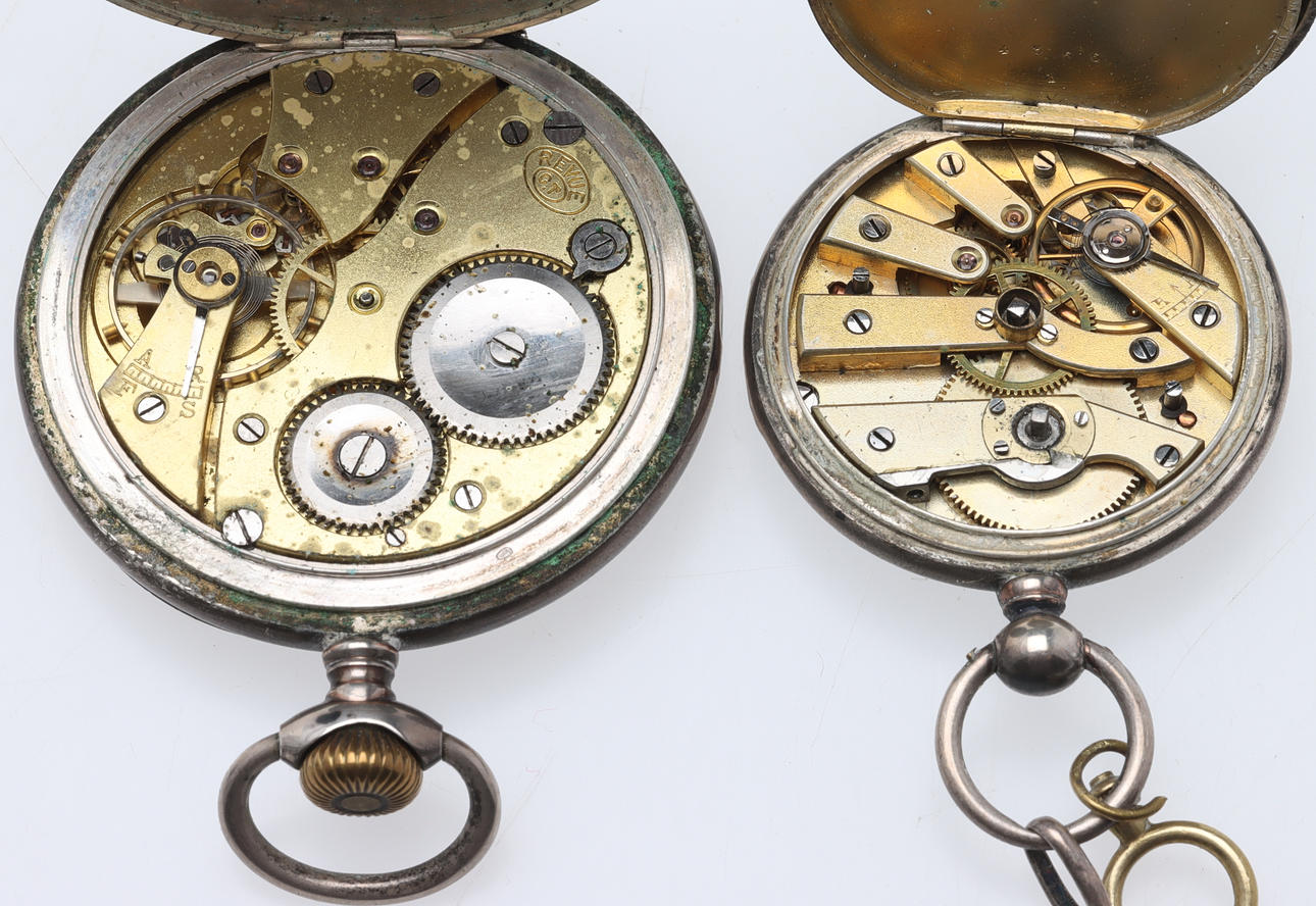 Pocket watch, with 24h dial, Revue, silver 800, diameter approx. 50,7 mm Pocket watch, key chain, with silver cross, silver 800, diameter approx. 38,7 mm Total gross weight approx. 129 grams. Condition Wear and age, engraving on silver crosses and case at minimum. Worked at the time of cataloging. No functional warranty is provided. 164007