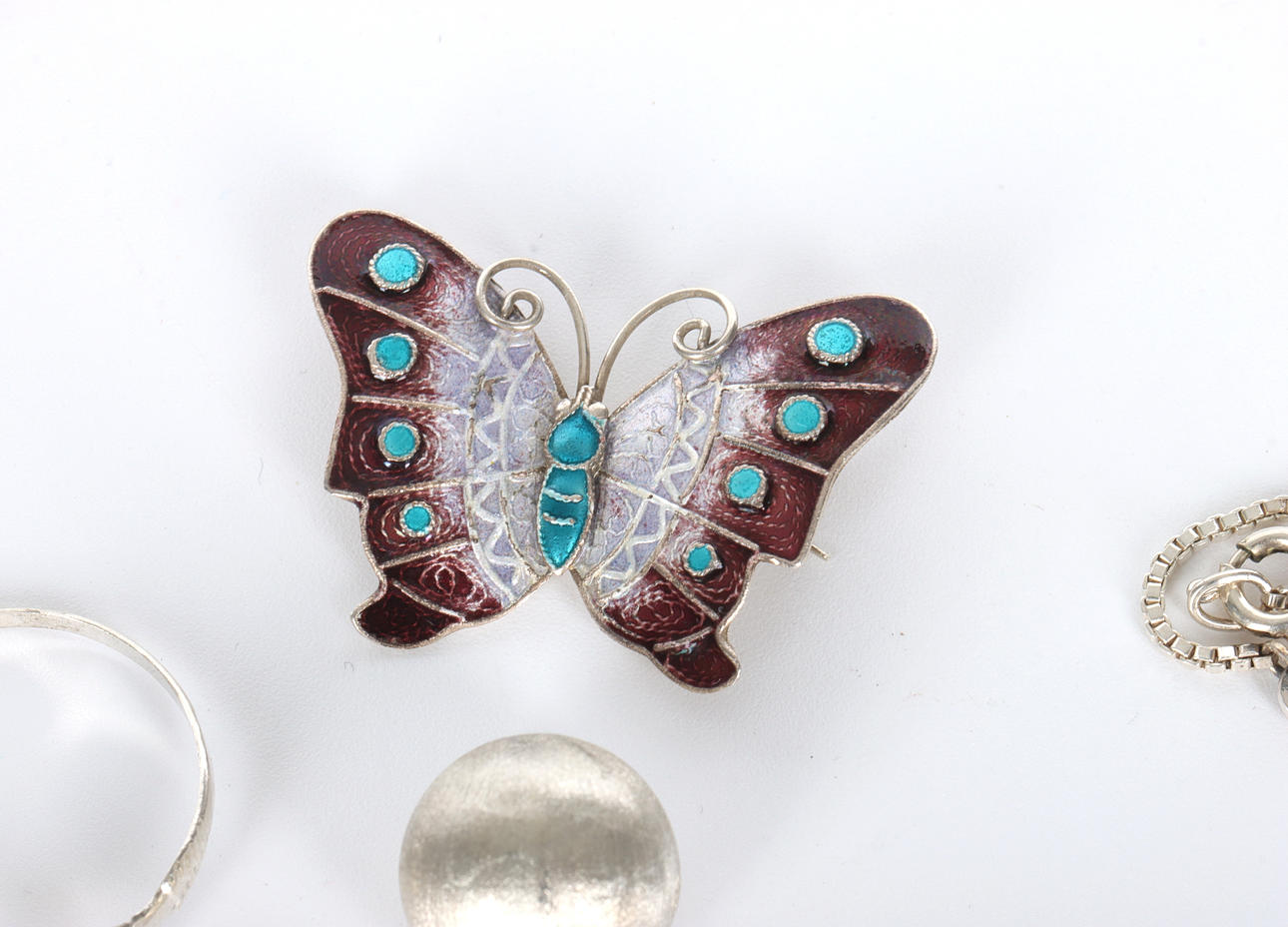 8 silver chains, in different chairs from approx. 30 - 43 cm. 5 silver rings, marked inter alia sterling, cat's foot, 925. Largest ring diameter 2.4 cm. 1 piece bracelet in silver, nameplate, stamped 925. Length approx. 14,5 cm 2 brooches, stamped with cat's foot and S925. Length of brooch with cross about 3.6 cm. 9 silver pendant, stamped cat feet, 925, B10 (1976), 835, 830. Large silver ball diameter approx. 2.5 cm. 6 id badges in silver, stamped with cat's foot, 830, 925S. Maximum dimensions 3 x 2,2 cm. Condition Abrasions, dents. Engraving occurs. 71270