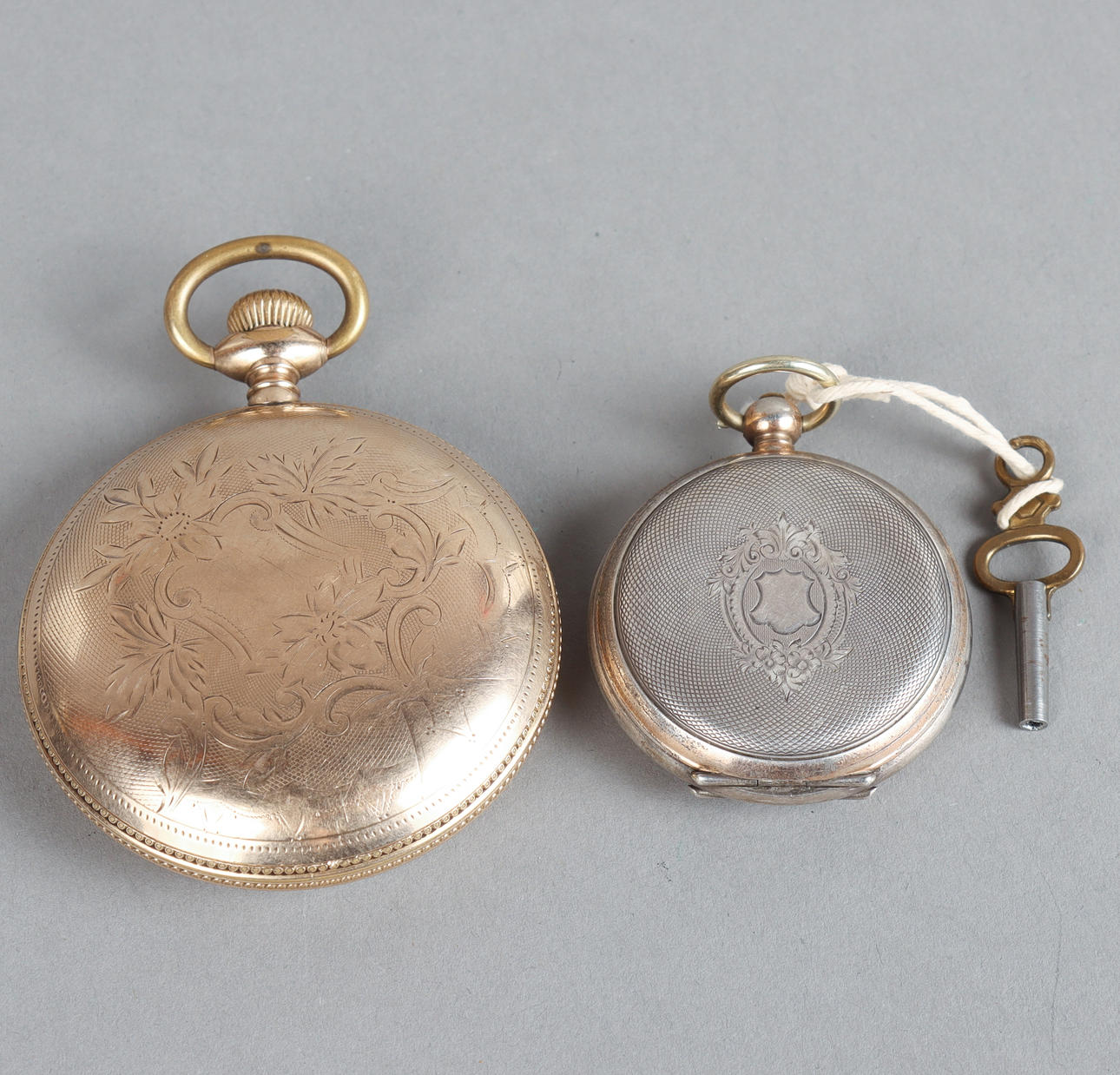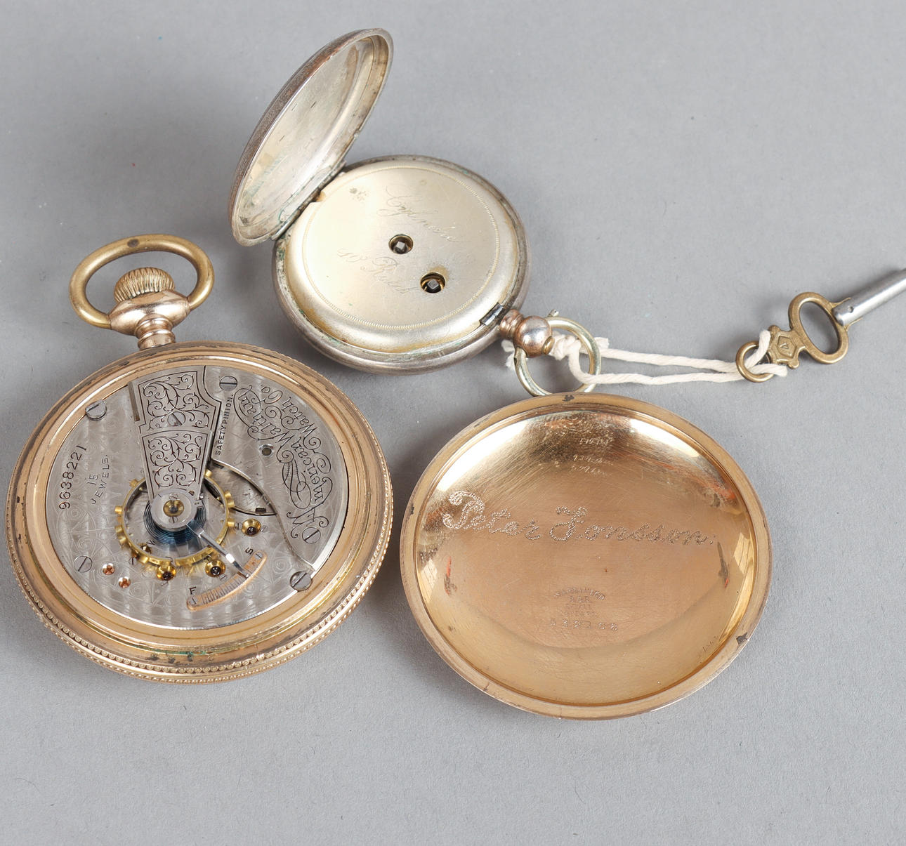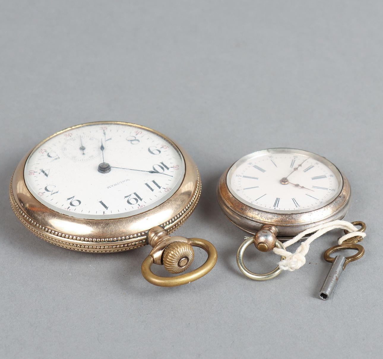 Waltham American Watch Co, yellow metal case, diameter 55 mm. “Grandmother watch” unknown manufacturer, case in silver, key features, diameter 39 mm. Condition Normal wear and tear. Waltham was functioning at the time of cataloguing. The less non-functional test. No functional warranty is provided. 29845