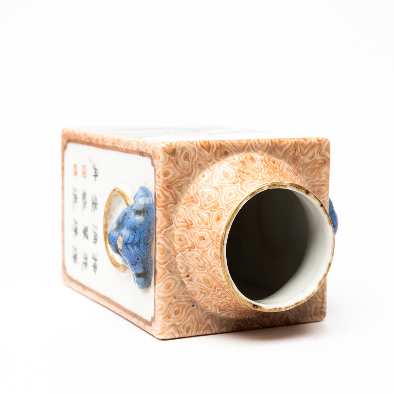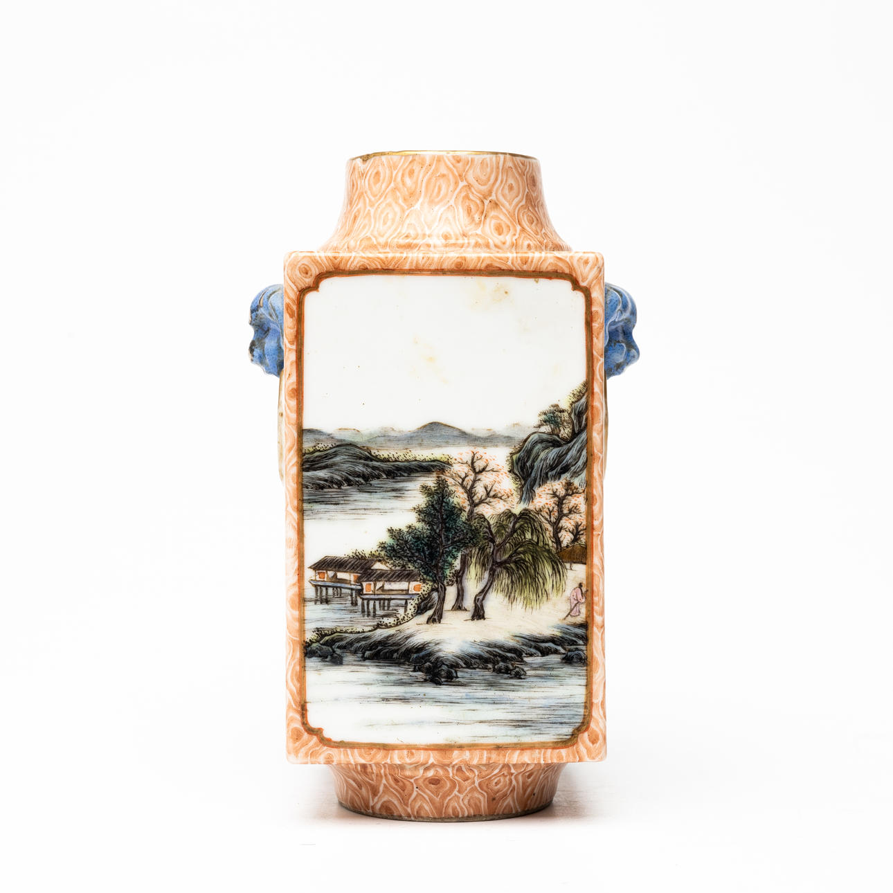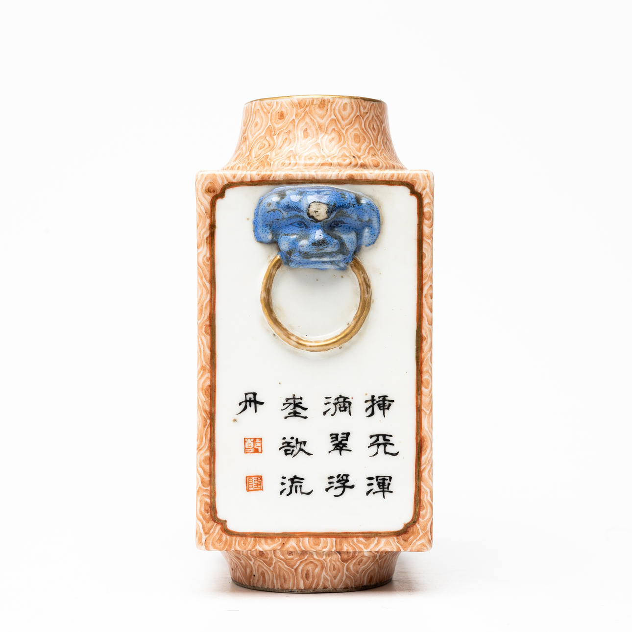 Bronze shaped, river landscape decoration with poem, ring-biting lejin mascarons. Seal. Height 12.8 cm. Provenance; Assistant Professor Rune Rydquist's collection (1914-2003). Condition Wear, surface dirt.