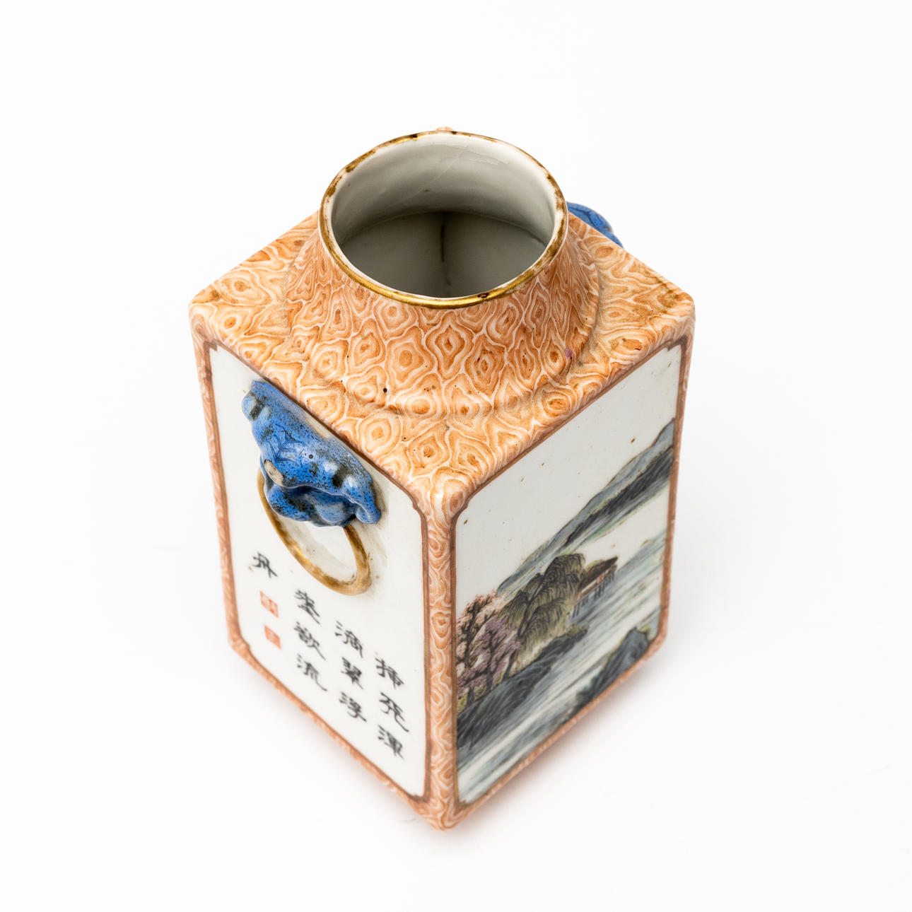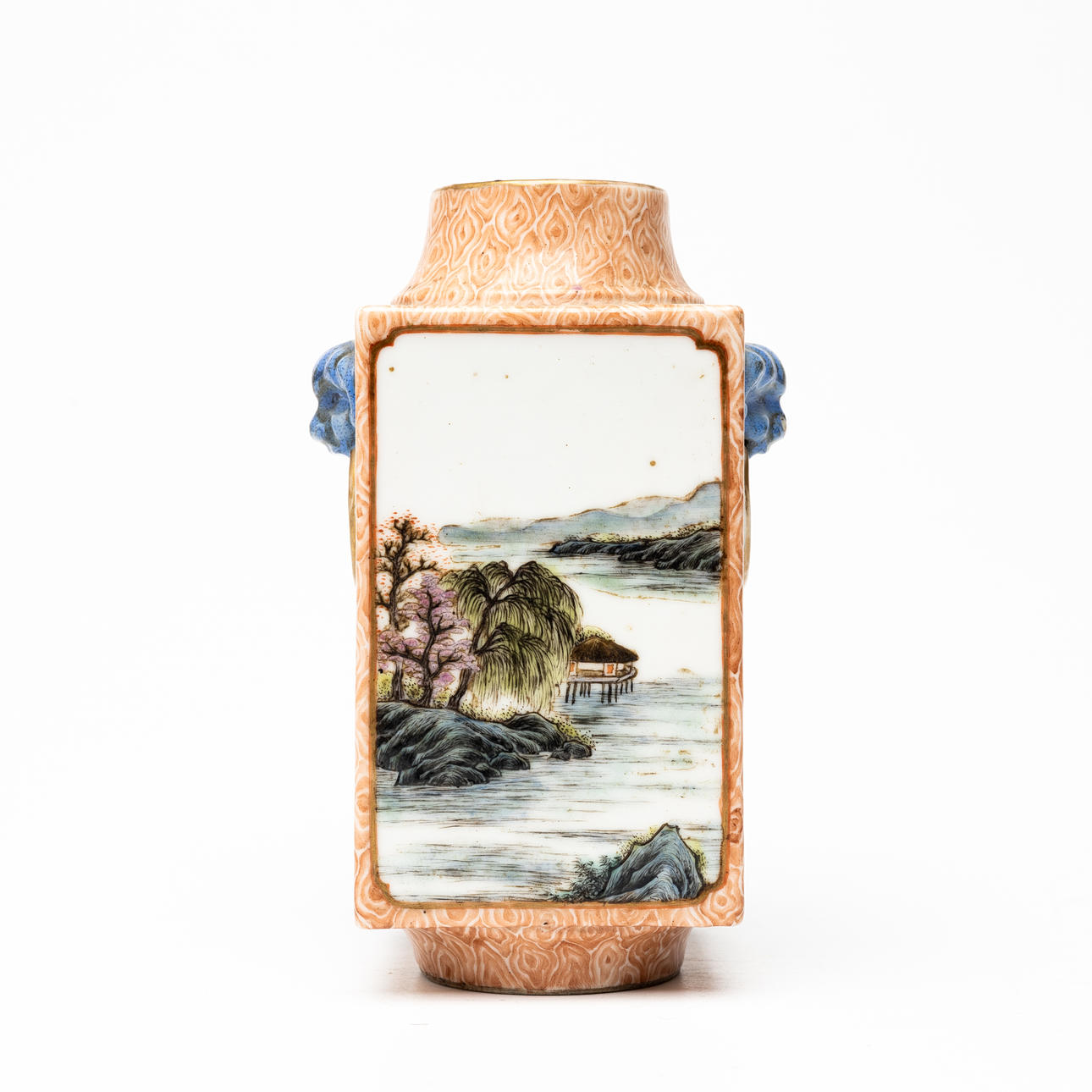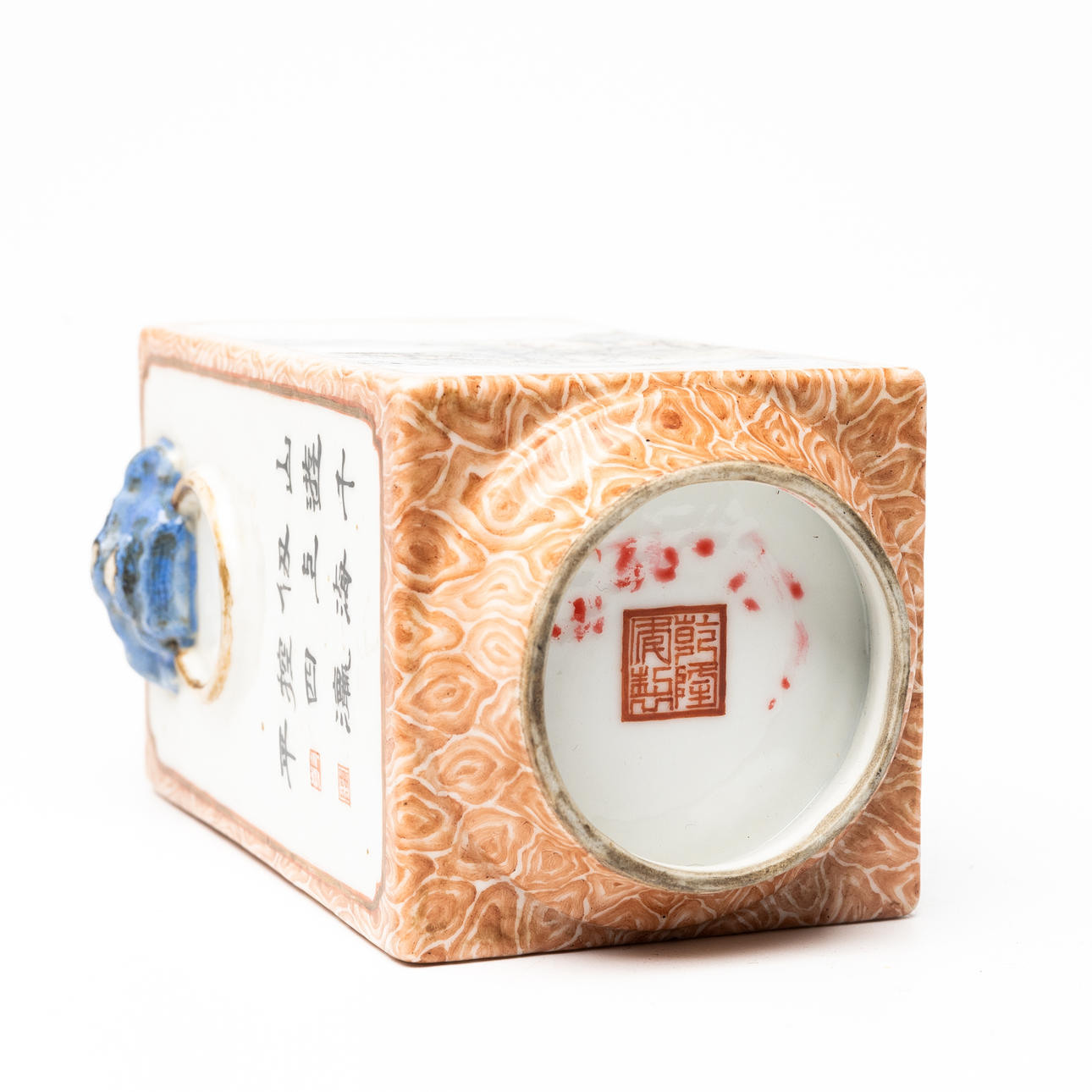 Bronze shaped, river landscape decoration with poem, ring-biting lejin mascarons. Seal. Height 12.8 cm. Provenance; Assistant Professor Rune Rydquist's collection (1914-2003). Condition Wear, surface dirt.
