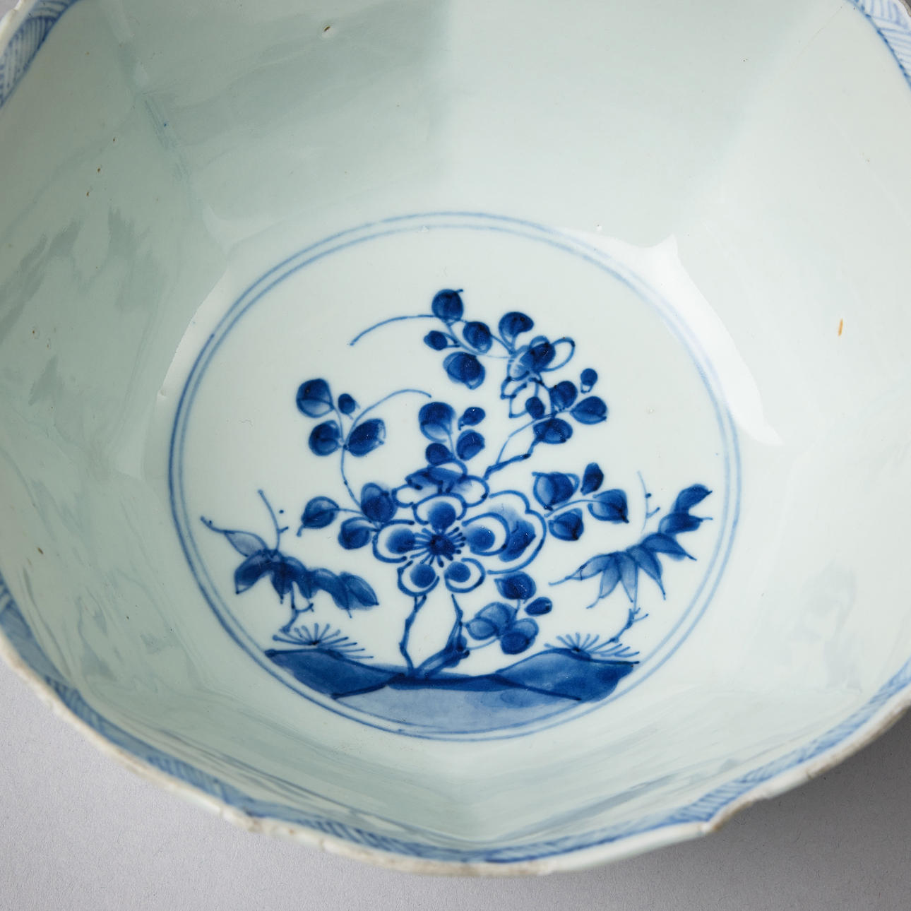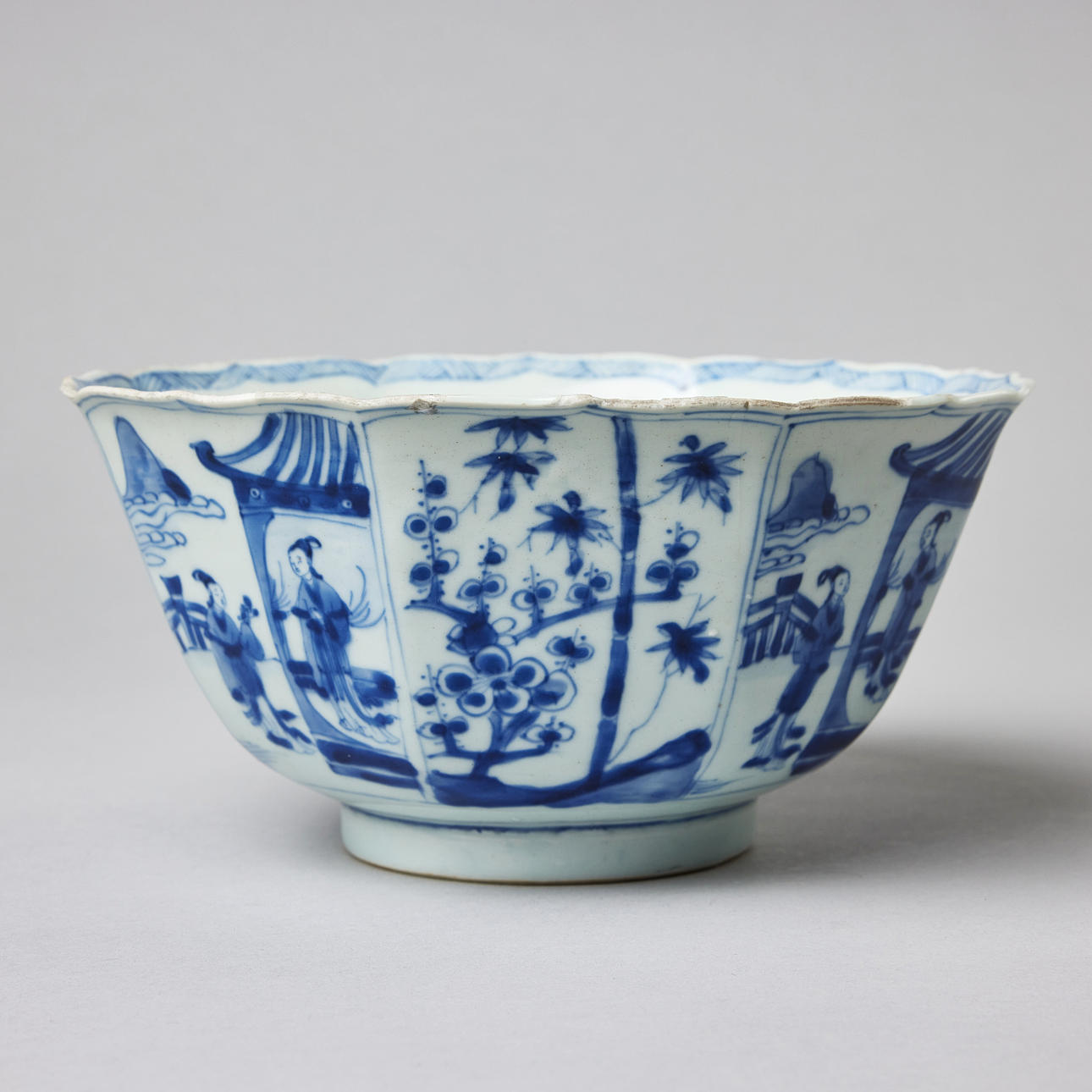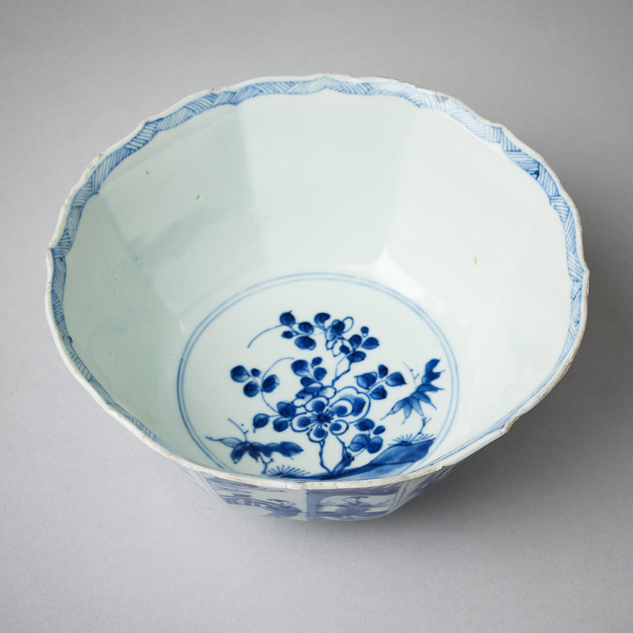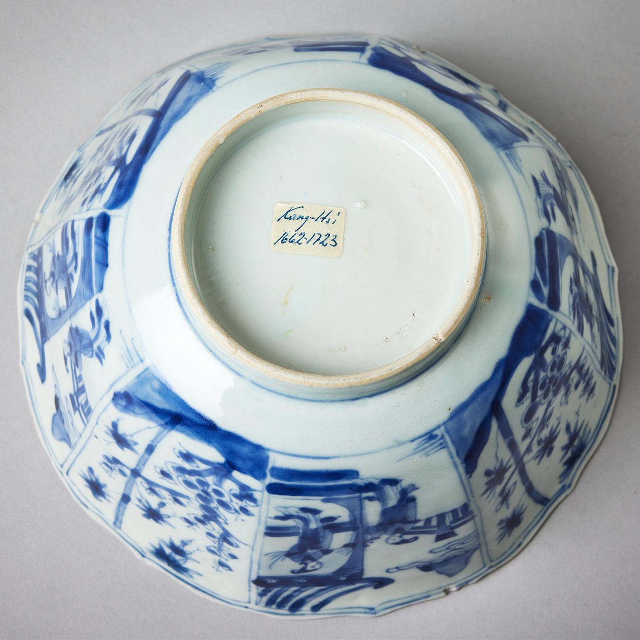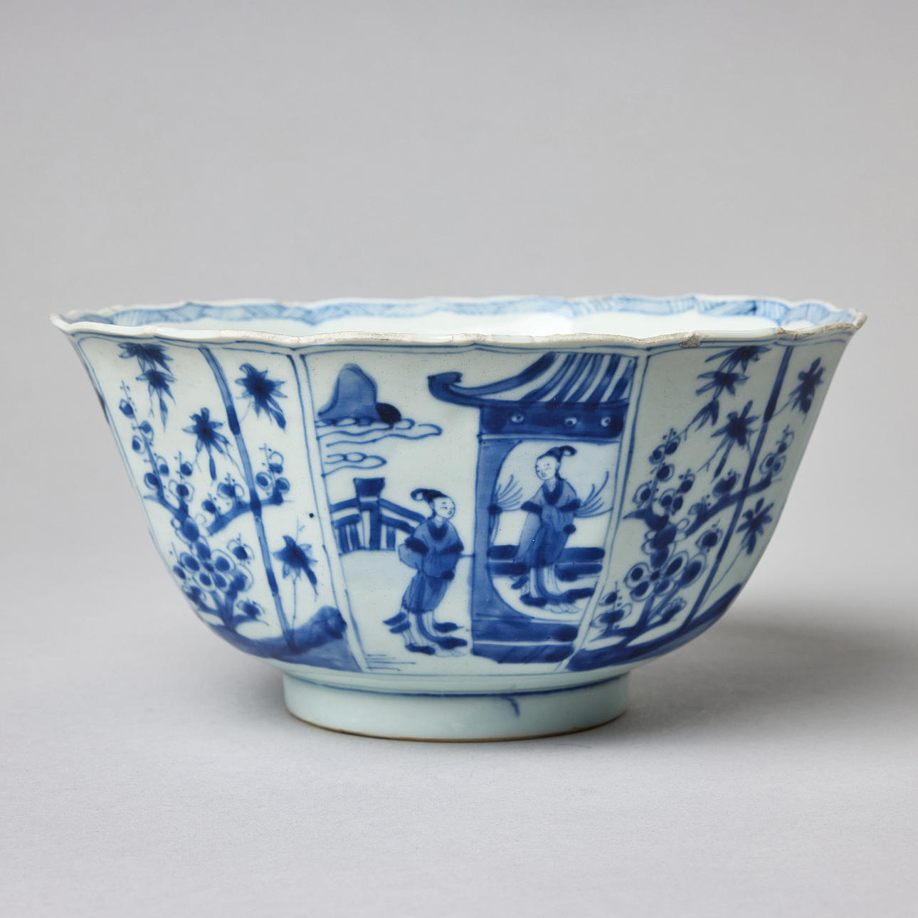 Kangxi period (1662-1722) Panels decorated with alternating prunus and bamboo, and two ladies by the river. Diameter c. 21 cm. Condition Wear and firing defects. Nicks, loss of glaze and a crack at the rim. 251094