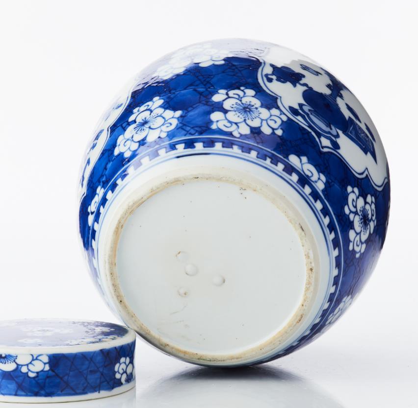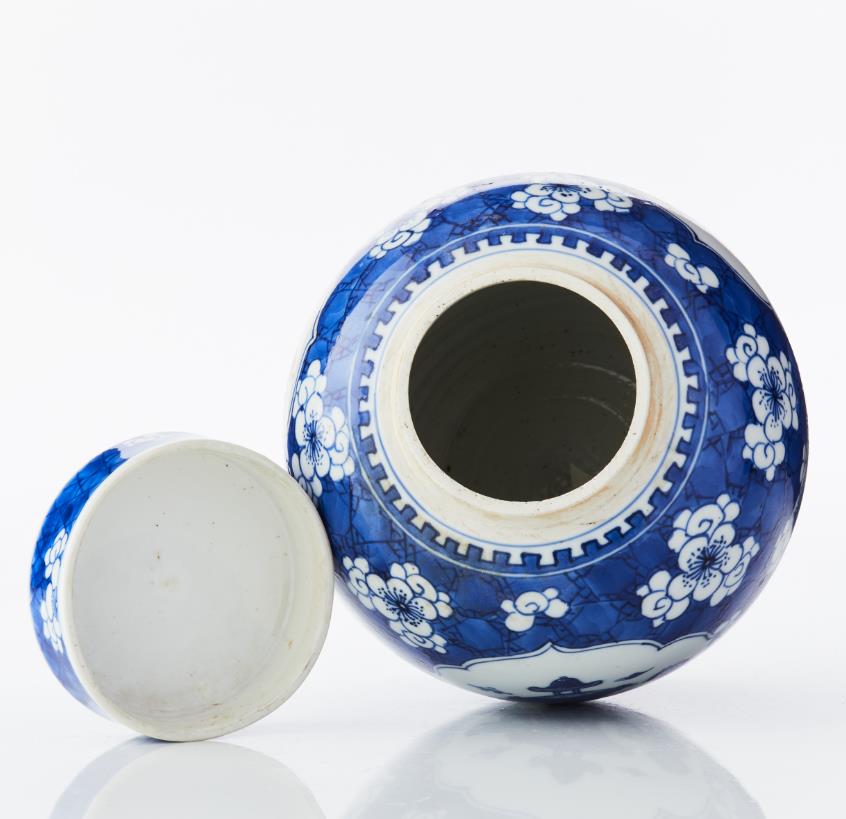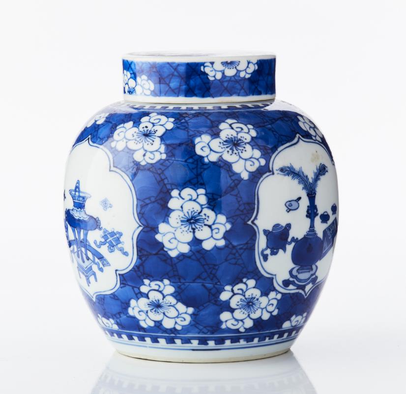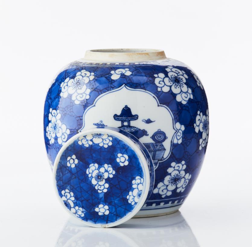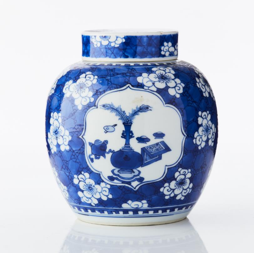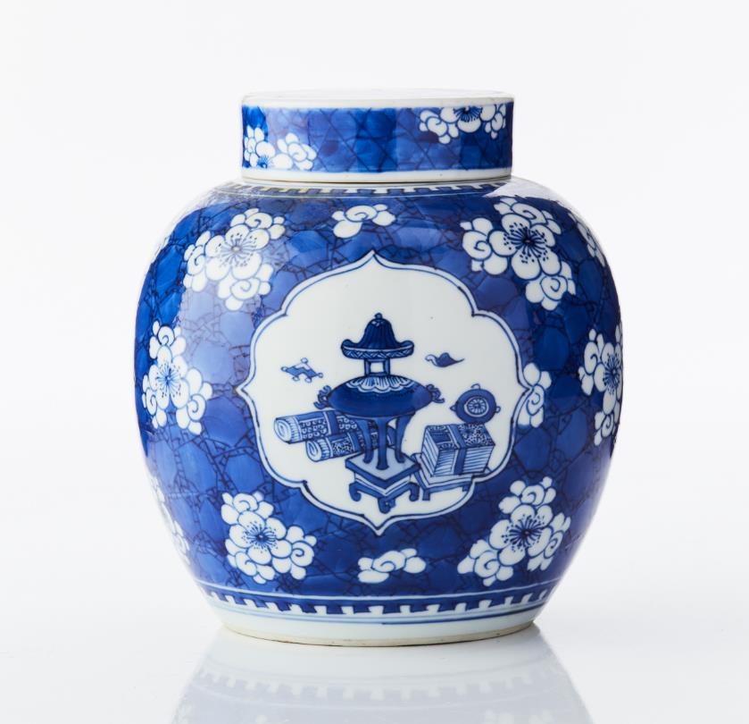 A Blue and White Porcelain Ginger Jar and Cover The rounded sides rising from a flat circular base to a tapering shoulder, decorated in bright shades of underglaze blue with three finely outlined quatrefoil panels enclosing the ’hundred antiques’ motif of auspicious objects, including a ruyi sceptre, a book, a scroll, a peacock feather and censers, all reserved on a ’cracked ice and prunus’ ground between crenel borders encircling the foot and neck, the cover similarly decorated, the base glazed. Period: 18/19th century. Height: 19 cm.