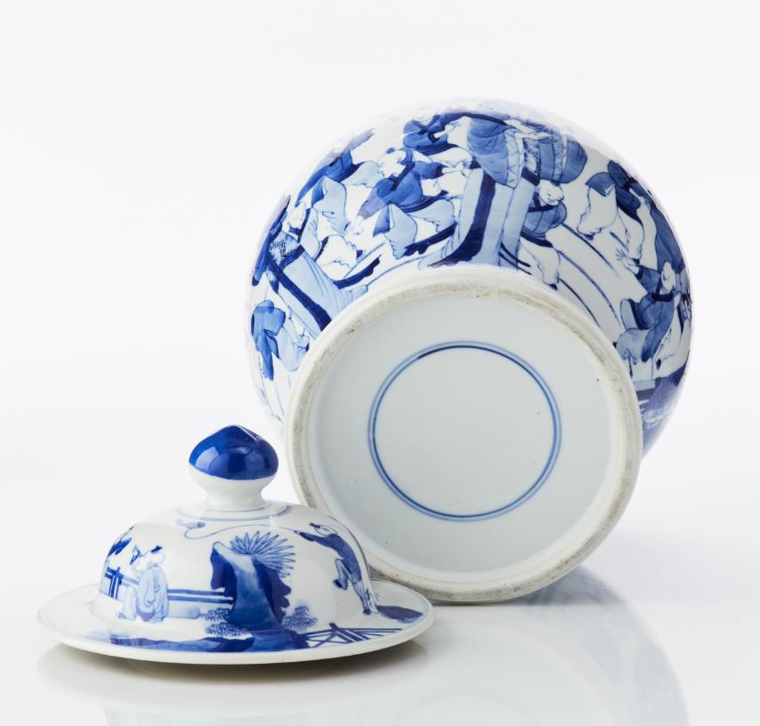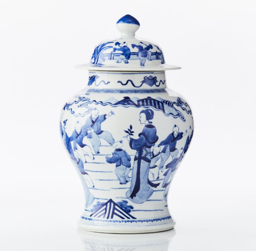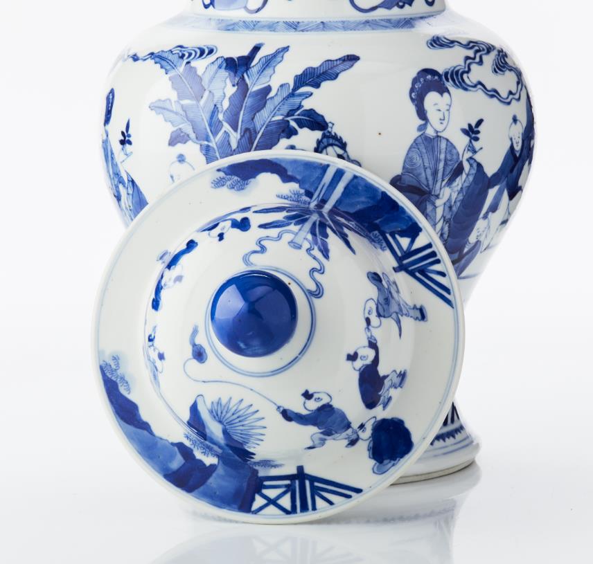A Blue and White Porcelain ’Ladies and Children’ Vase and Cover Of inverted baluster form, rising from a spreading foot to a tapering shoulder set with a straight neck, painted in shades of underglaze blue with a terraced garden landscape scene of children playing among elegant ladies by plantain and rockwork, swirling clouds overhead, the neck with an array of beribboned emblems, the glazed base with a double circle, the domed cover with a wide rim and surmounted by a knob finial, further decorated with playing boys. Period: 19th century. Height: 34 cm.