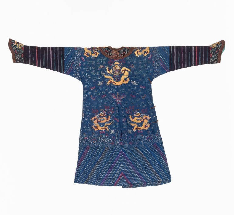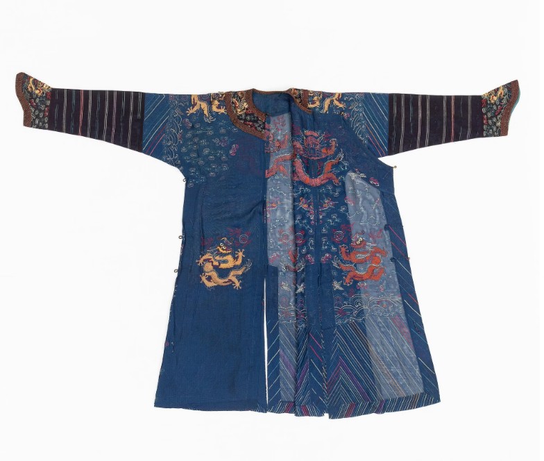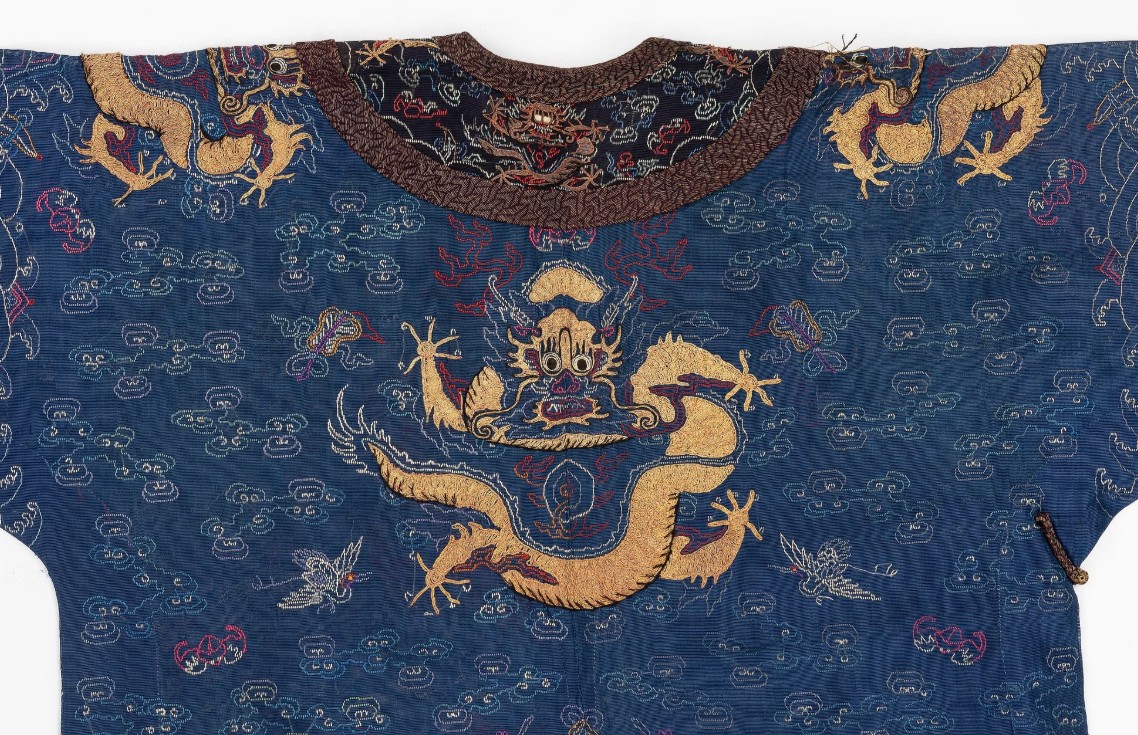 The blue gauze is worked in couched gold thread and counted stitch with the prescribed nine five-clawed dragons, two on the front and back shown clutching flaming pearls while the others are shown reaching for the pearl, all amidst lingzhi-shaped clouds interspersed with 'precious objects' and bats. The whole is set above a terrestrial diagram and lishui stripe separated by further clouds, and with similar decoration repeated on the border, collar and cuffs. Height back 130 cm. Length arm to arm 200 cm. Wear. Loose threads.