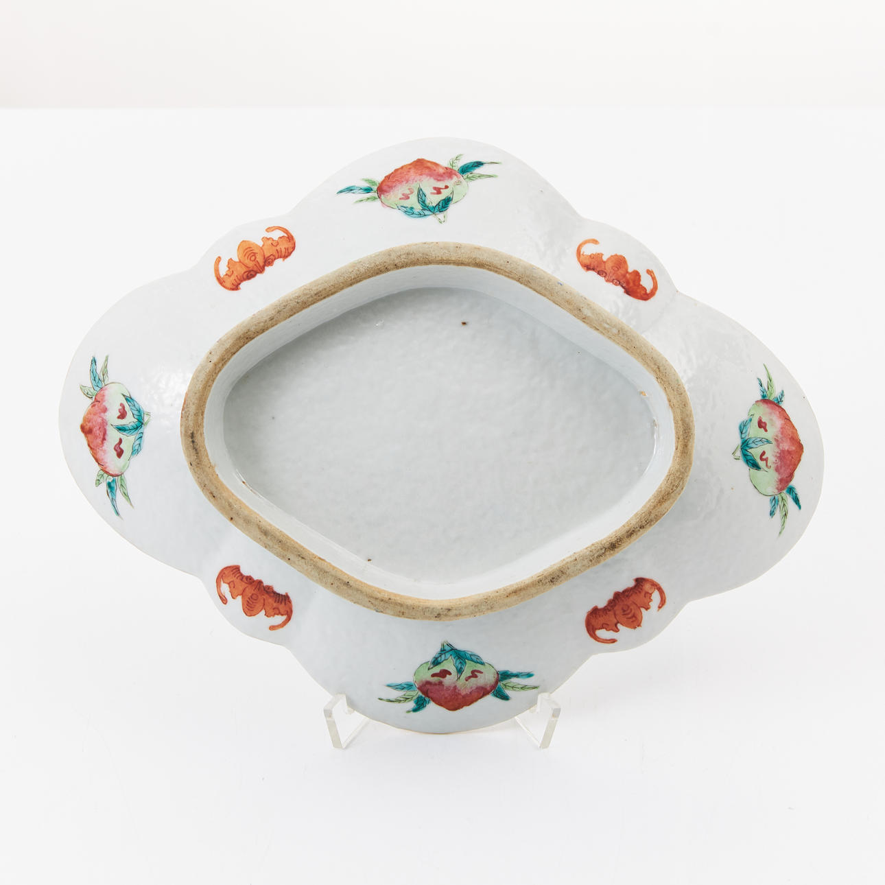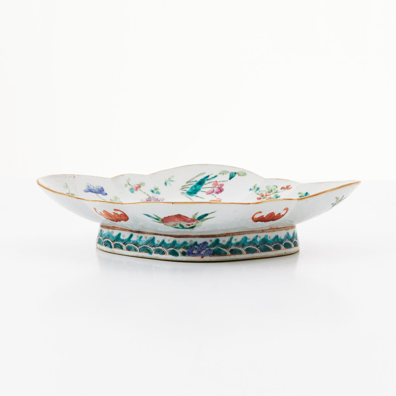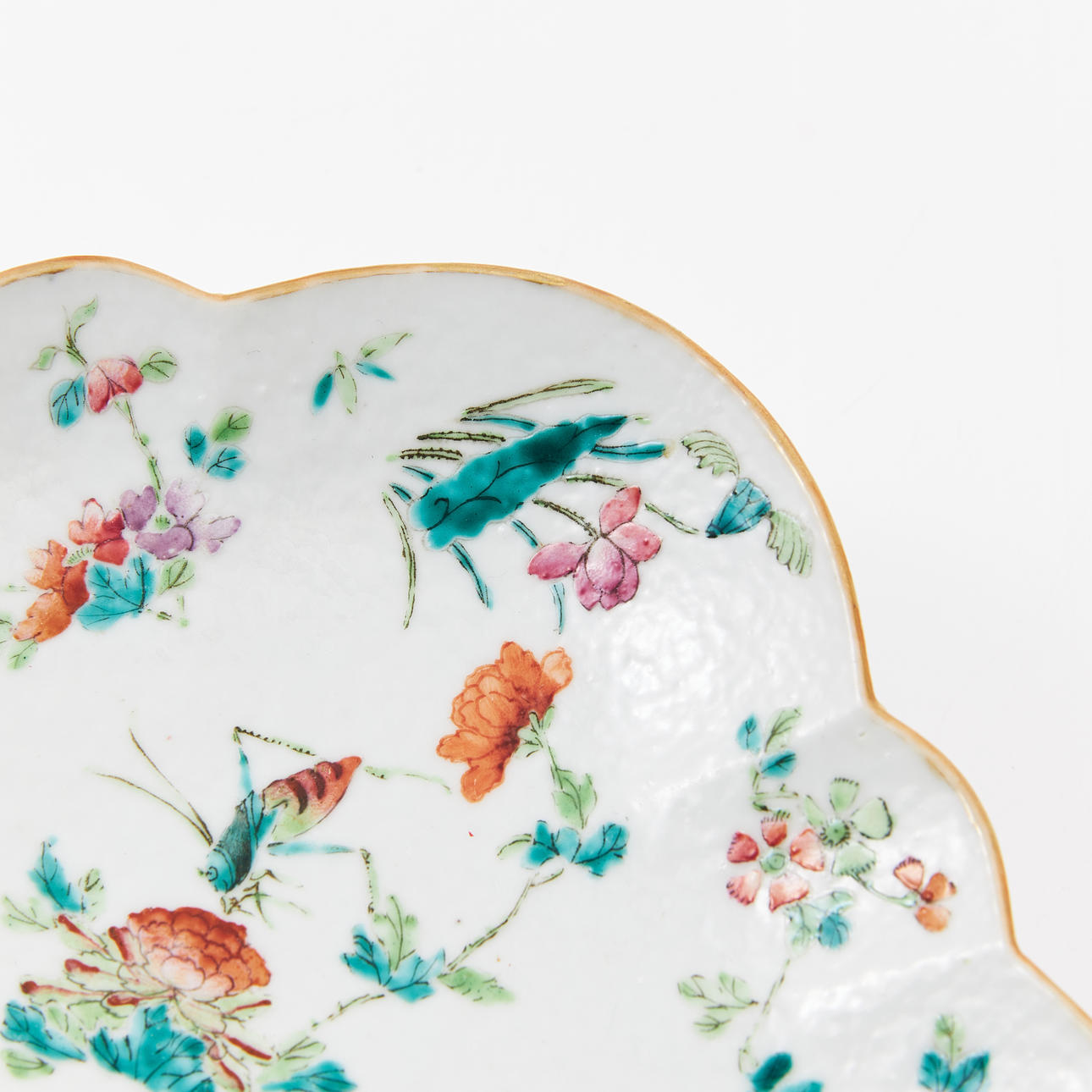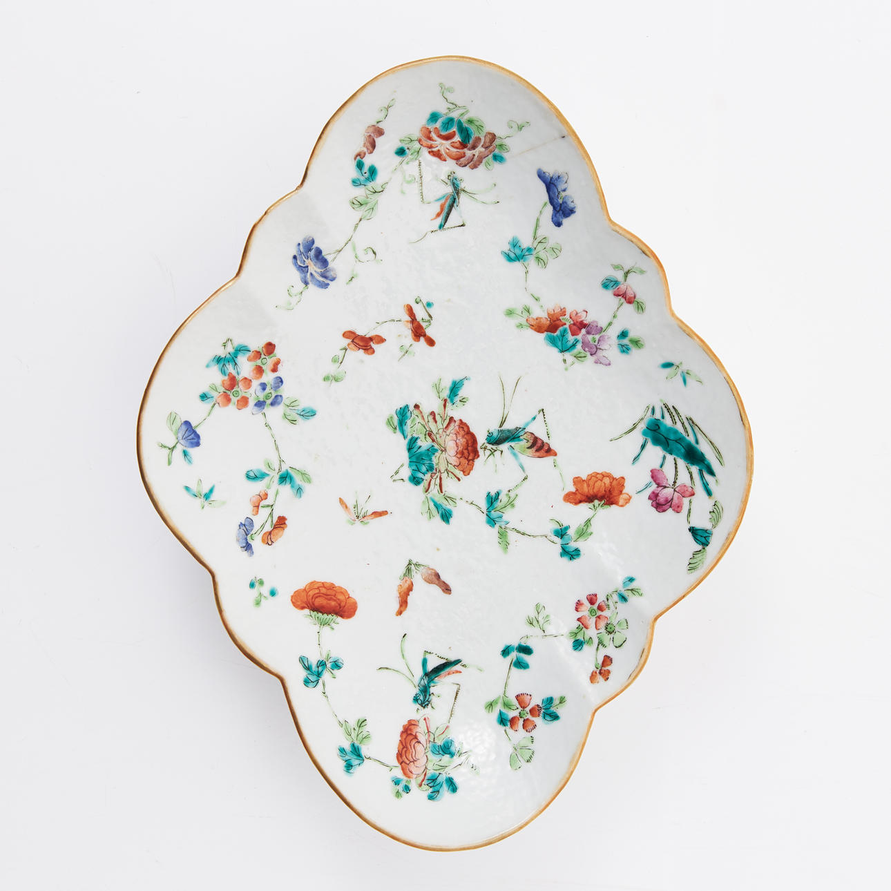 Quatrefoil, contoured edge, decoration of flowers and insects in enamel colours, iron oxide and sepia. Height approx. 6, 27x21 cm. Condition Glaze crack, minor wear.
