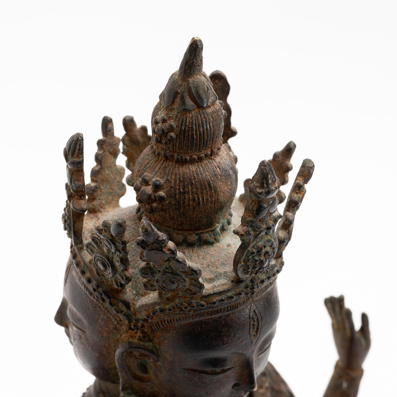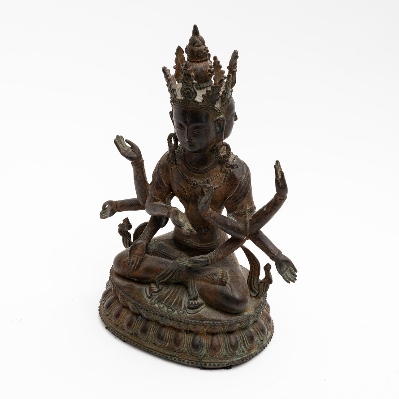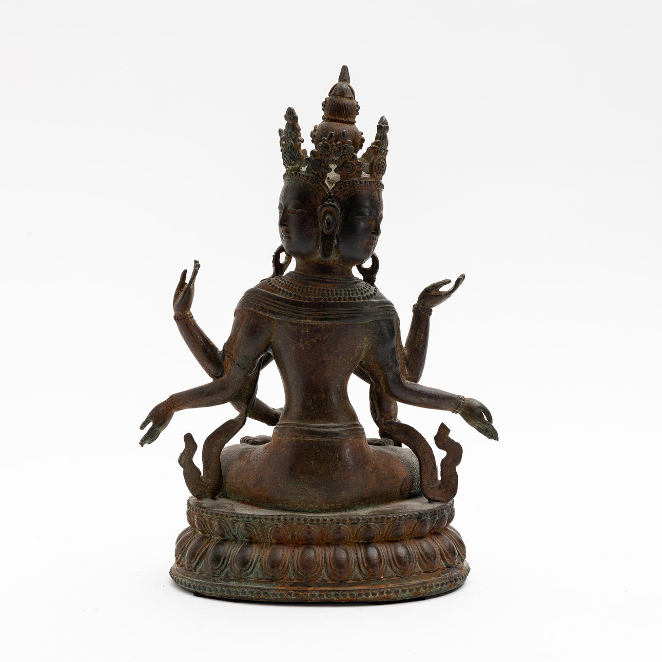 Drawn with three faces and eight arms, seated on double lotus throne. Height 29 cm. Condition Wear, some fingertips broken off. 308694