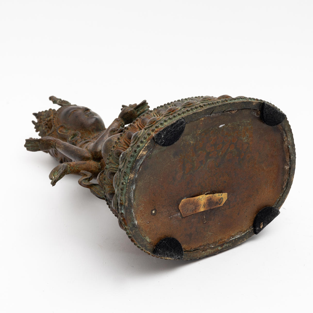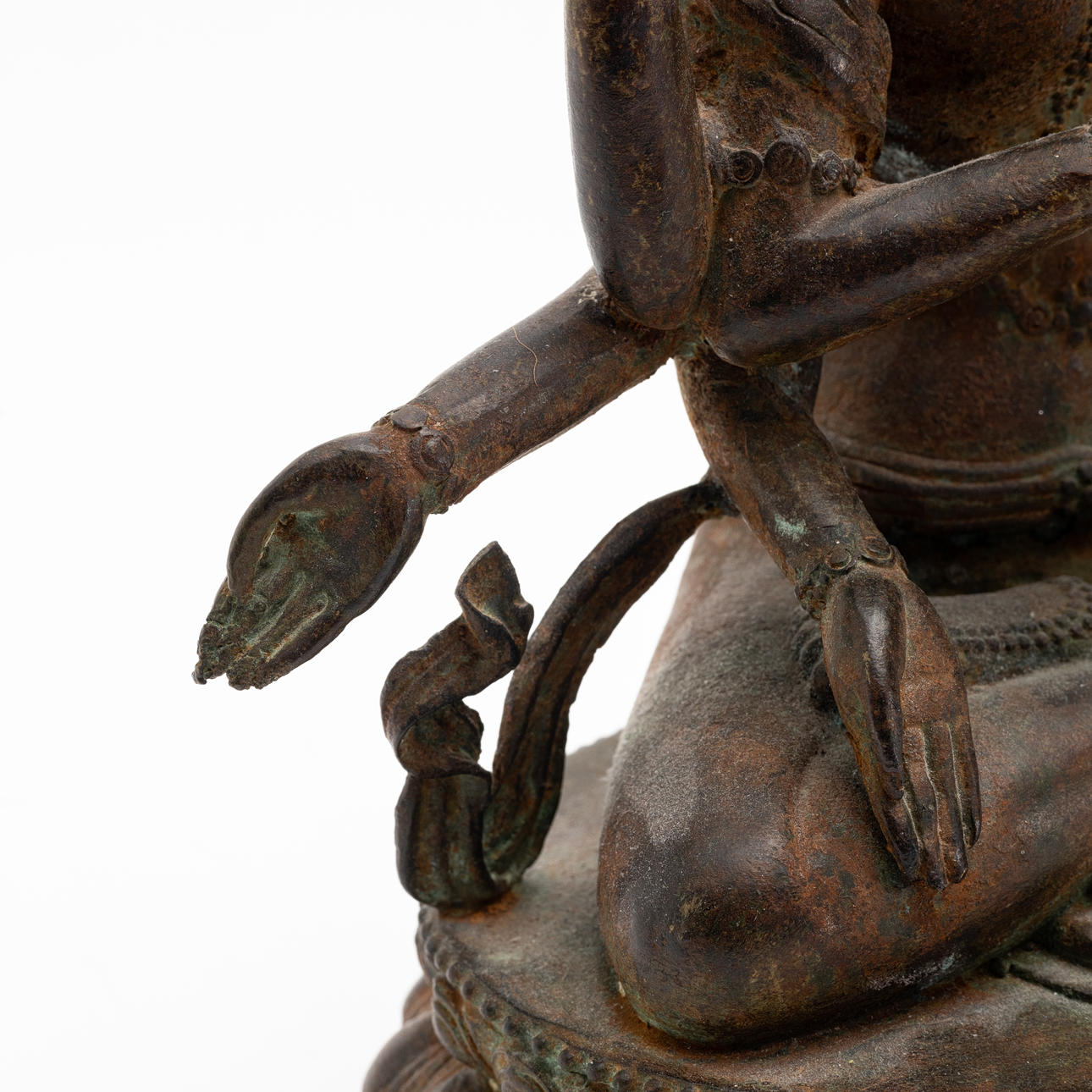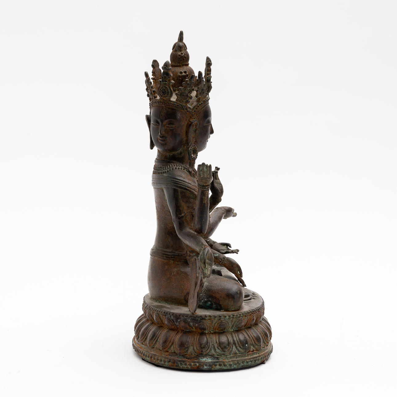 Drawn with three faces and eight arms, seated on double lotus throne. Height 29 cm. Condition Wear, some fingertips broken off. 308694