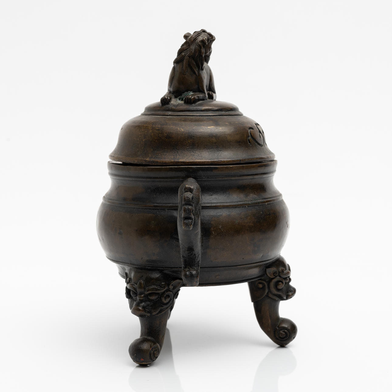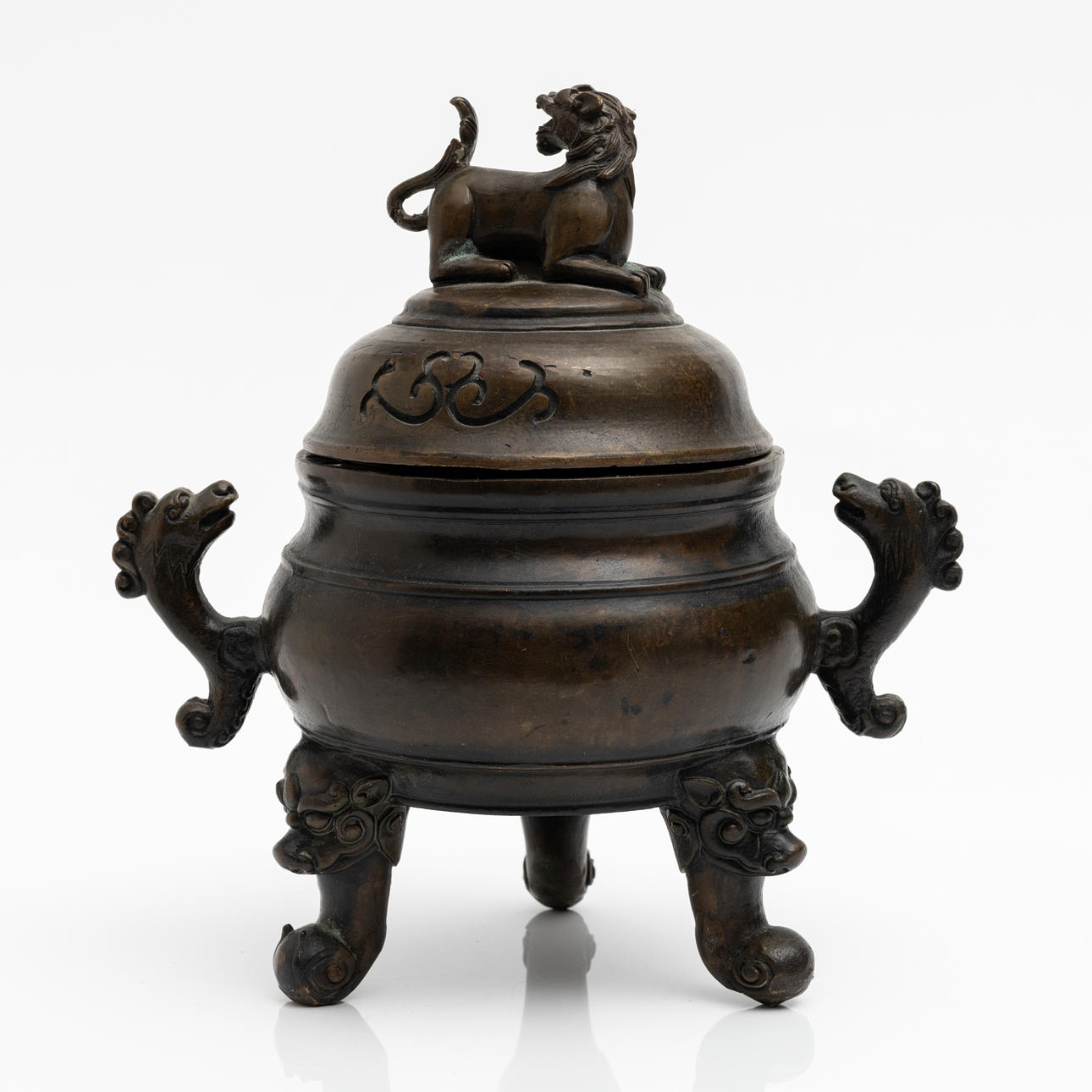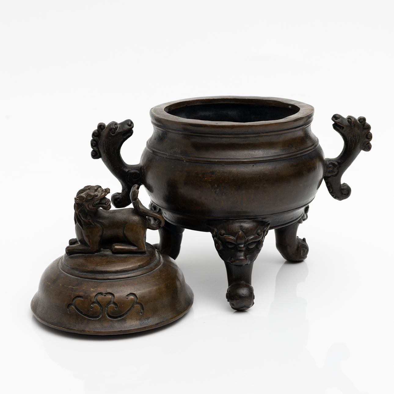 Relief decor of lion mascarons, perforated cover with temple lion. Height approx. 22 cm. Condition Age-induced wear and tear. 319927