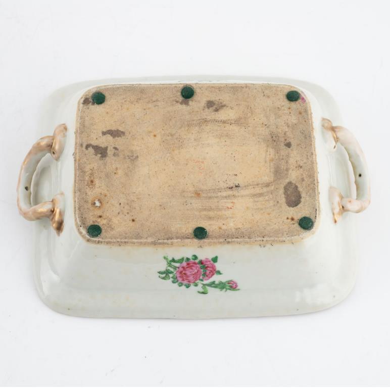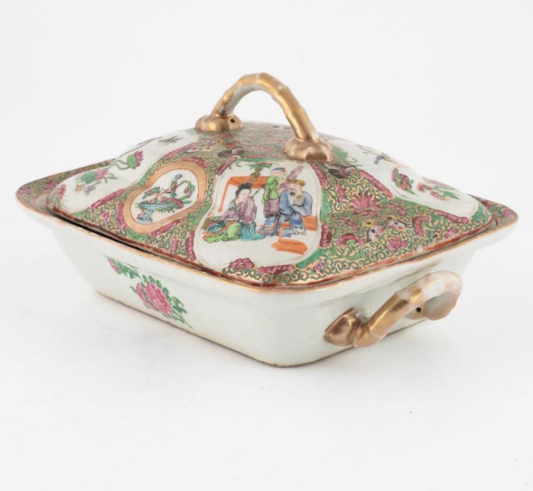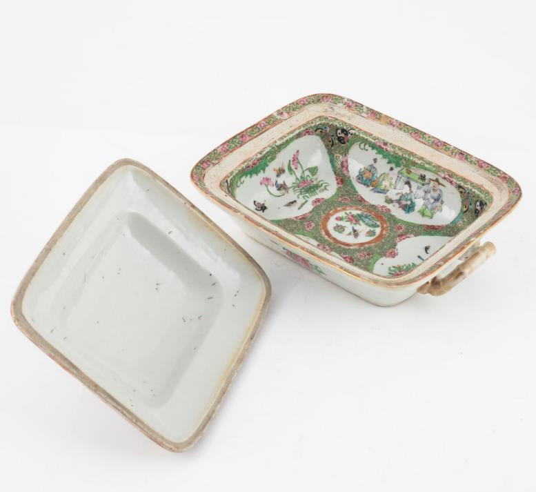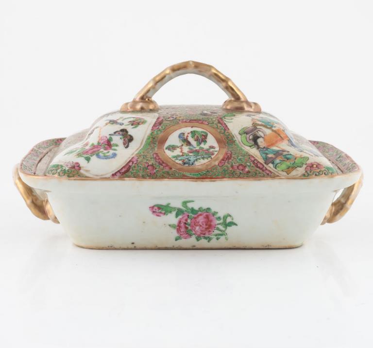 Richly decorated with butterflies, birds, flowers and figurescenes. Handles in the shape of bamboo. Height 15, length 27 cm. Firing flaws. Minor insignificant chips.