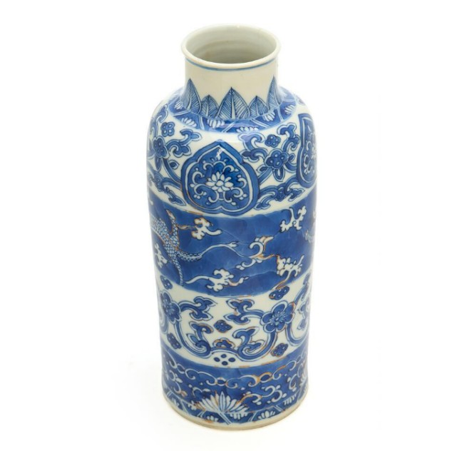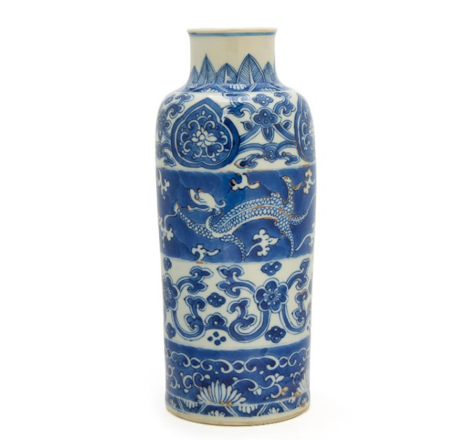 A Chinese blue and white 'chilong' cylincdical vase