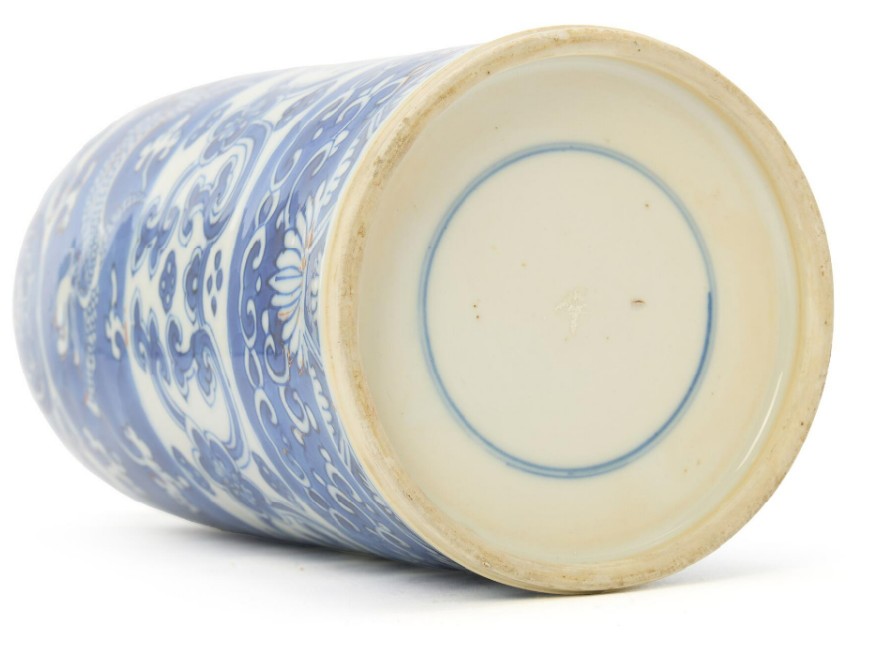 A Chinese blue and white 'chilong' cylincdical vase divided into horizontal bands with chilongs in cloud formations and stylized designs, Qing dynasty, Kangxi period. H. 26 cm.