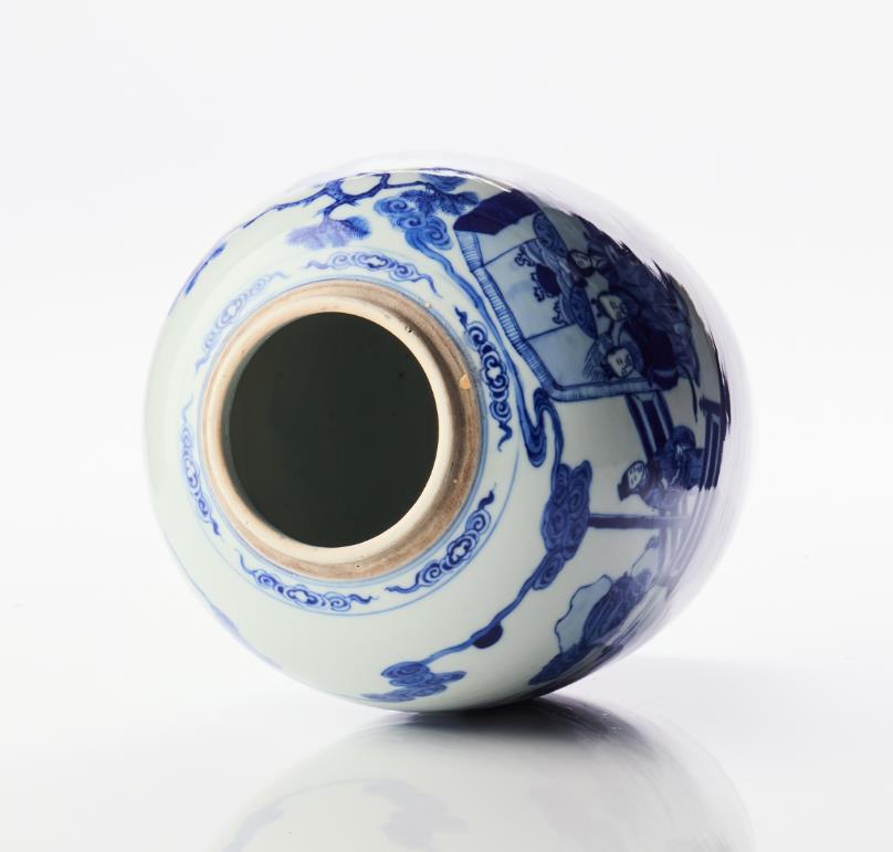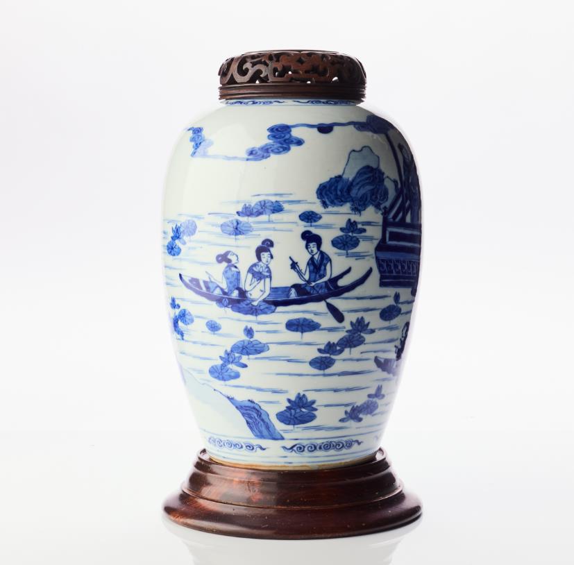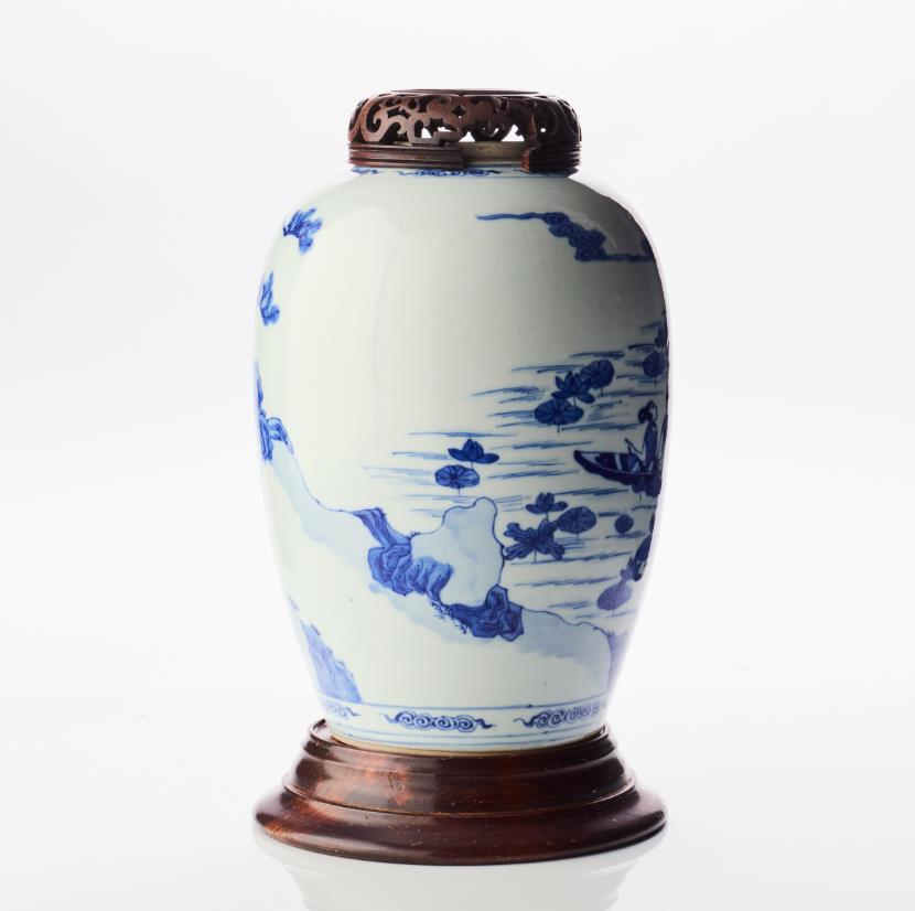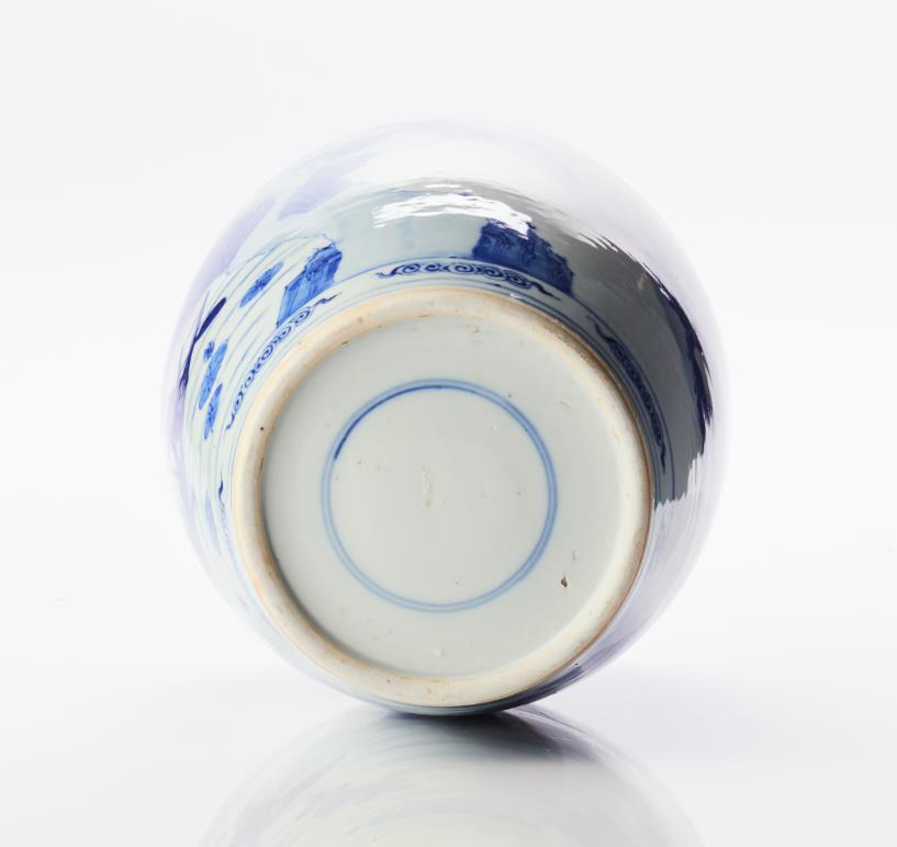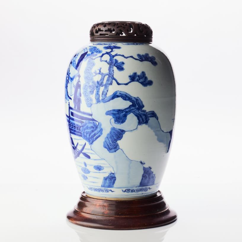A Chinese Blue and White Porcelain 'Figural' Jar Later wooden stand and cover. Period: 19th century. Height: 30.5 cm. Konditionsrapport Minor wear. A bow-shaped defect/crack to the rim. Scratched social security number to the underside. The wooden cover damaged.