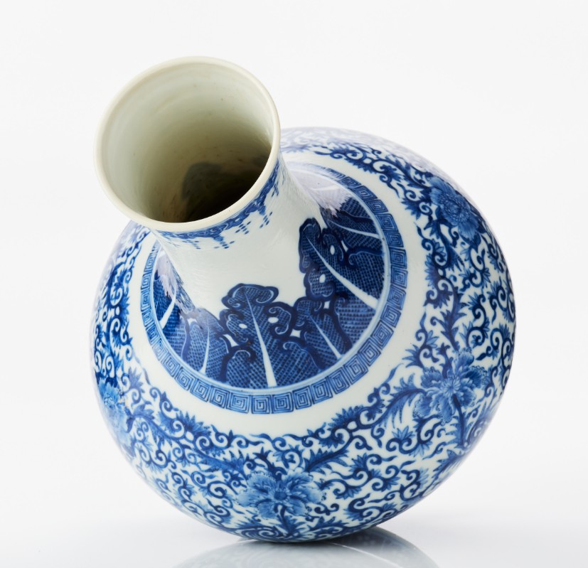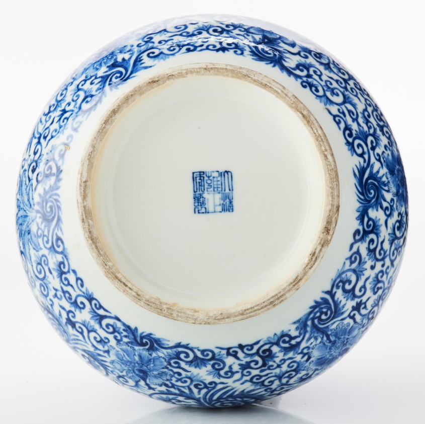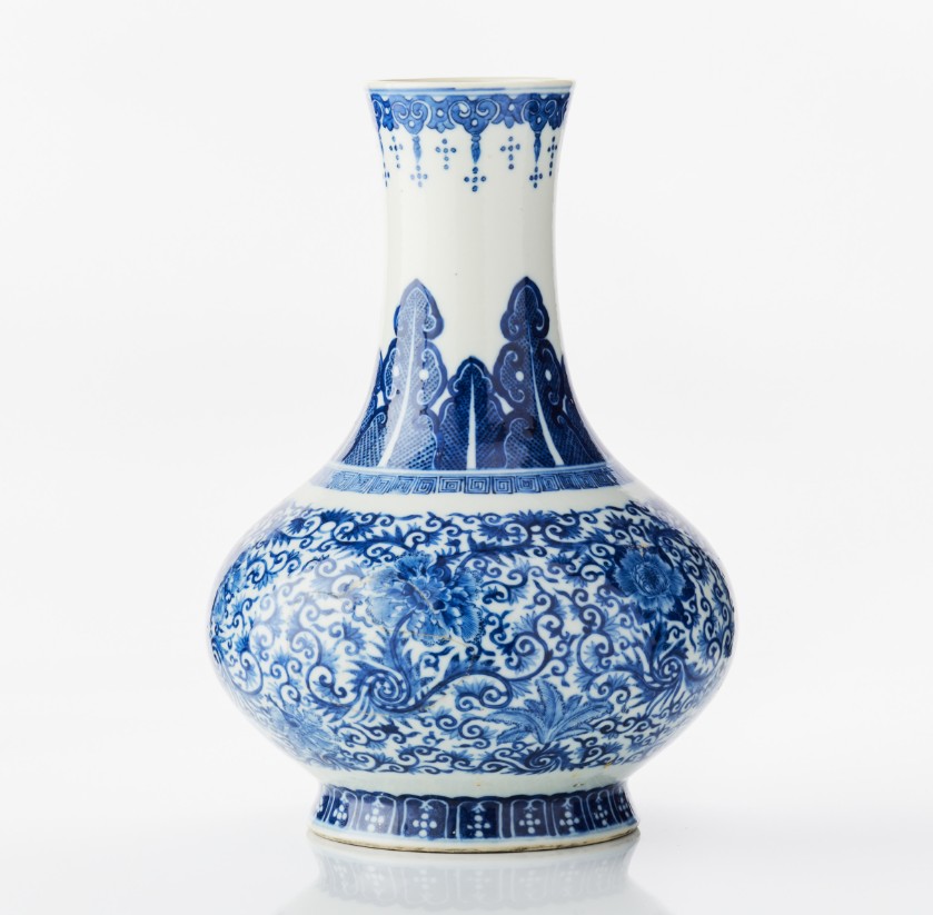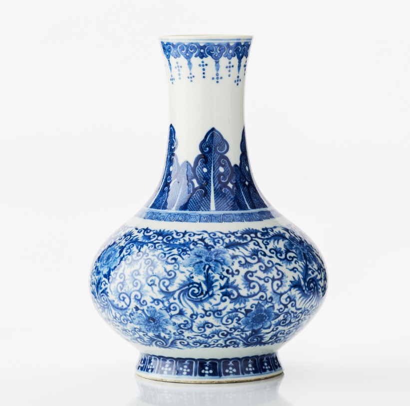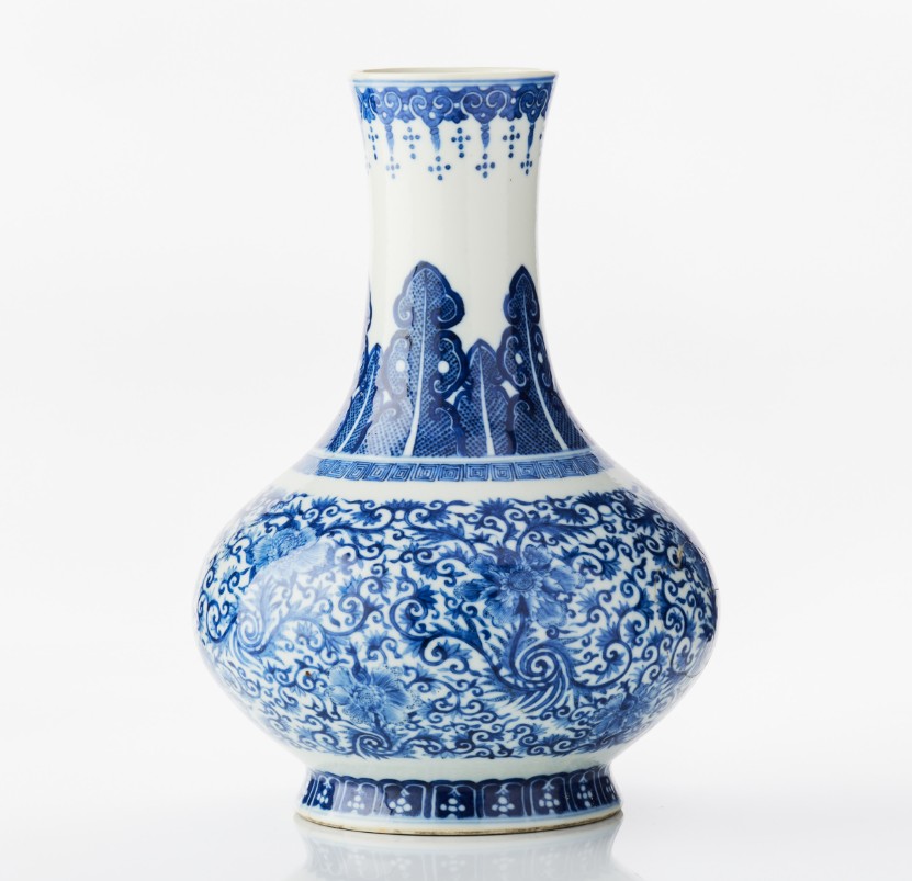 A Chinese Blue and White Porcelain 'Floral' Vase The recessed base with a seal mark of Yongzheng. Period: 19th century. Height: 34 cm. Konditionsrapport Wear. An area of the body damaged and glued, circa 9 cm long. A firing defect to the foot.