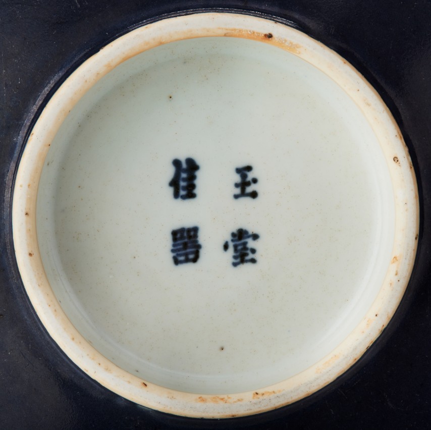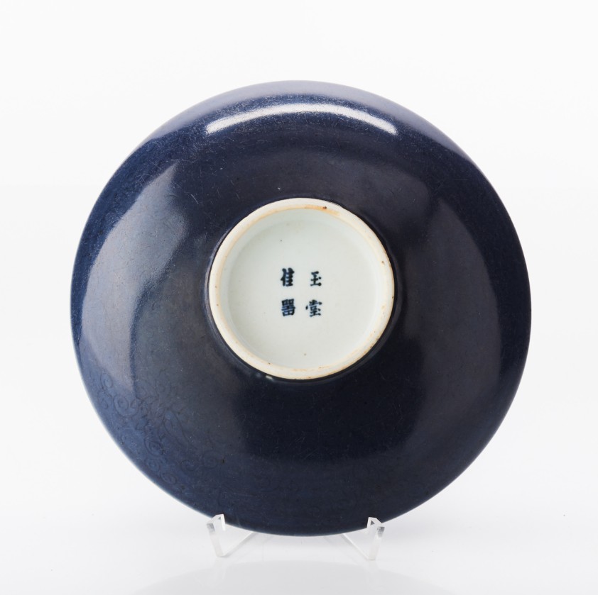 A Chinese Blue-Glazed Porcelain Dish Of circular form, the shallow sides supported on a short foot, incised with scrolling peonies to the front and reverse, covered overall in a deep blue glaze, a collector’s mark incised to the front, the glaze stopping short of the foot rim revealing the buff porcelain body, the recessed base with a four-character mark reading Yu Tang Jia Qi (Elegant Vessel of the Jade Hall) in underglaze-blue. Period: 16th/17th century. Diameter: 21.5 cm. Proveniens From the collection of Ragnar Sachs (1902-1973). Thence by descent.