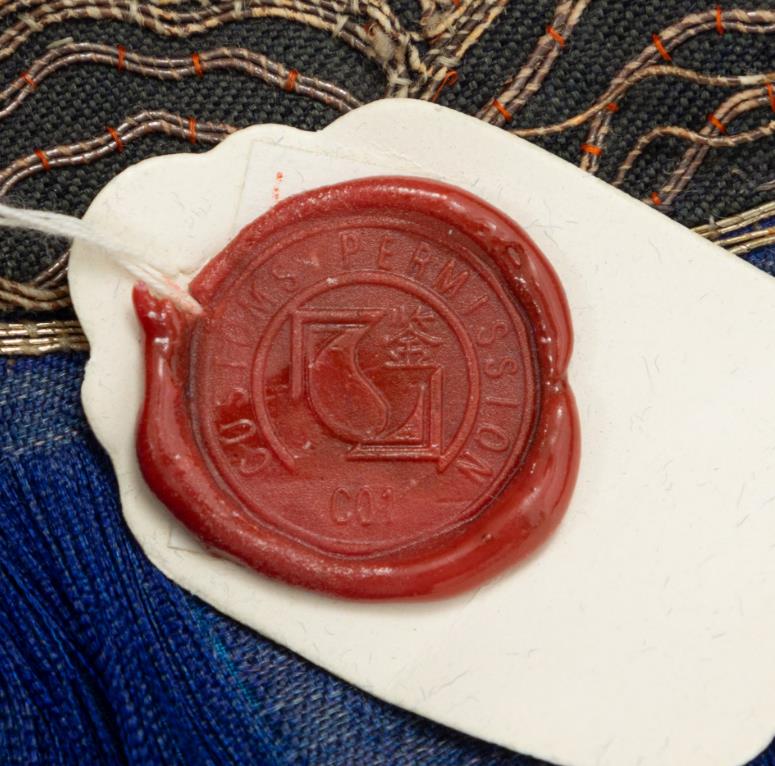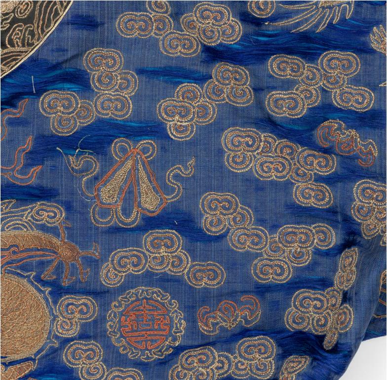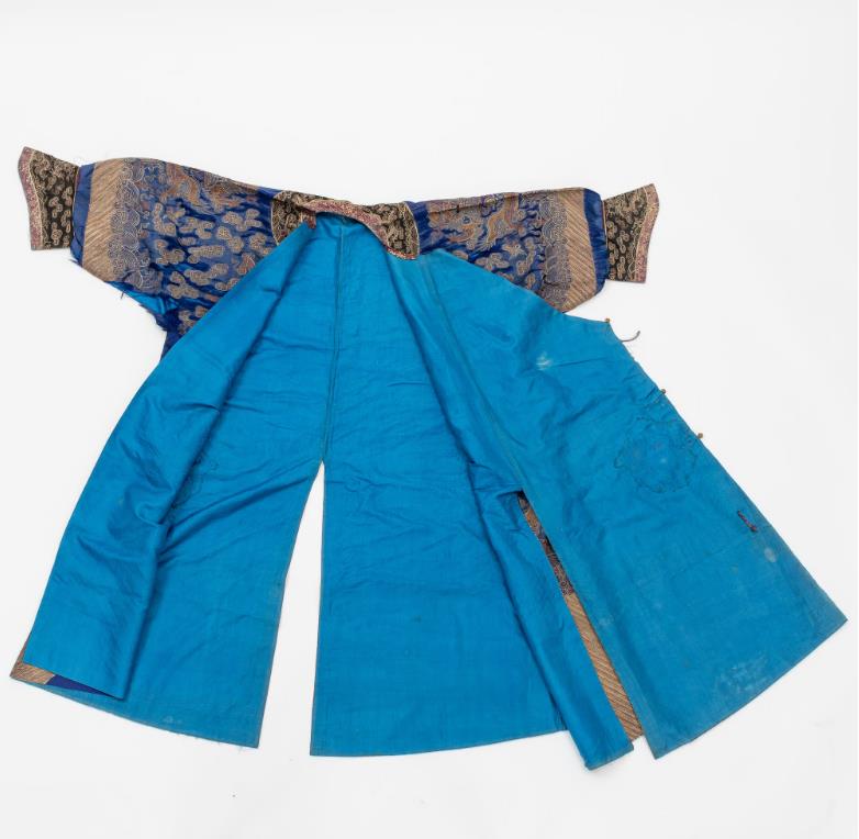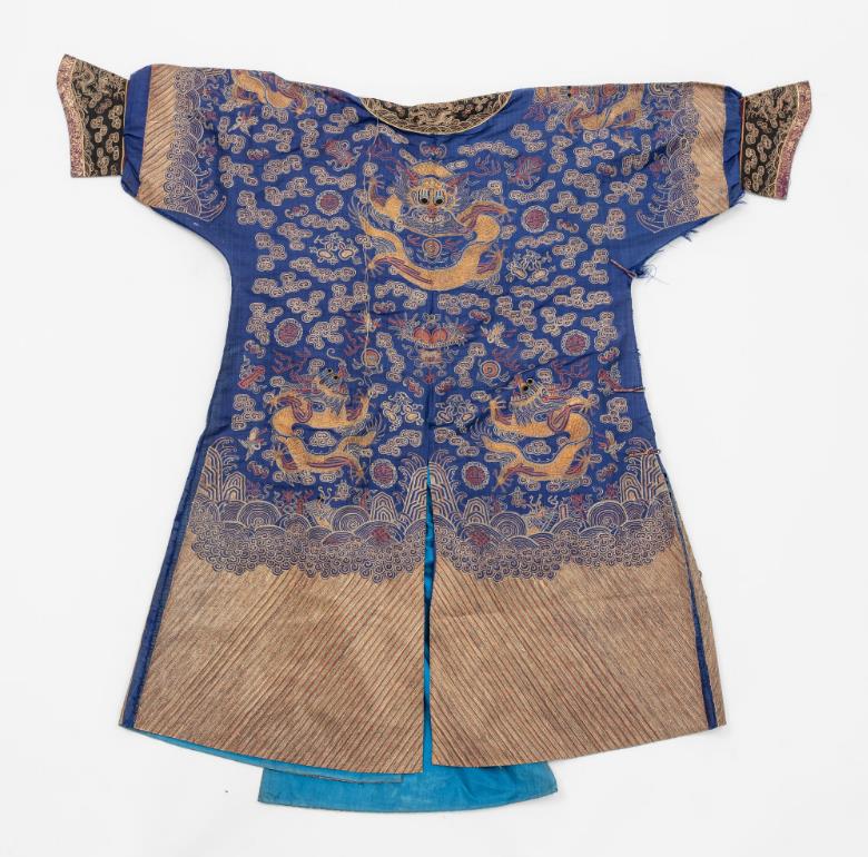 Embroidered with five clawed dragons chasing the flaming pearl against a blue ground. Lined. Height back 129 cm. Measurment arm to arm 150 cm. Changed by the arms. Damages, wear.
