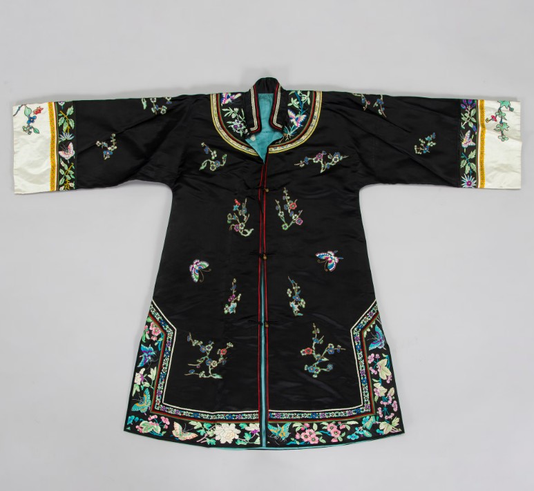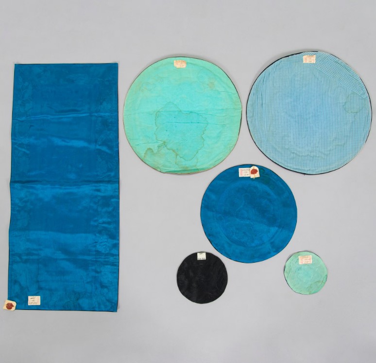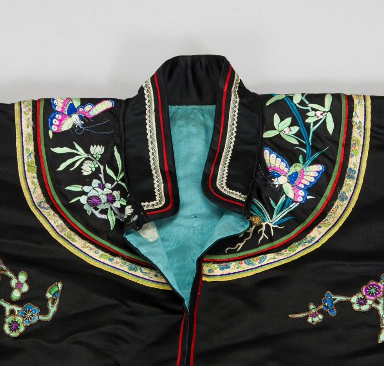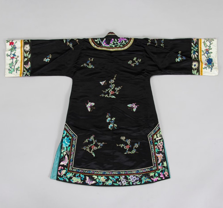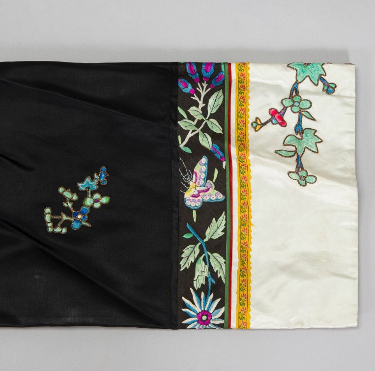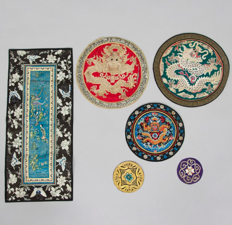The length of the robe is 100 cm, the width between the sleeves is 148 cm, the width at the chest is 52 cm, the length from the armpit down to the hem is 67 cm. The dimensions of the embroideries 11.5 - 35.5 cm. The dimensions of the buzi 70 x 30 cm. The red cloth has tears. Stains. Wear due to age and use.