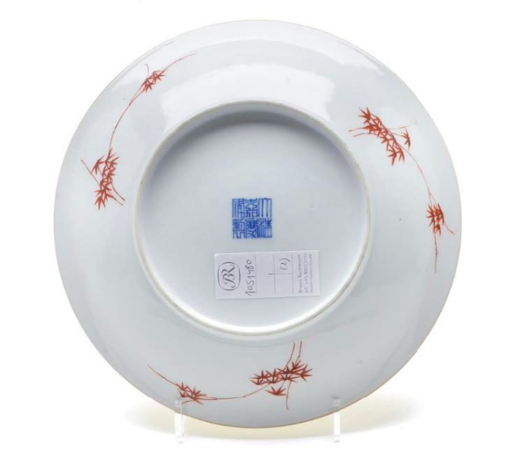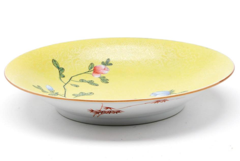 A Chinese famille rose plate painted on a yellow sgrafitto ground, the underside with three sprays of bamboo leaves in iron-red. Jiaqing seal mark in underglaze blue, 19th century. Diam. 25 cm.