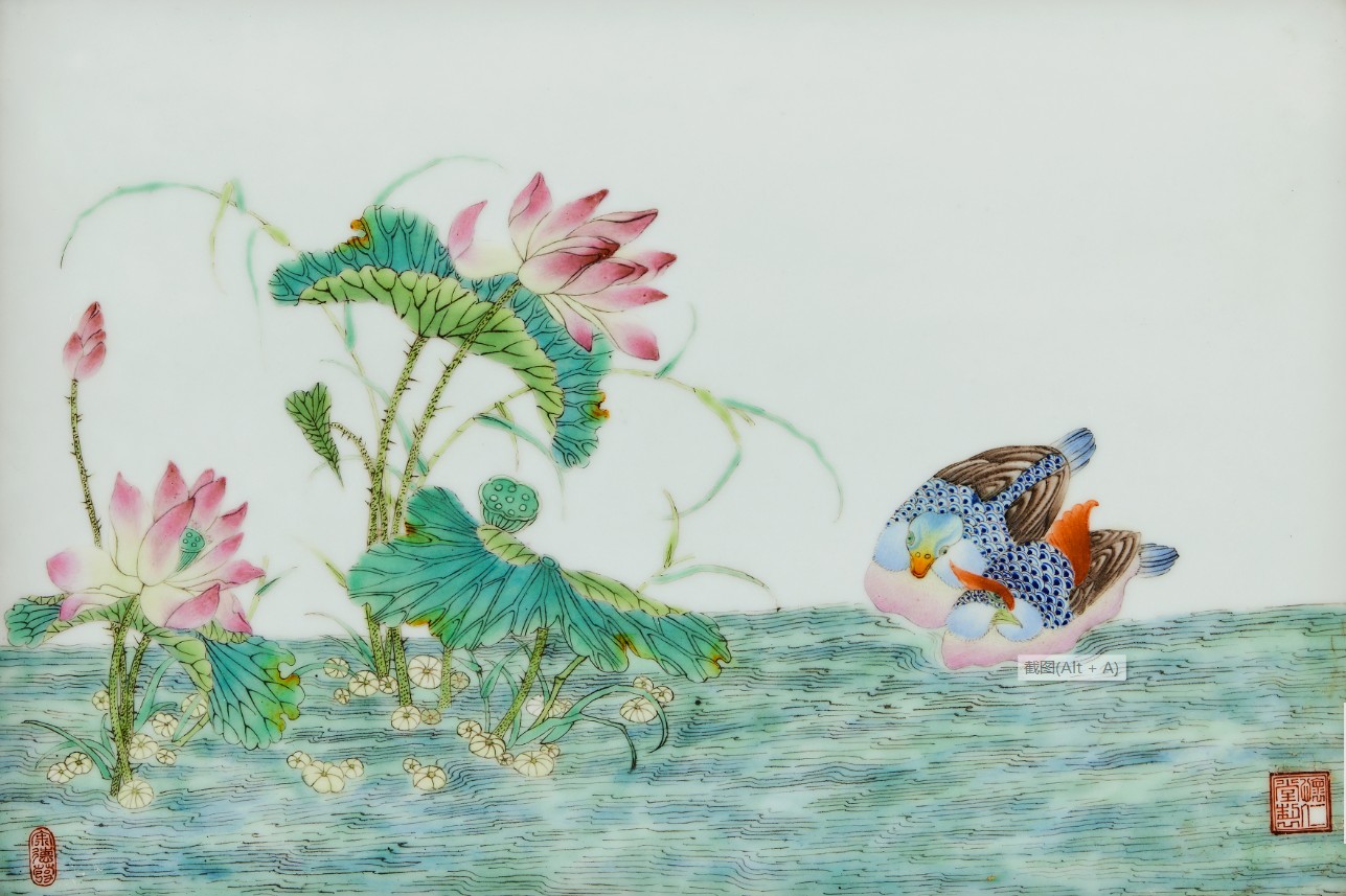 A Chinese Famille Rose Porcelain ’Duck Pond’ Plaque Of rectangular form, decorated in bright famille rose enamels with two colourful ducks swimming in a stream and lotus growing out of the water, the lower right corner with a seal mark, the lower left-hand corner with a seal in iron-red. Measurements: 25 x 37.5 cm (plaque).