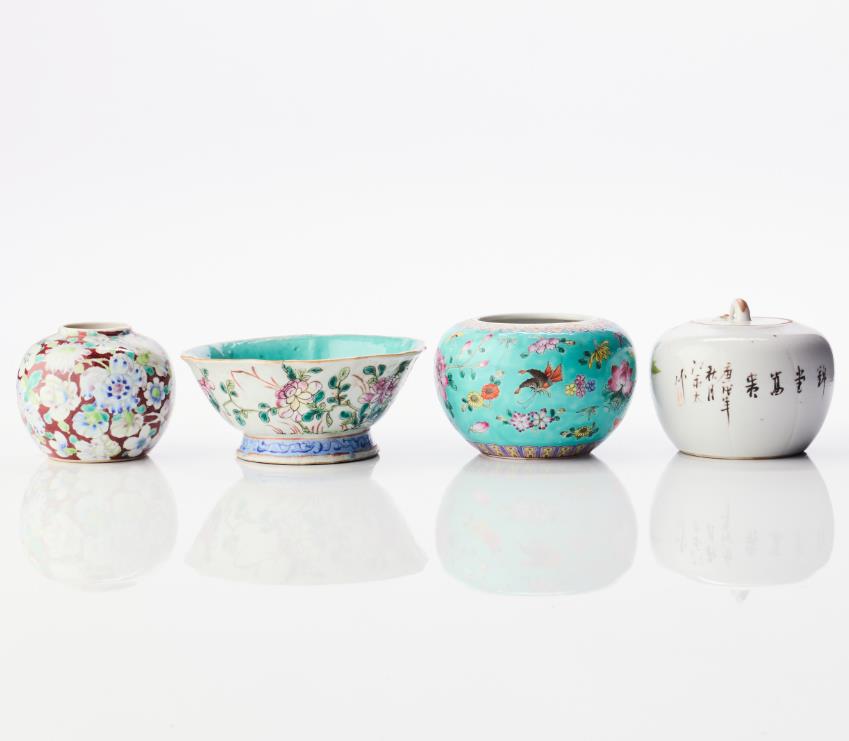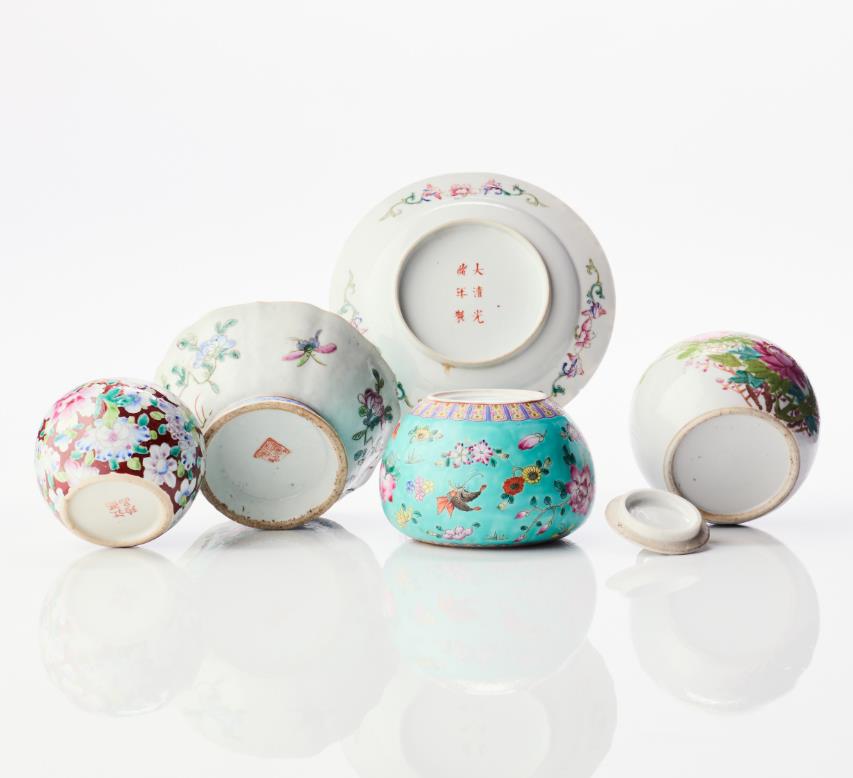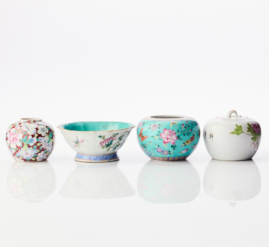 A Chinese Famille Rose Porcelain Jar and Cover, a Bowl, a Dish, a Jar and an Alms Bowl The jar and the dish with 'mille fleurs' decoration. Some with marks in iron red. Period: 20th century. Diameter of the bowl and dish: 19.5 cm, height: 8.5-10.5 cm. Konditionsrapport Wear. Chip.