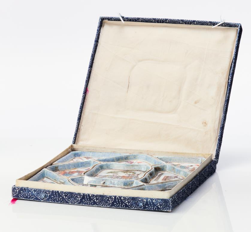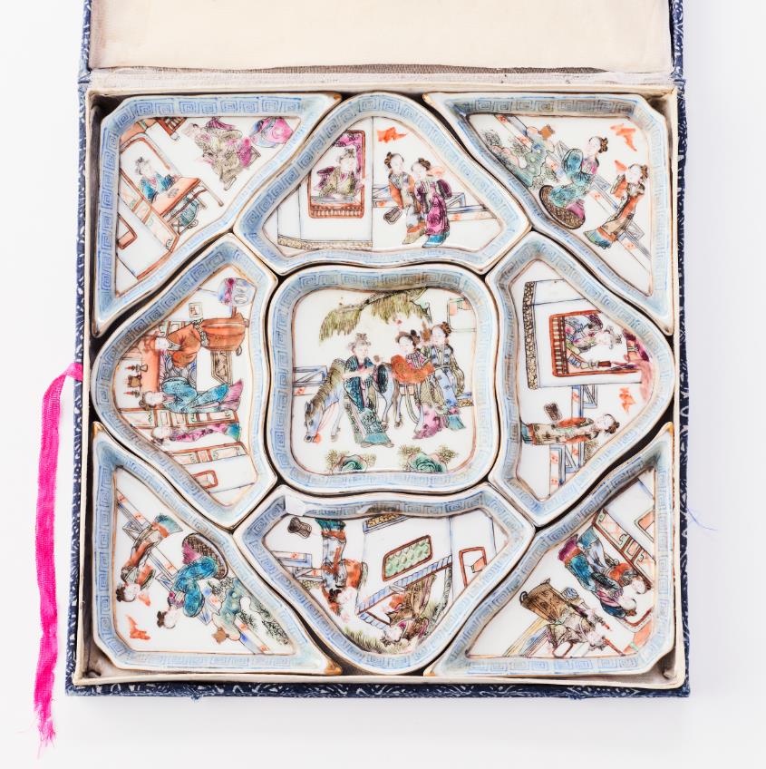 A Chinese Famille Rose Porcelain Nine-Piece Sweetmeat Set With a box. Period: 20th century. Total measurements: 30 x 30 cm. Konditionsrapport Wear.