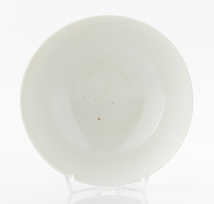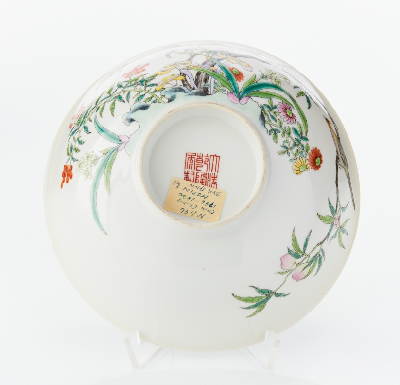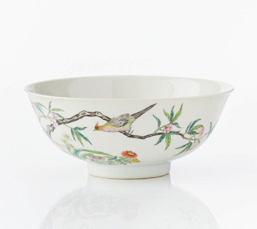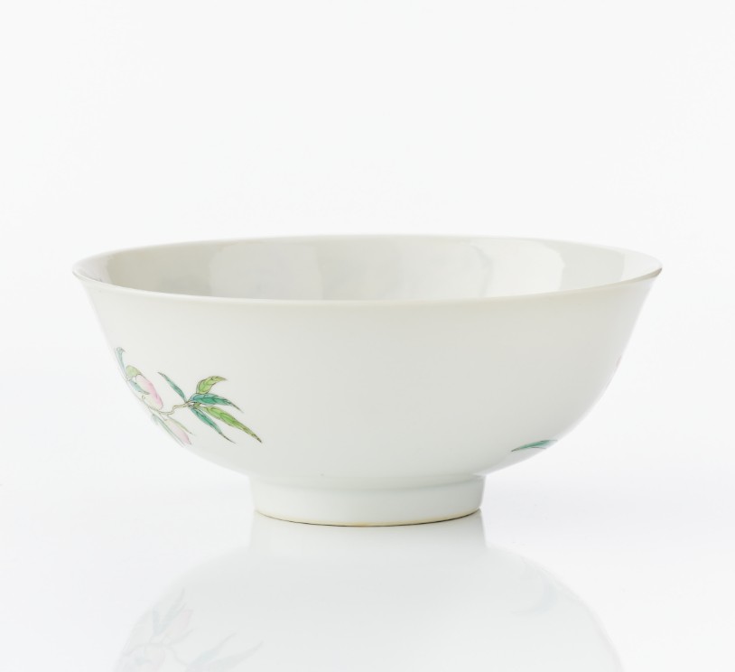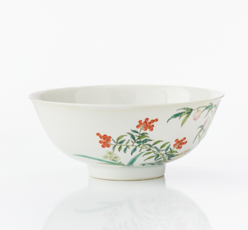 A Chinese Famille Rose Porcelain ’Peach’ Bowl Of circular form with a flared rim, decorated in famille rose enamels with a peach tree, a bird, lingzhi, nandina berries and more blooms, the recessed base with a seal mark of Qianlong in red enamel. Period: late Qing (1644‑1912) or Republic (1912‑1949). Diameter: 16.7 cm.