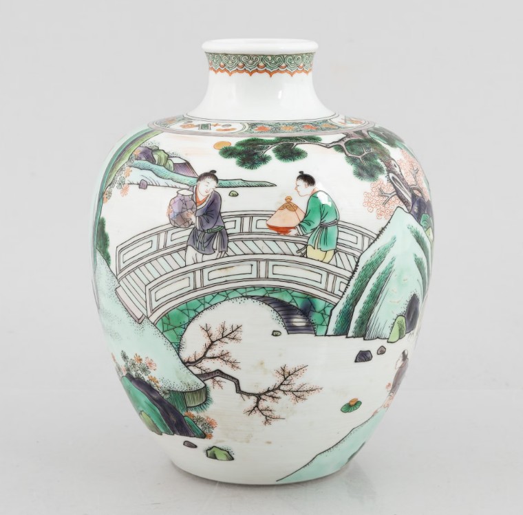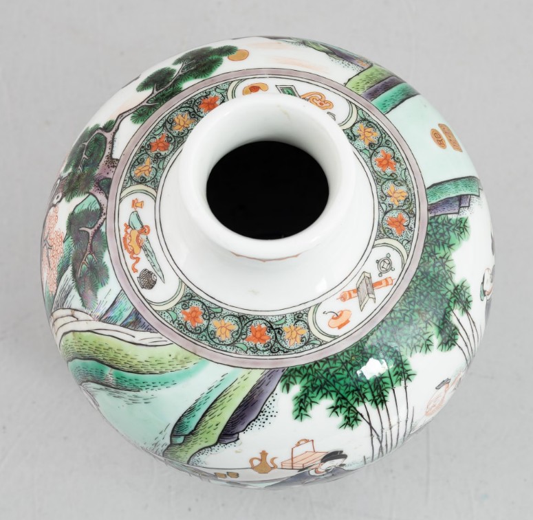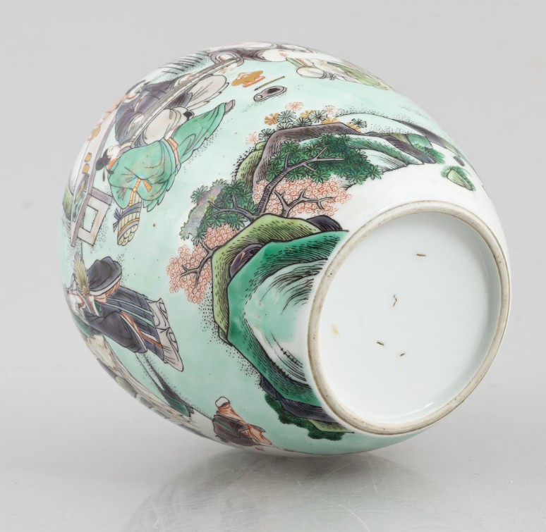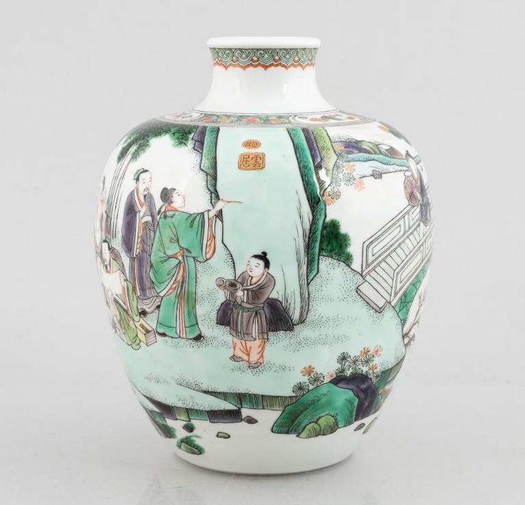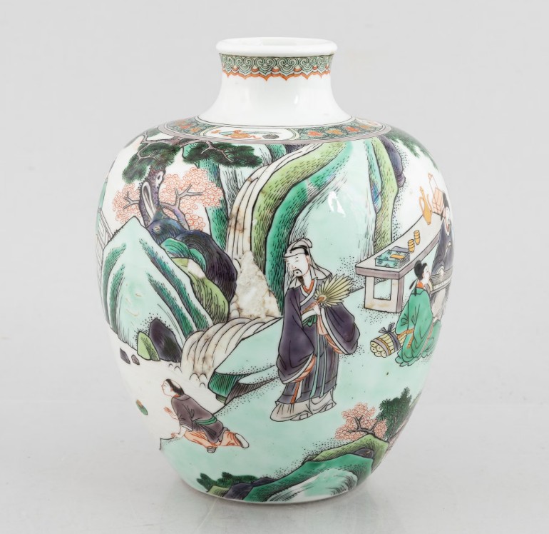 Ovoid with a short tapered neck. Decorated with famille verte featuring scholars playing musical instrument and reading, and servants presenting objects in a garden. Ruyi border runs below the rim. Height 20.5 cm. Wear. Loss of glaze, crazing to the glaze.