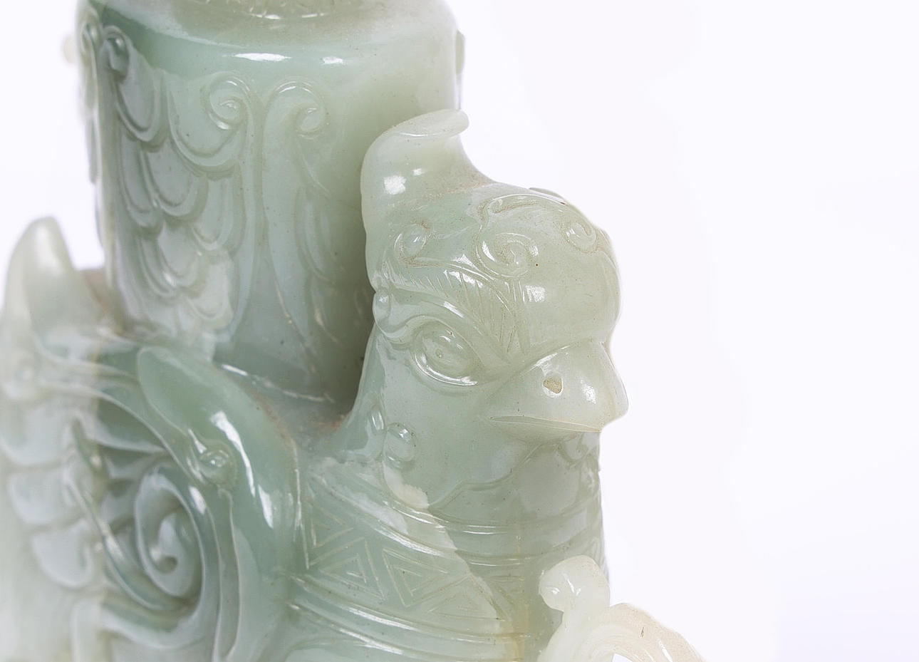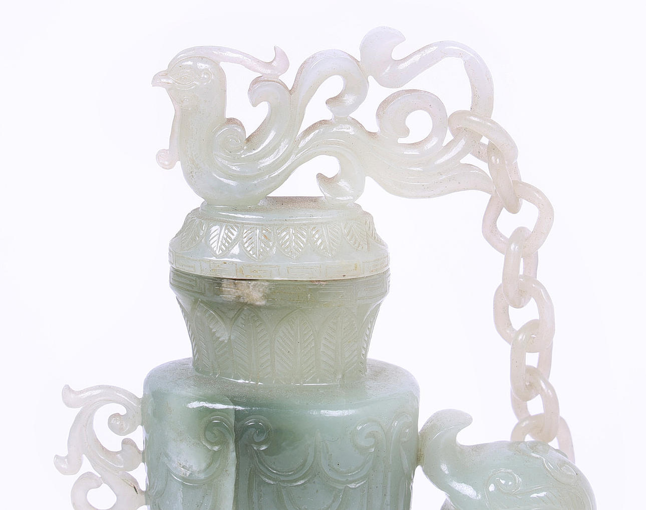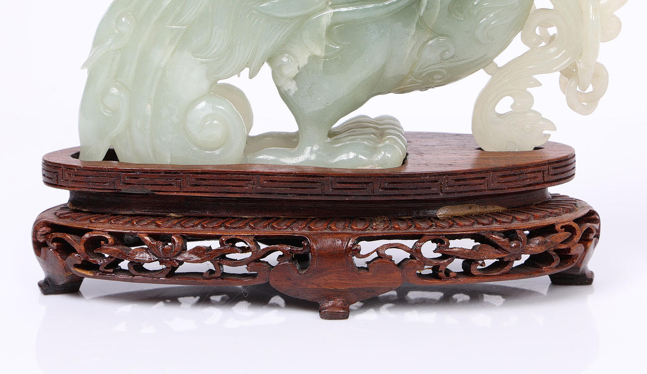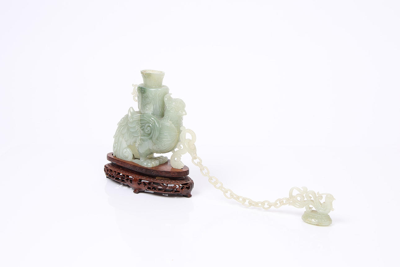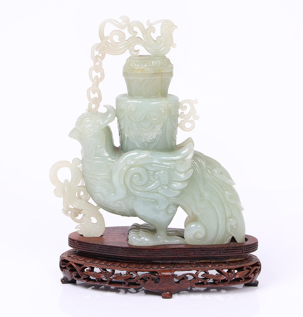 The lid with a phoenix and protruding scrolling tail above the bottle vase and phoenix holding a chain link to the beak that leads to the lid, raised on a carved 13.5cm long, 19cm high including the stand. Condition A very small chip to the beak on the lid, otherwise good condition. 35203