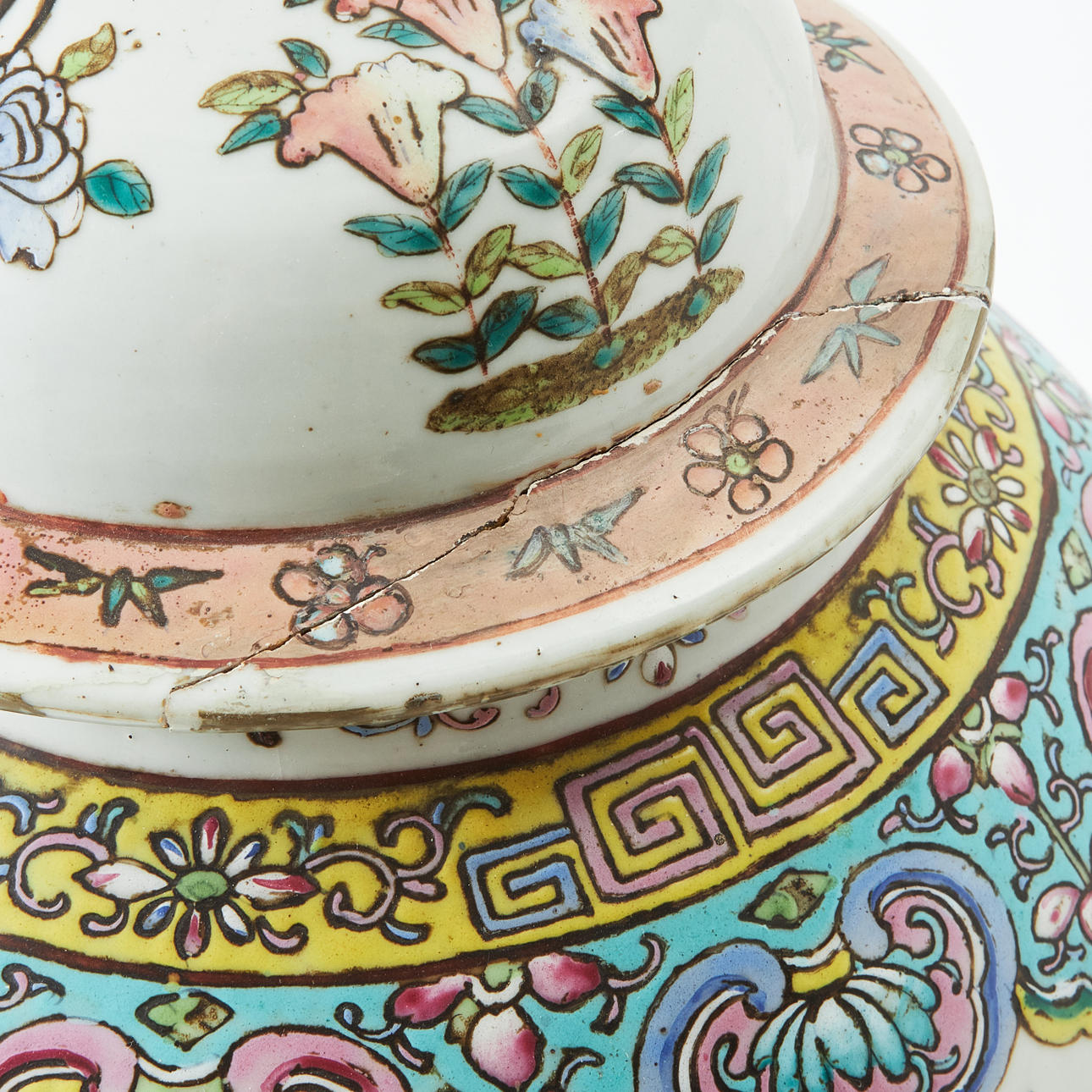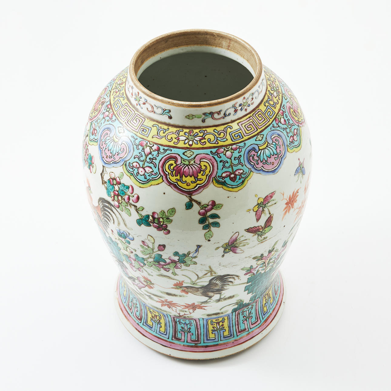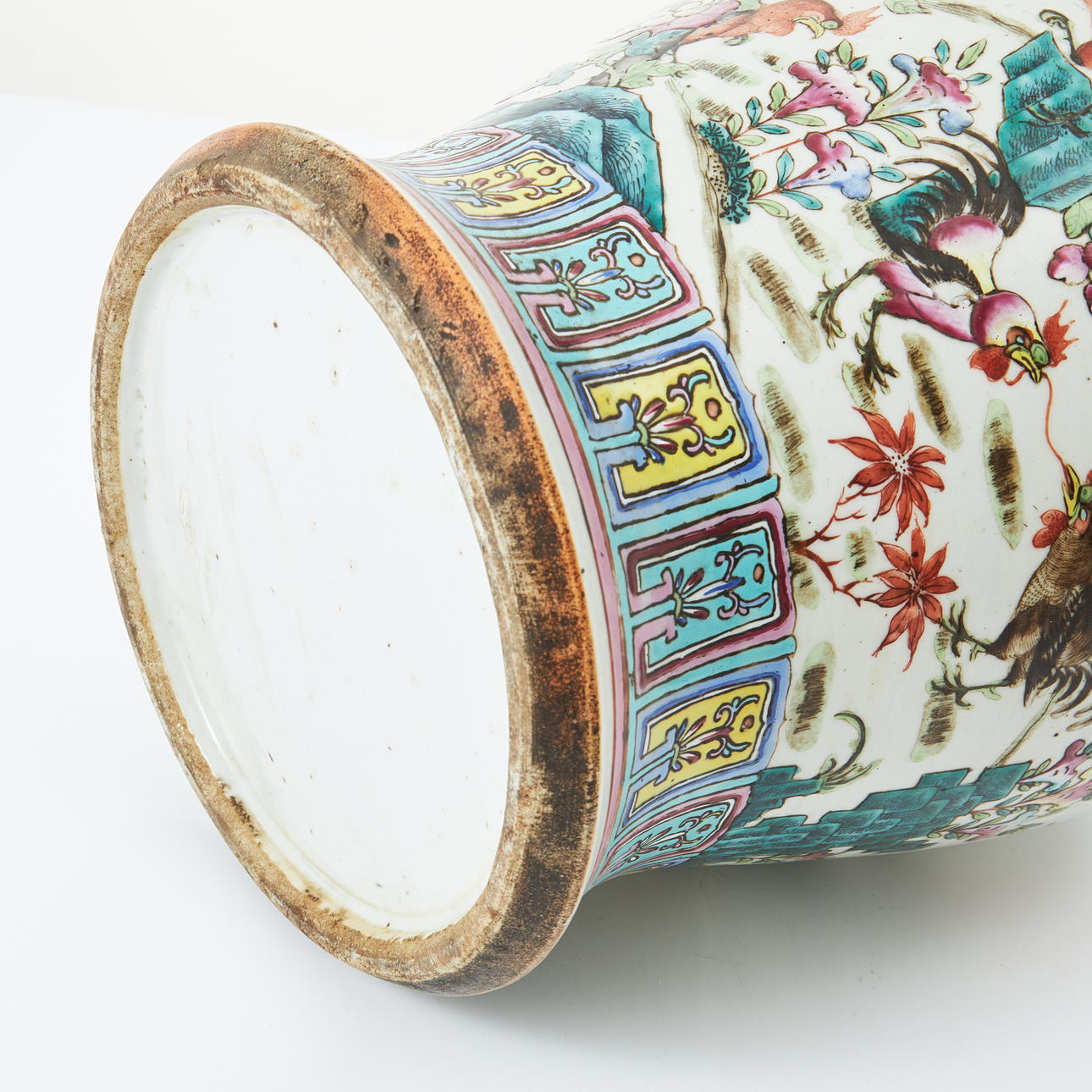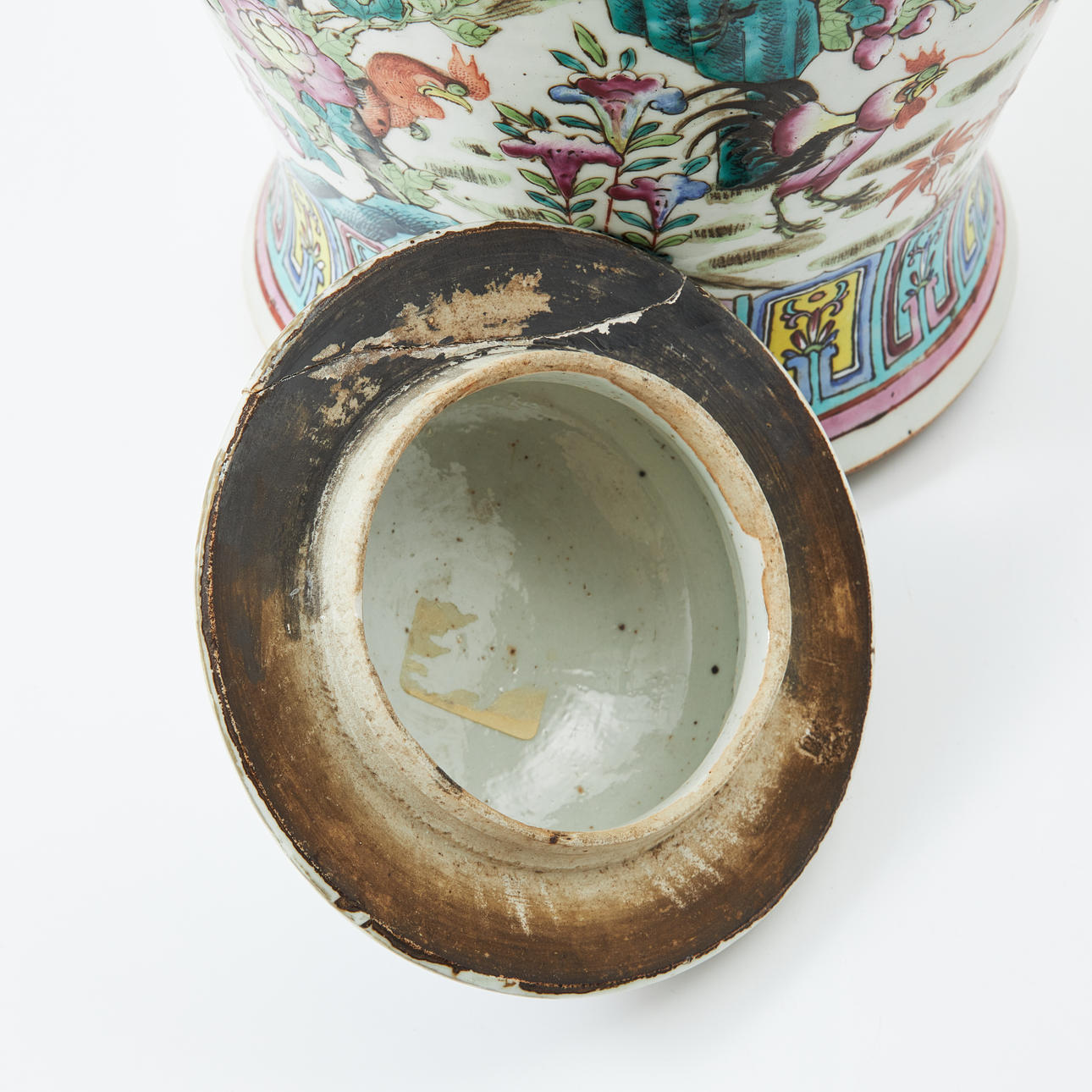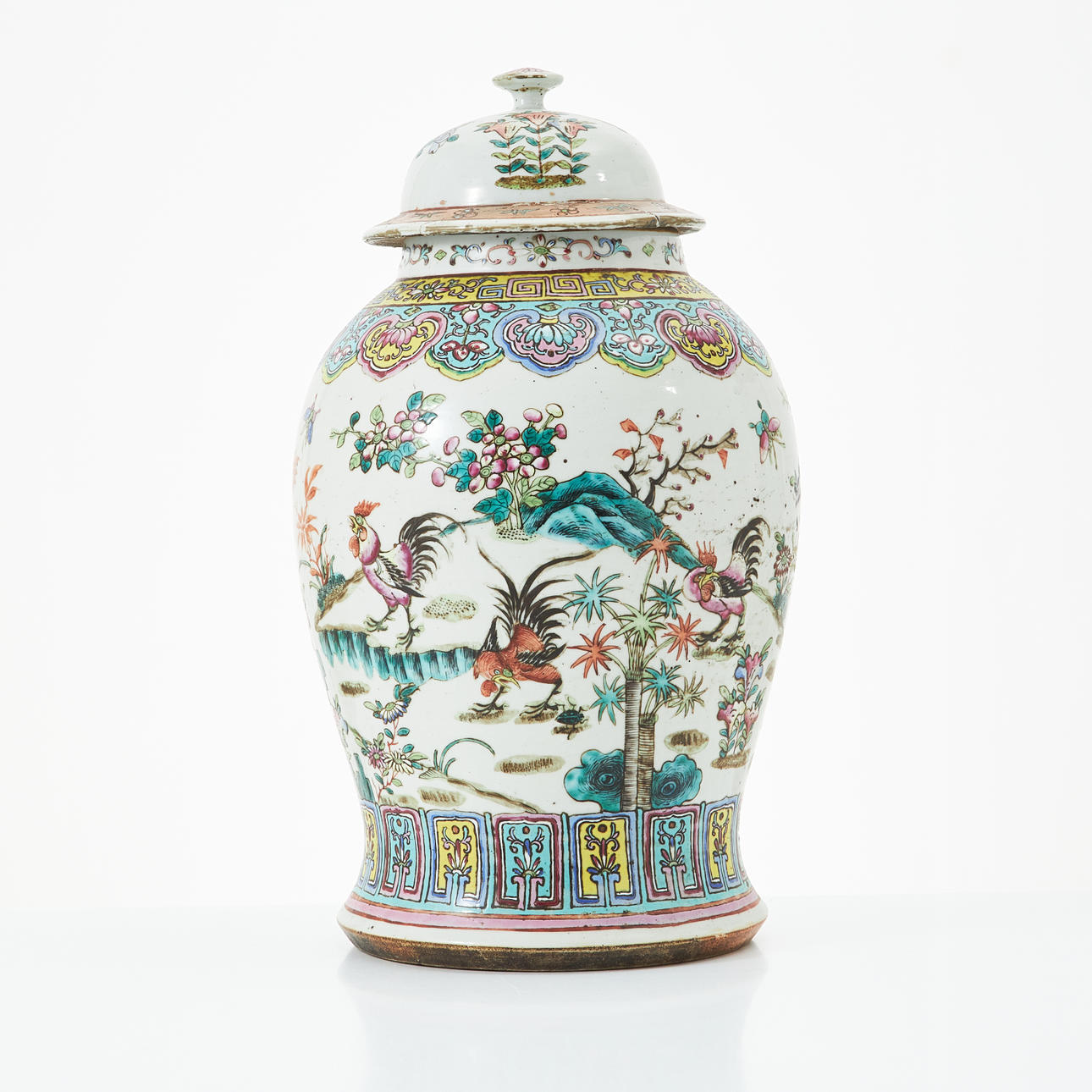 Second half of the 19th century, baluster-shaped, decorative garden scene with roosters in enamel colors, iron oxide and sepia. Height approx. 45 cm. Condition Wear, marks, cover repaired and with chips. The item details are approximate autom 182606
