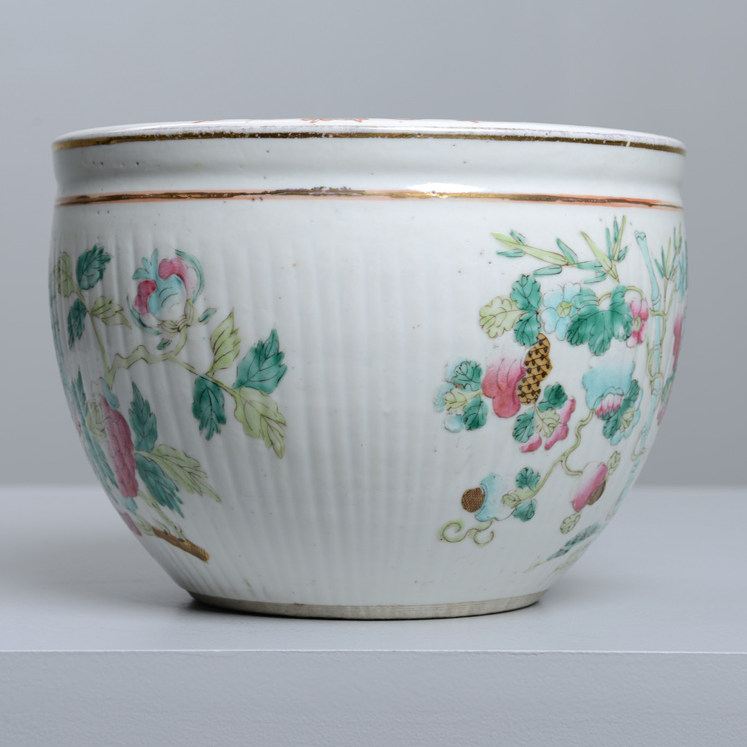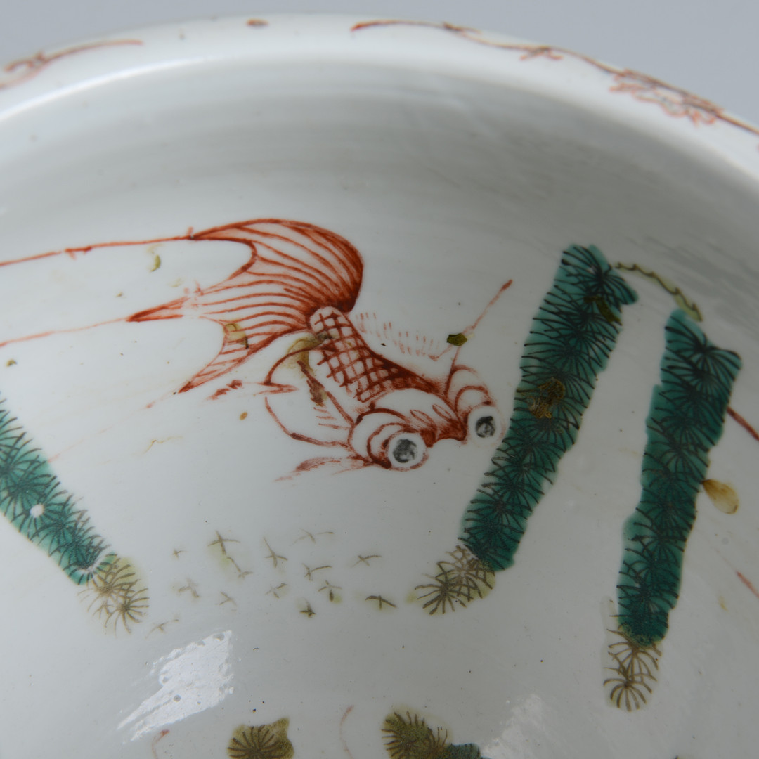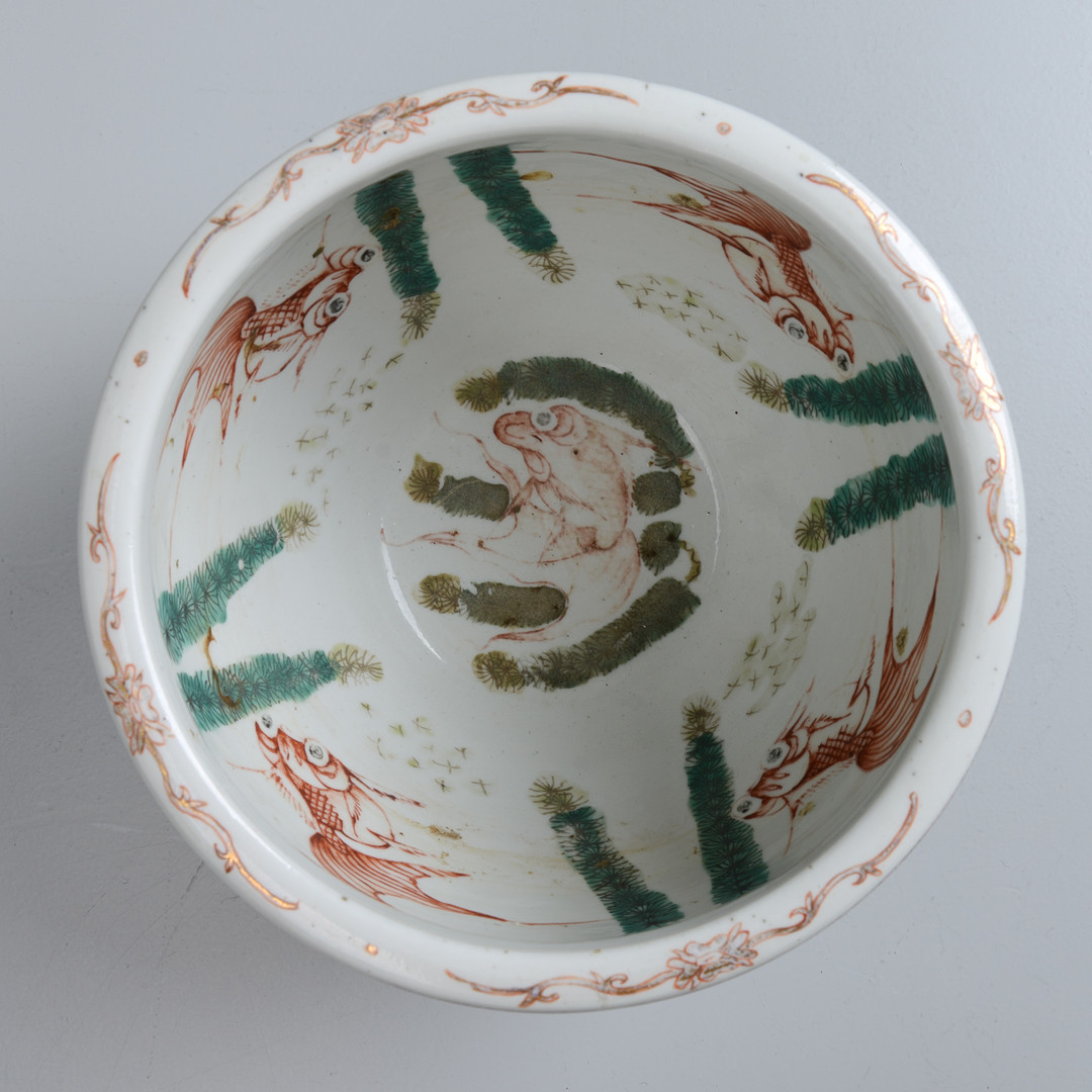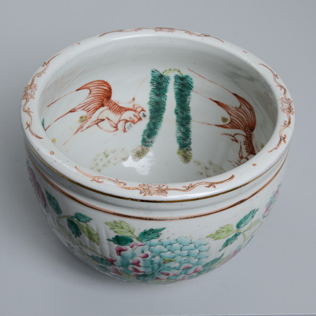 Floral decor in Famille rose colors on the outside, inside with decoration of goldfish. Height 15, diameter 21.5 cm. Condition Wear and tear. 21906