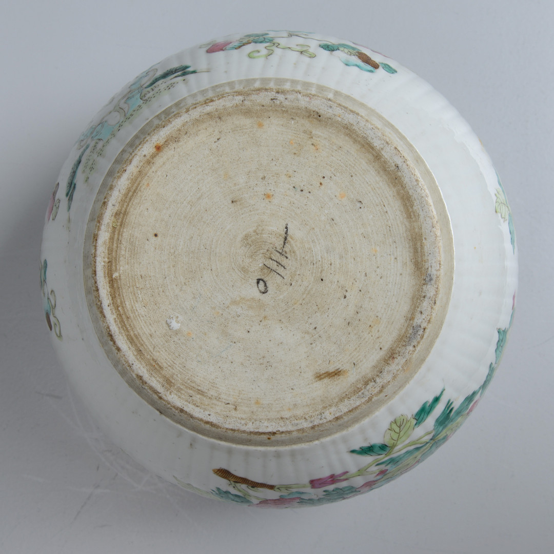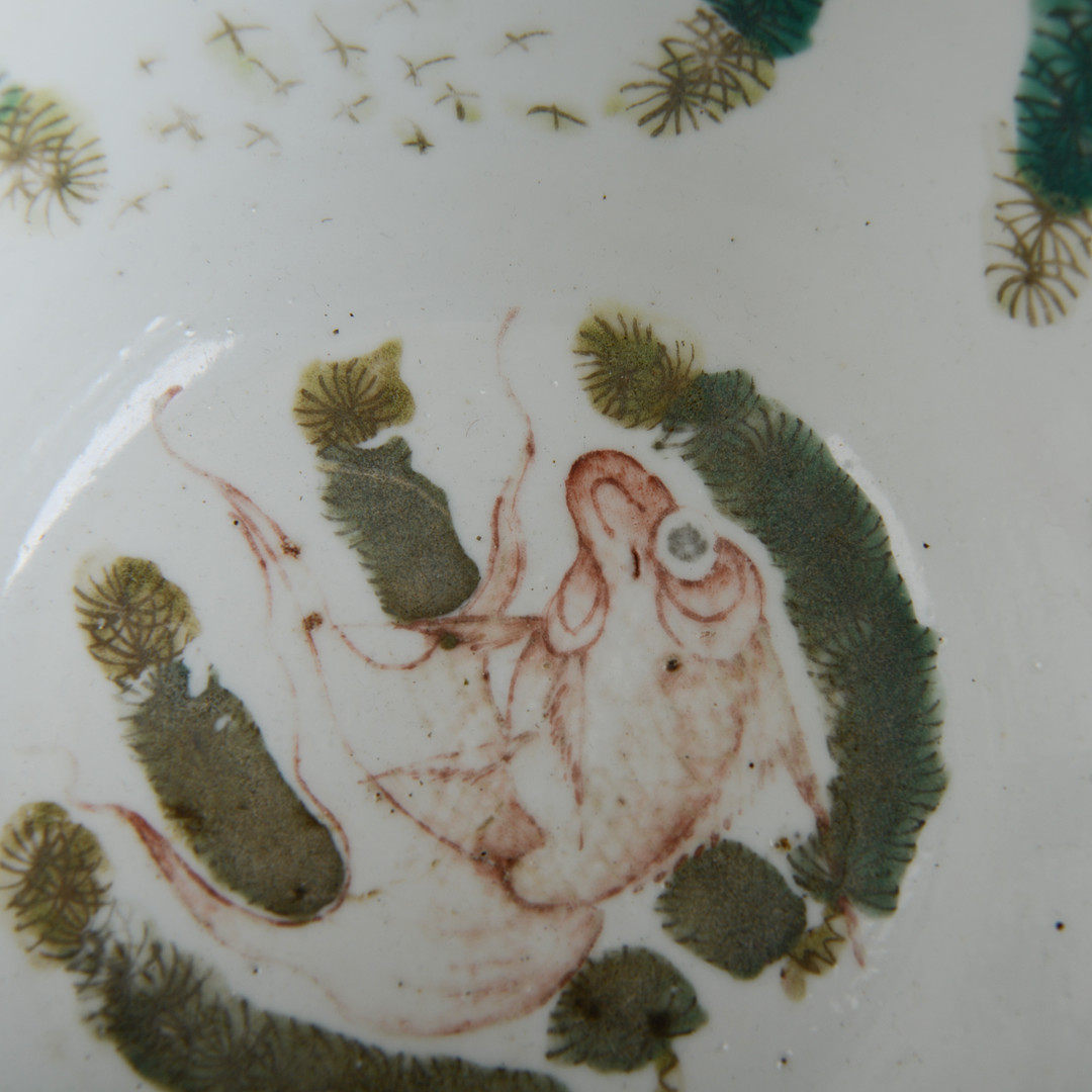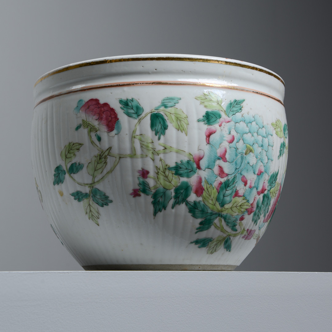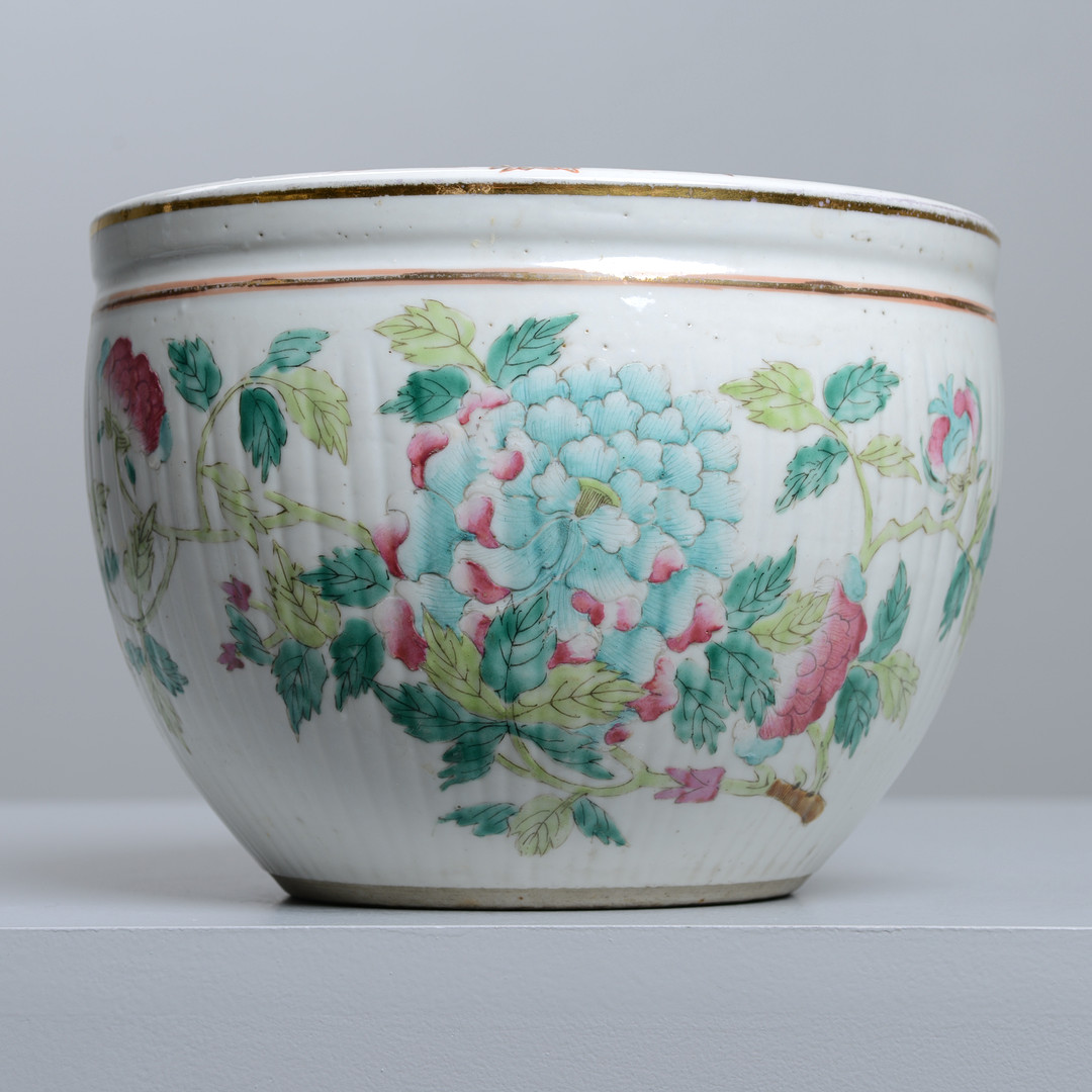 Floral decor in Famille rose colors on the outside, inside with decoration of goldfish. Height 15, diameter 21.5 cm. Condition Wear and tear. 21906