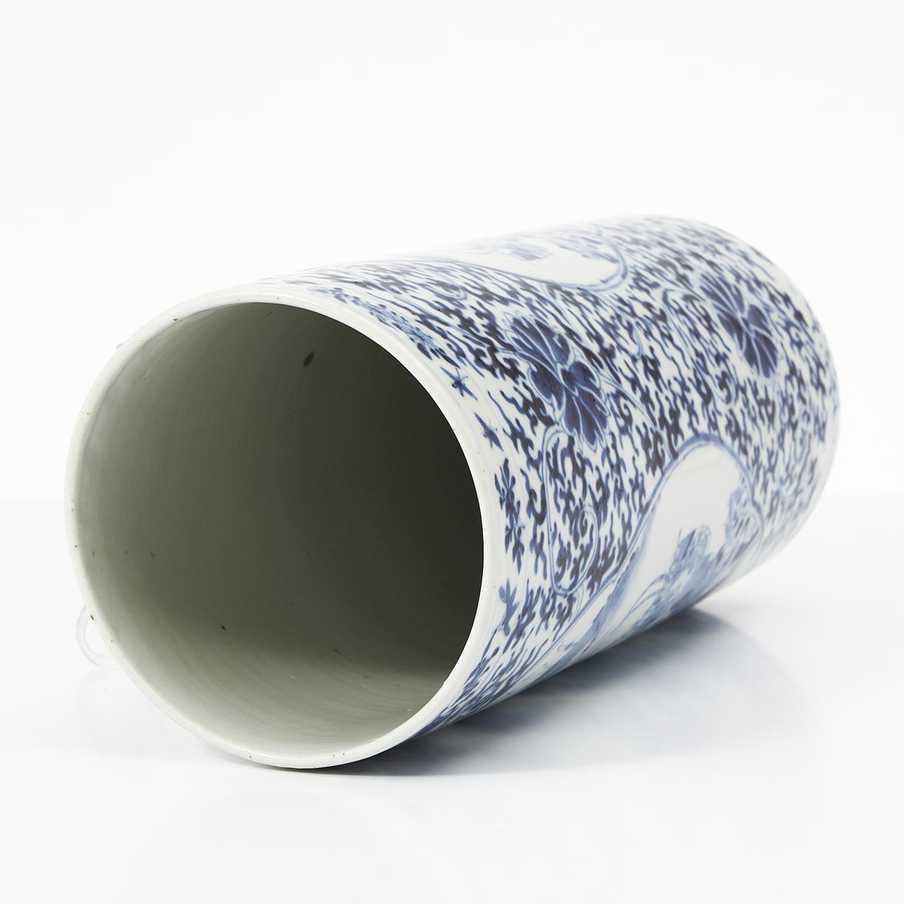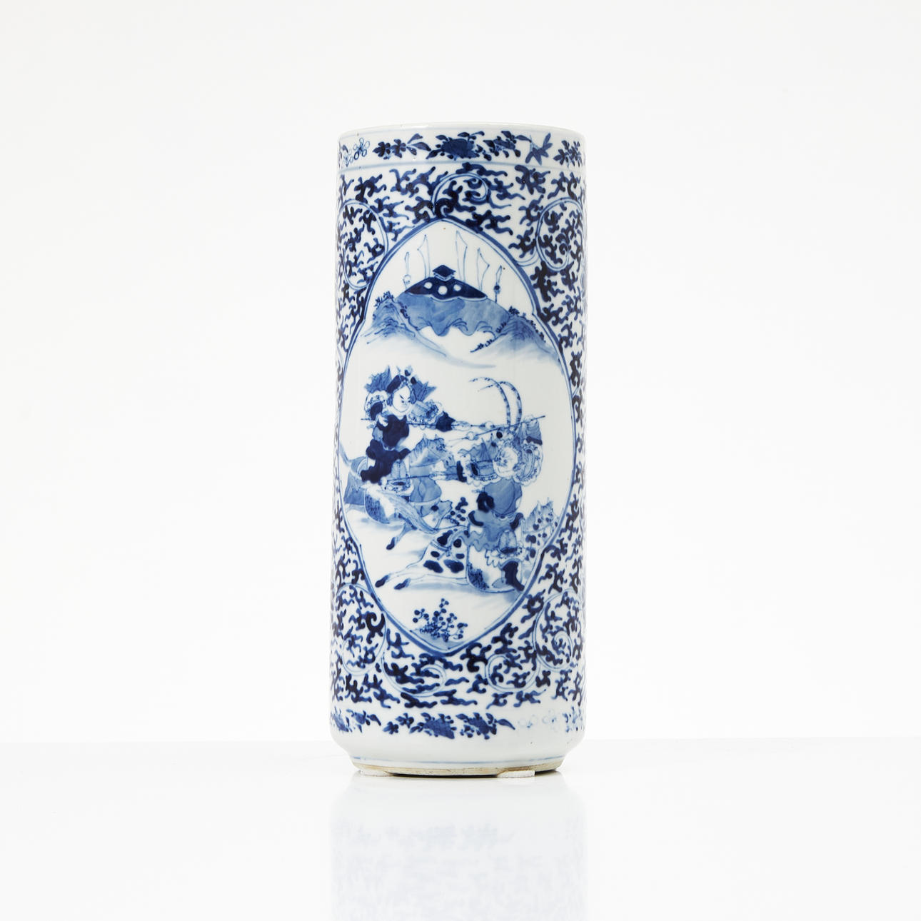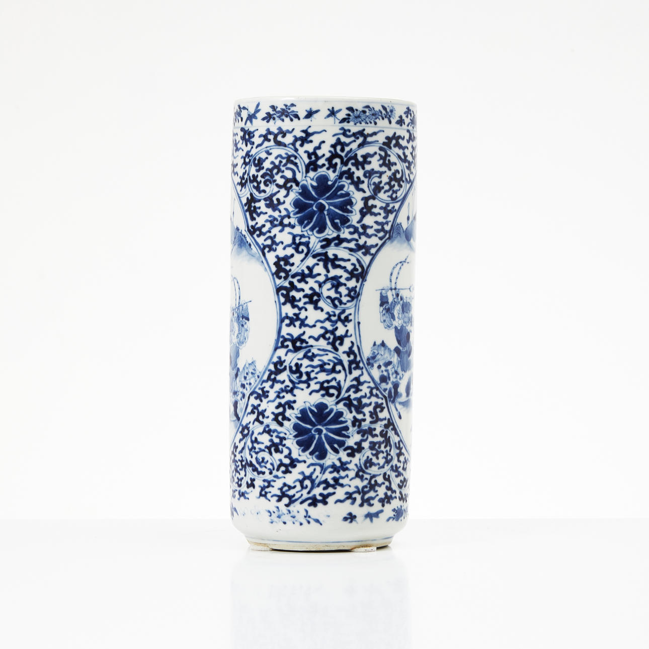 Cylindrical, decorated with cartouches with figural scenes surrounded by lotus loops in underglaze blue, with Kangxi's four character mark.