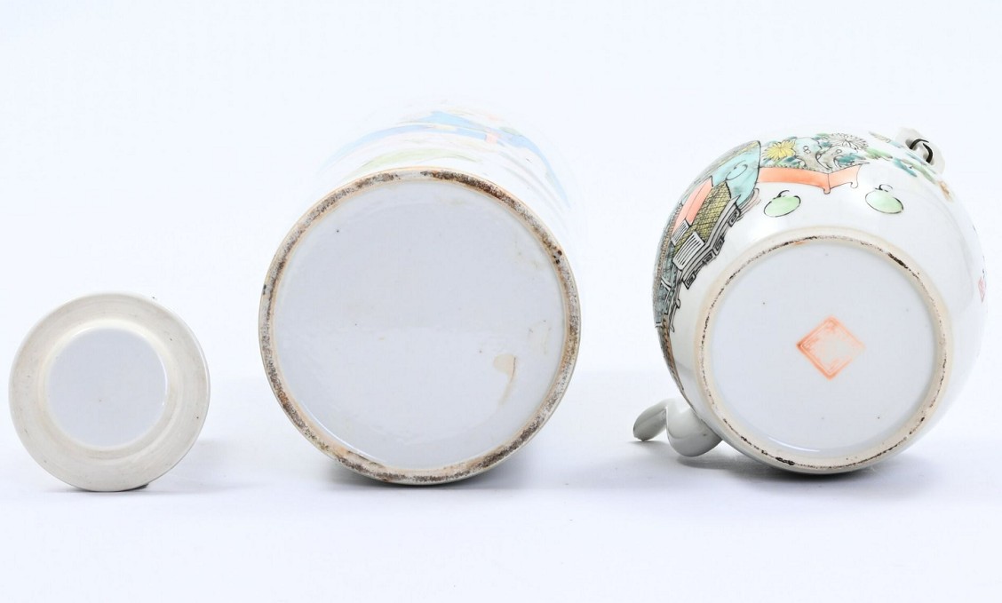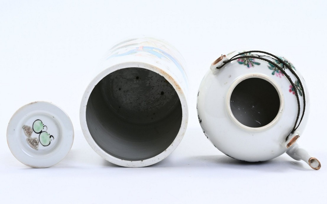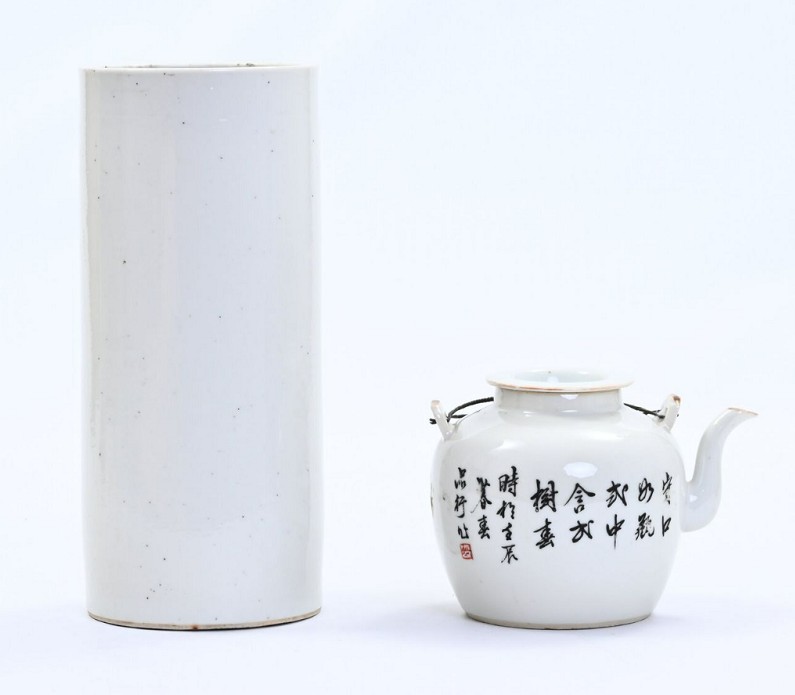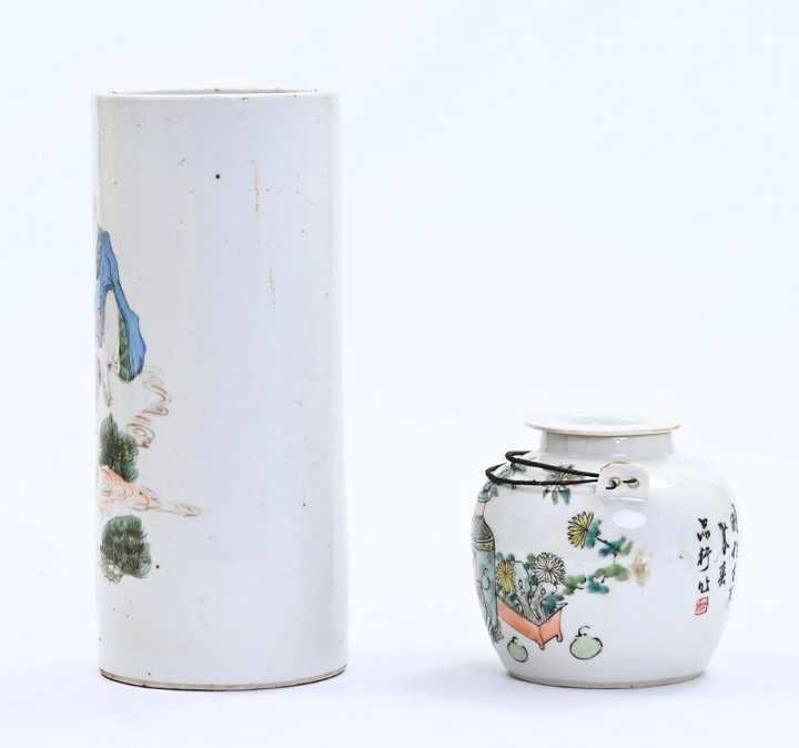 A Chinese qianjiang cai 'antiquities' teapot and cover and an 'Immortal' hat stand.