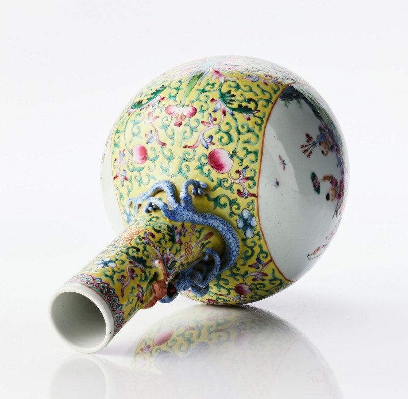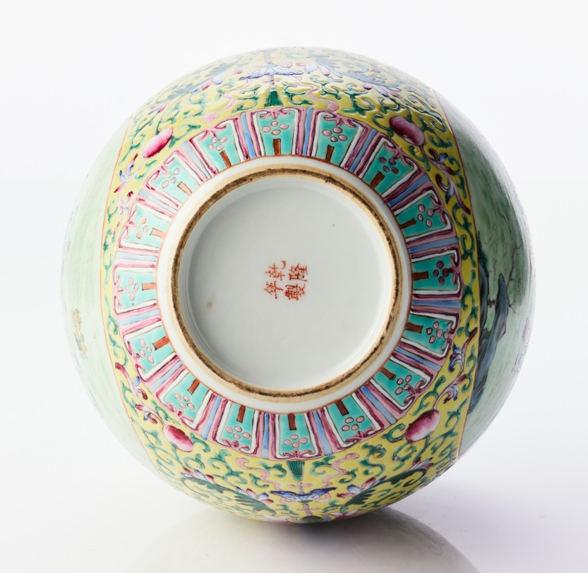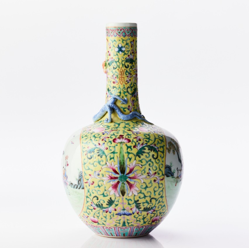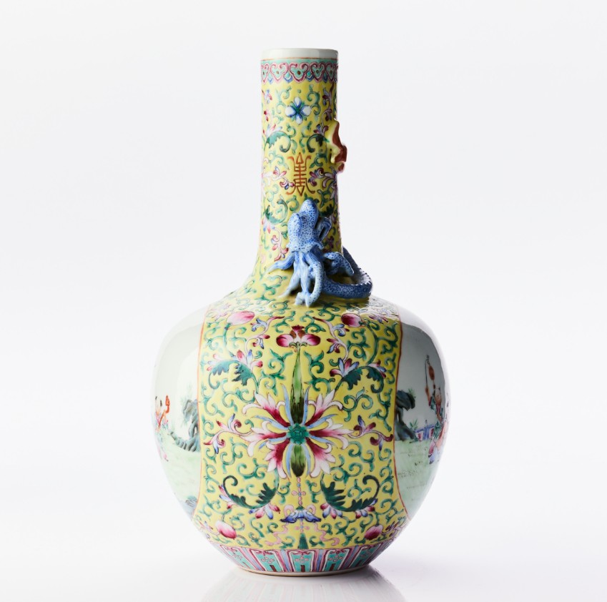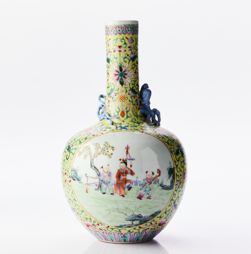 A Chinese Relief-Decorated Yellow-Ground Famille Rose Porcelain 'Hundred Boys' Vase The base with a four-character mark of Qianlong in iron-red, carved hardwood stand. Period: first half of the 20th century. Height: 32.5 cm. Proveniens Arthur Lindell (1912‑1990). Lindell was a steward on M/S Kungsholm, that sailed between from 1928 and up to the outbreak of World War II. He went on to work at another ship that was launched in 1965 before retiring around 1970. Acquired during his travels by sea. Thence by descent within the family. Konditionsrapport Minor wear. Glaze spots.