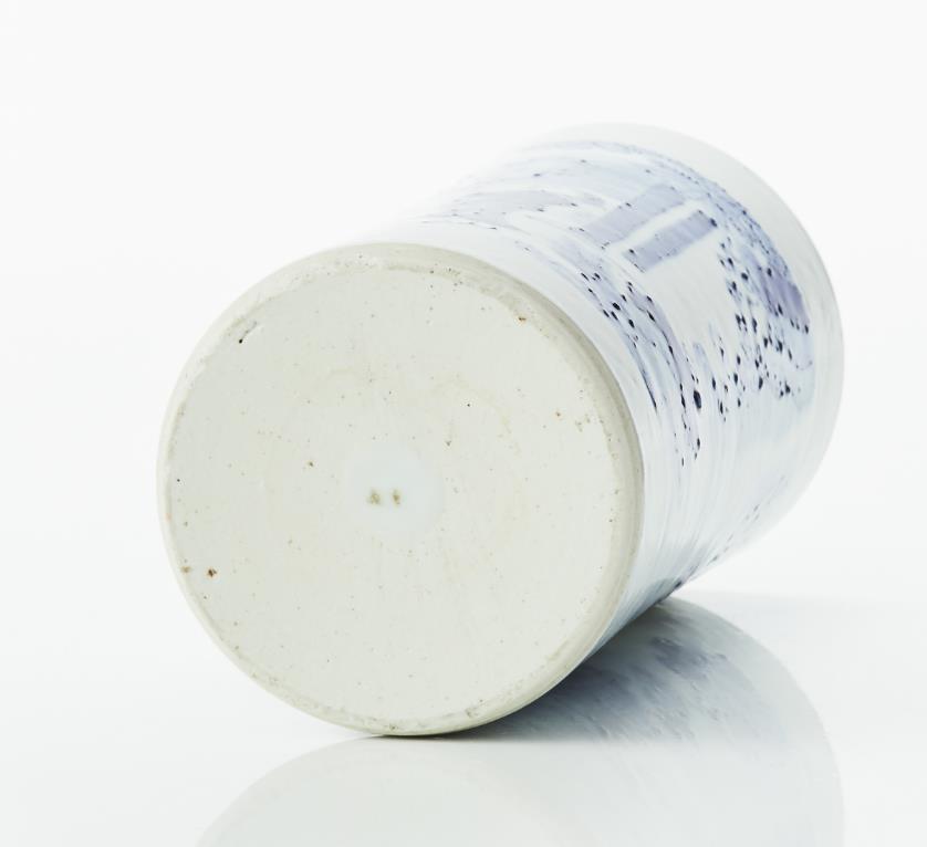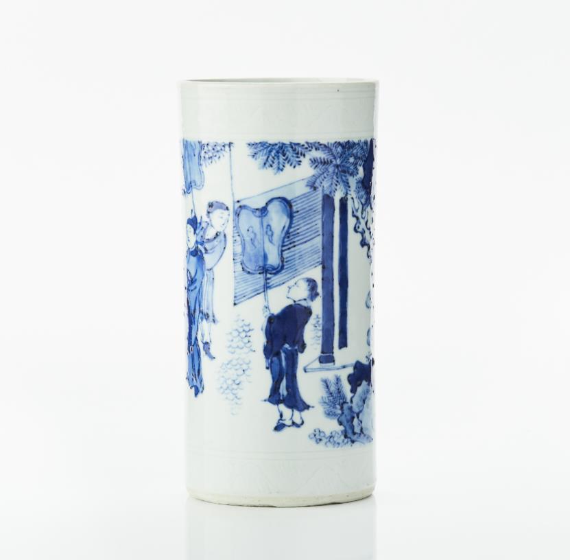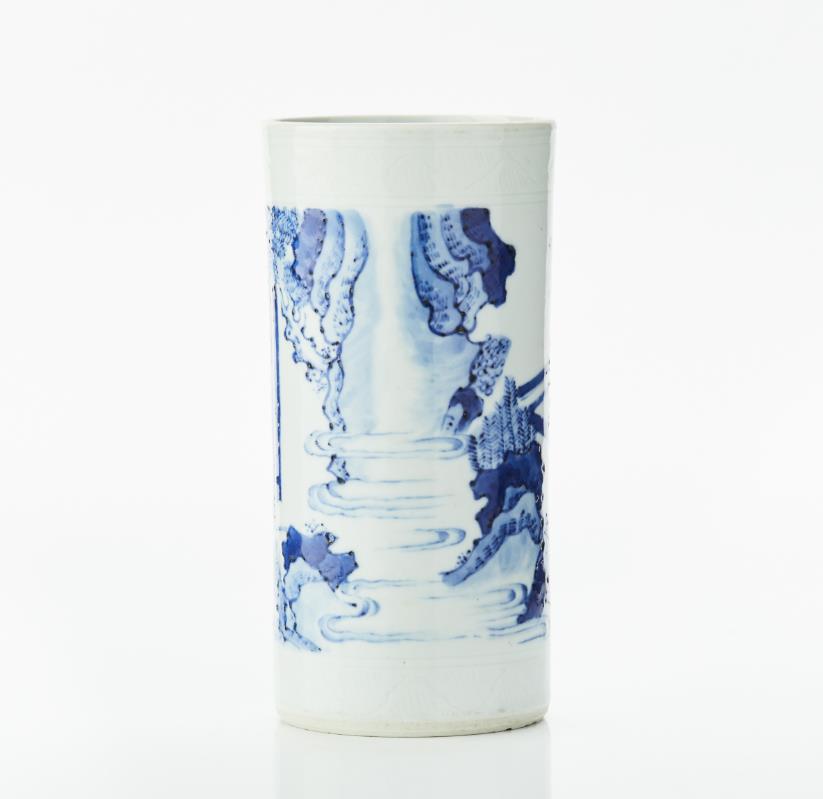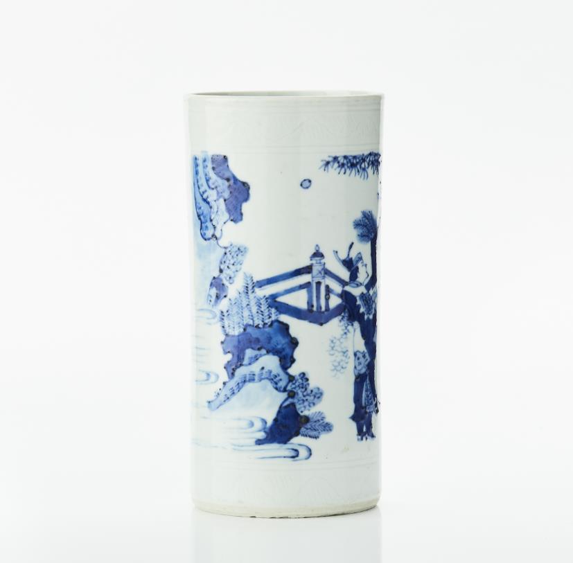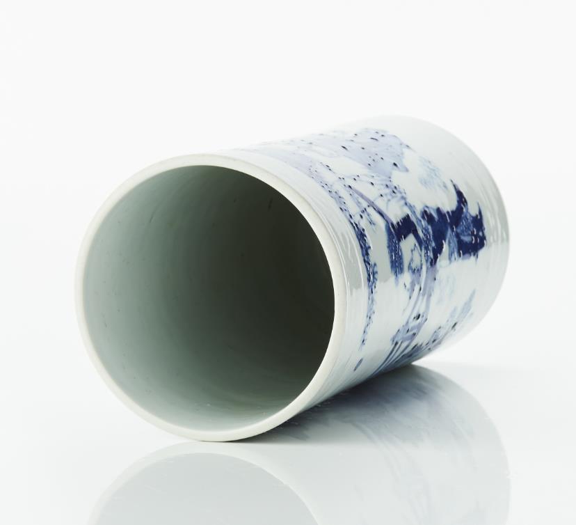 A Chinese Transitional Style Blue and White Porcelain Brush Pot, Bitong Height: 16 cm. Konditionsrapport Wear.