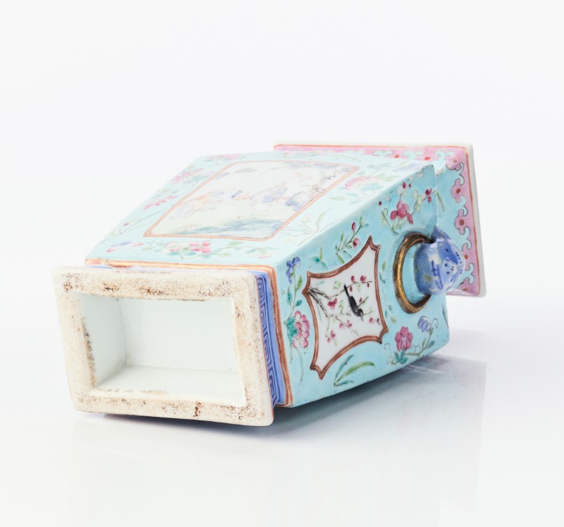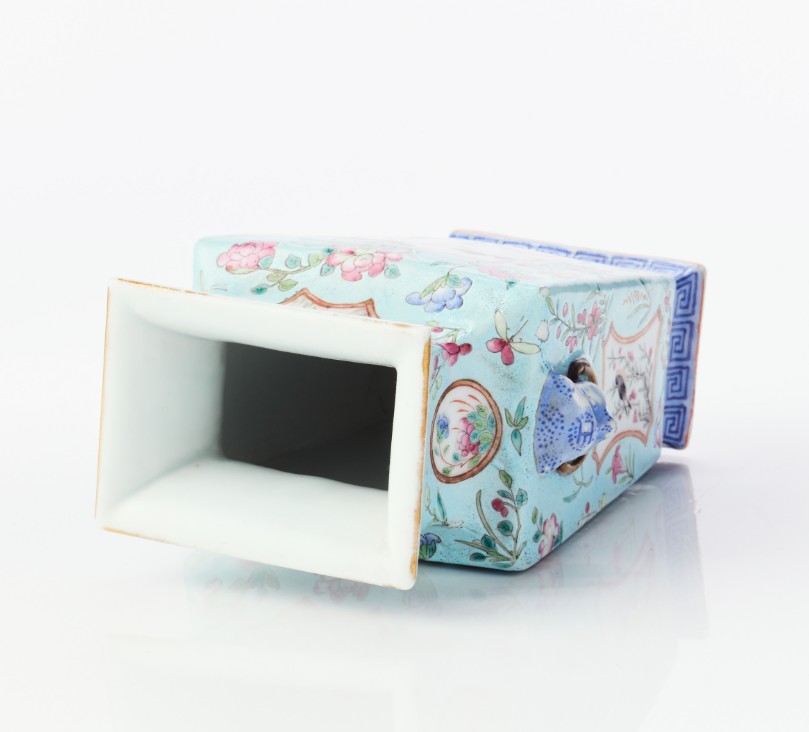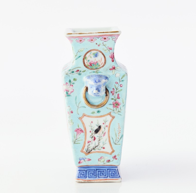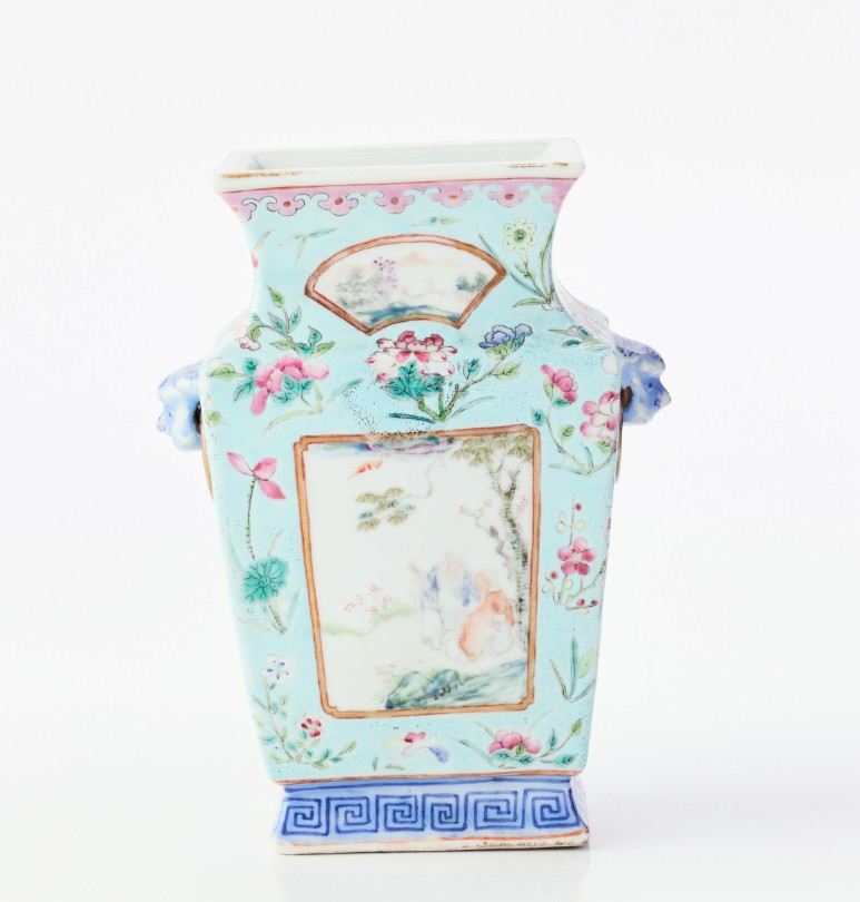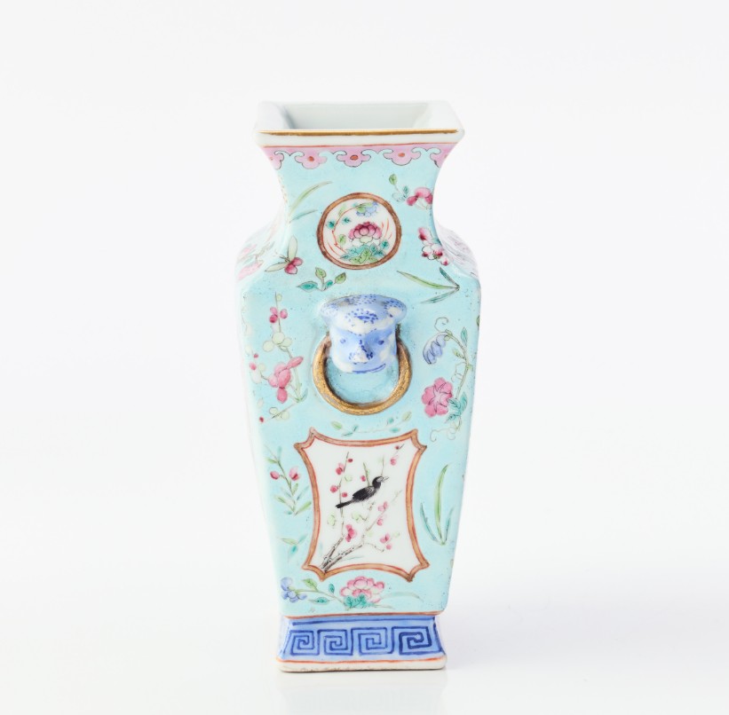 A Chinese Turquoise-Ground Famille Rose Porcelain Square-Section Vase