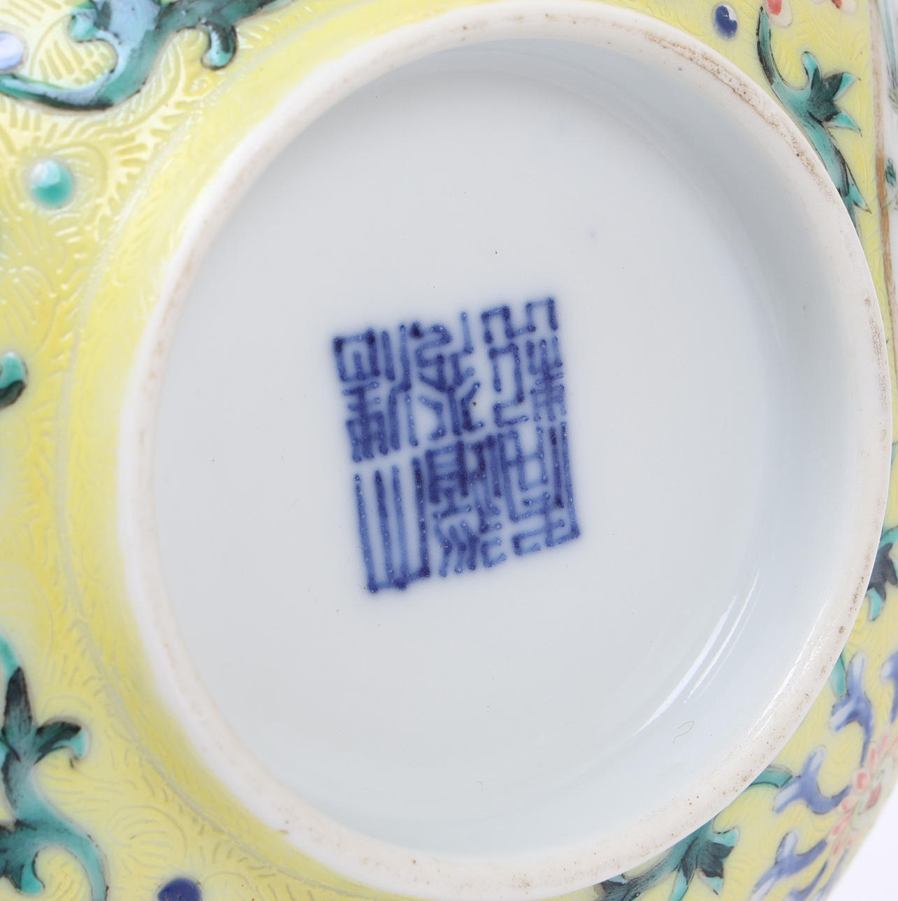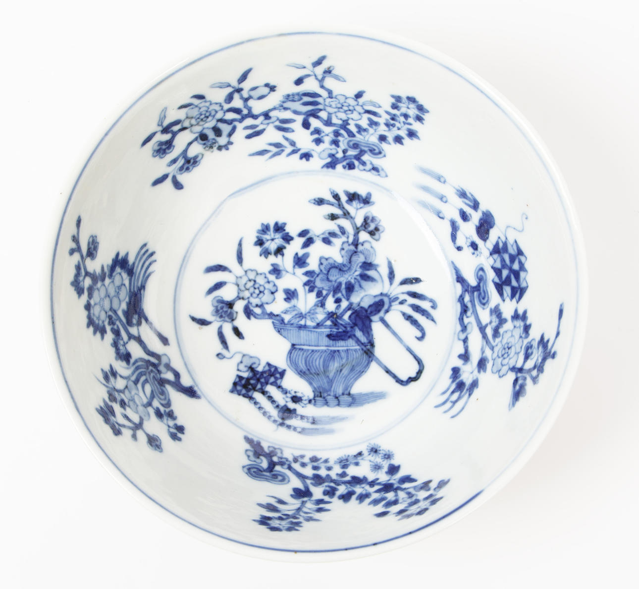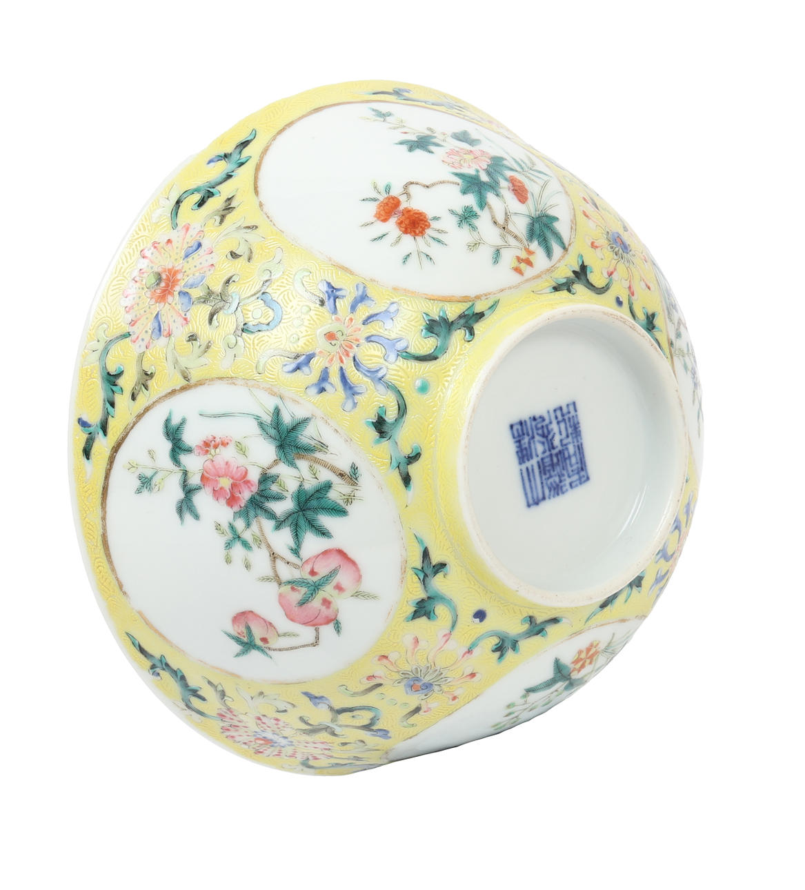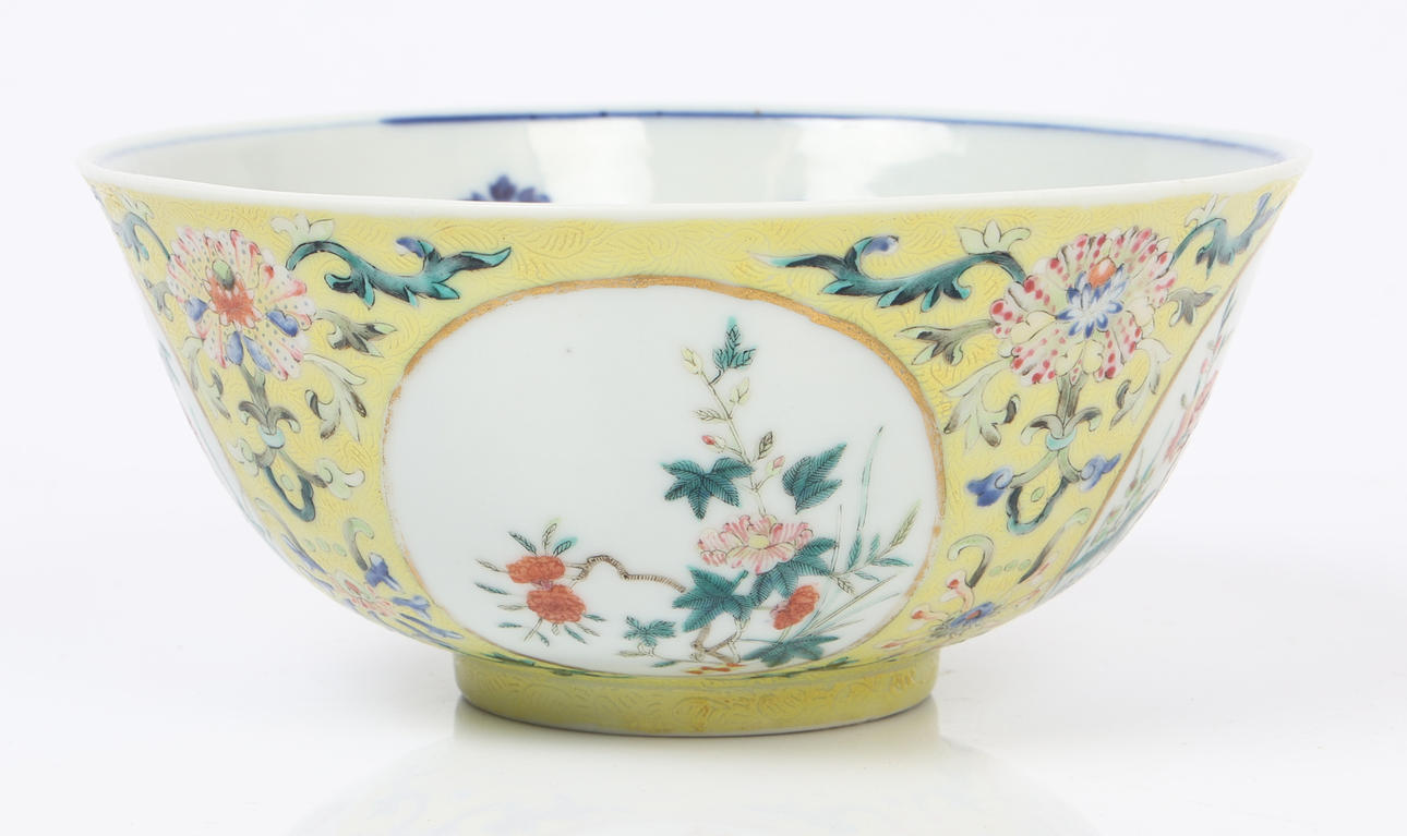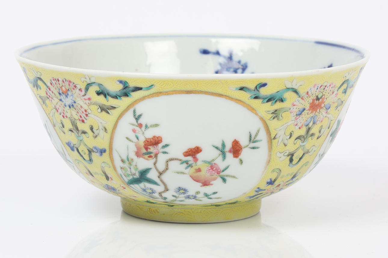DAOGUANG MARK AND PERIOD (1820-1850). Painted to the interior with a basket of flowers below flower sprays, the exterior painted with floral roundels on a stylised lotus ground, 14.5cm diameter good condition, some minor losses to gilding, very minor chip to footrim. 25268