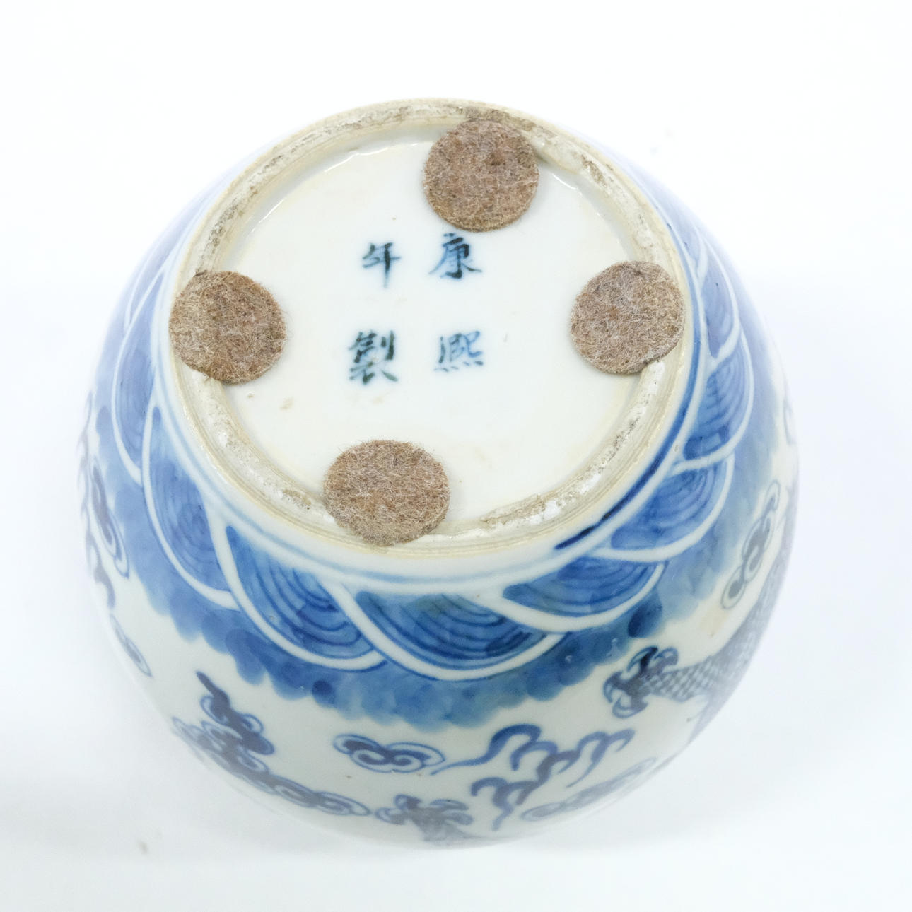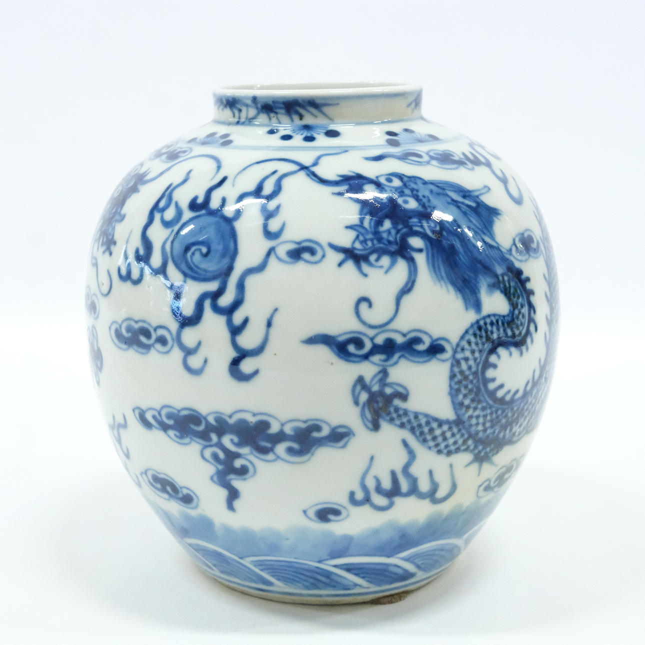 Blue-white with dragons of dragons chasing the burning pearl. Bottom marked with four character characters in blue. Height 15cm. Condition Coating. Glaze mist/beauty defect. Foot ring with notch. 32237