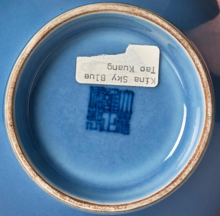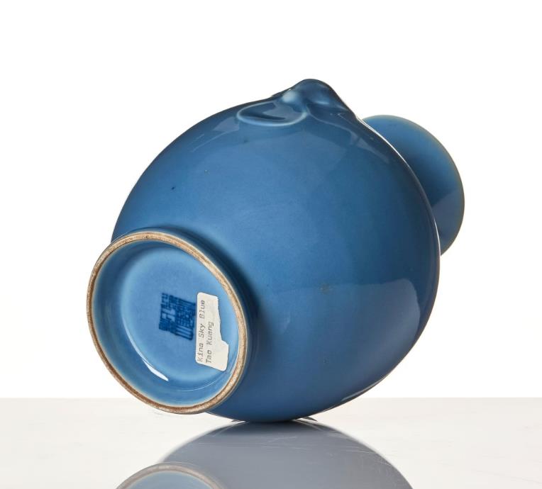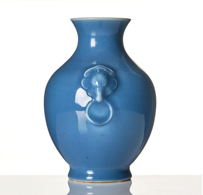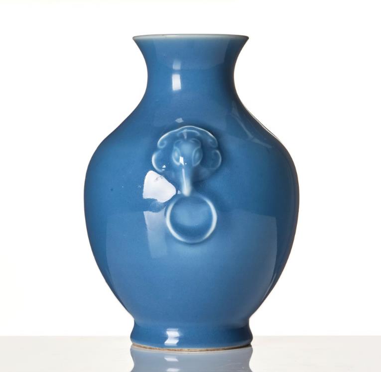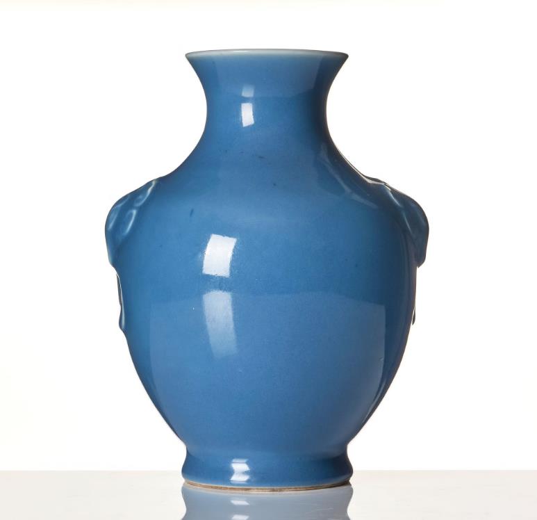 The broad body tapers towards the waisted neck with flared rim, shoulder with mask-and-ring handles, covered in a clair-de-lune-blue glaze. The base with Yongzheng mark but later. Height 20 cm.