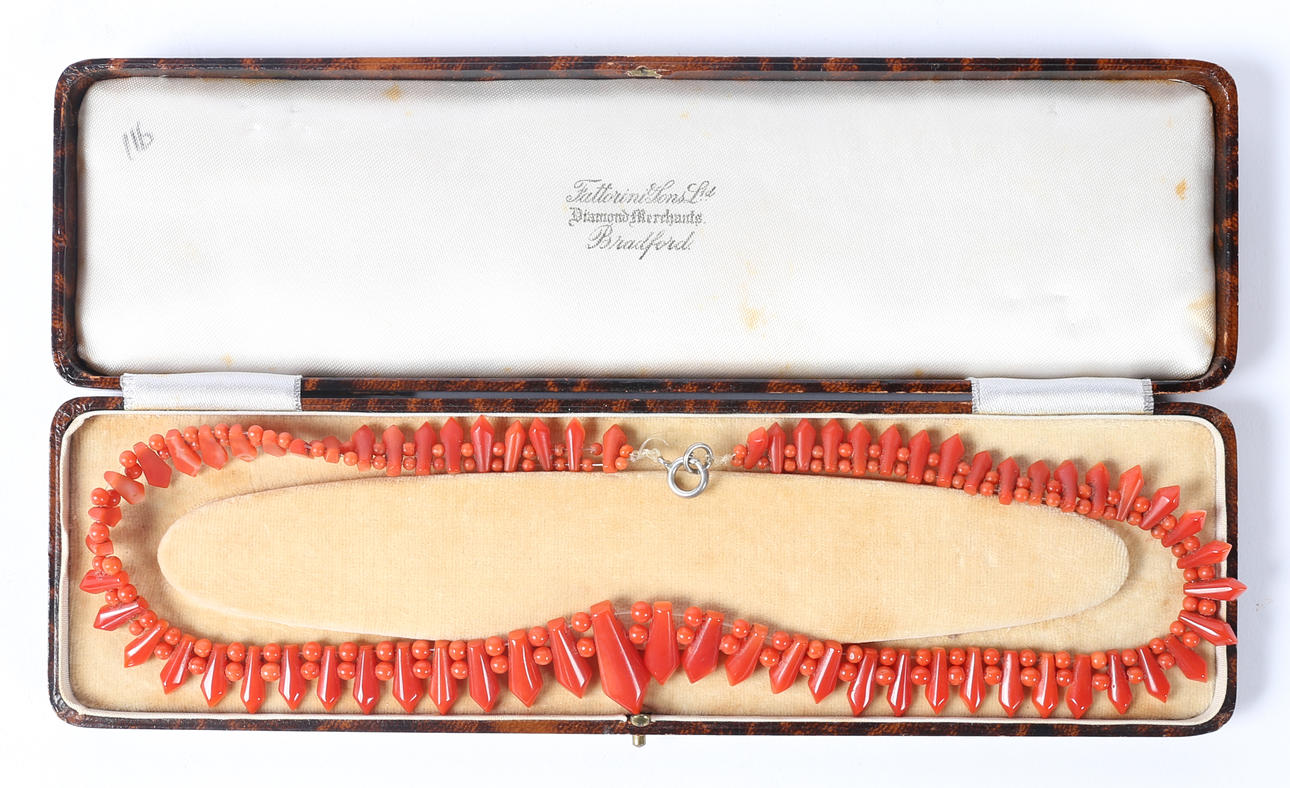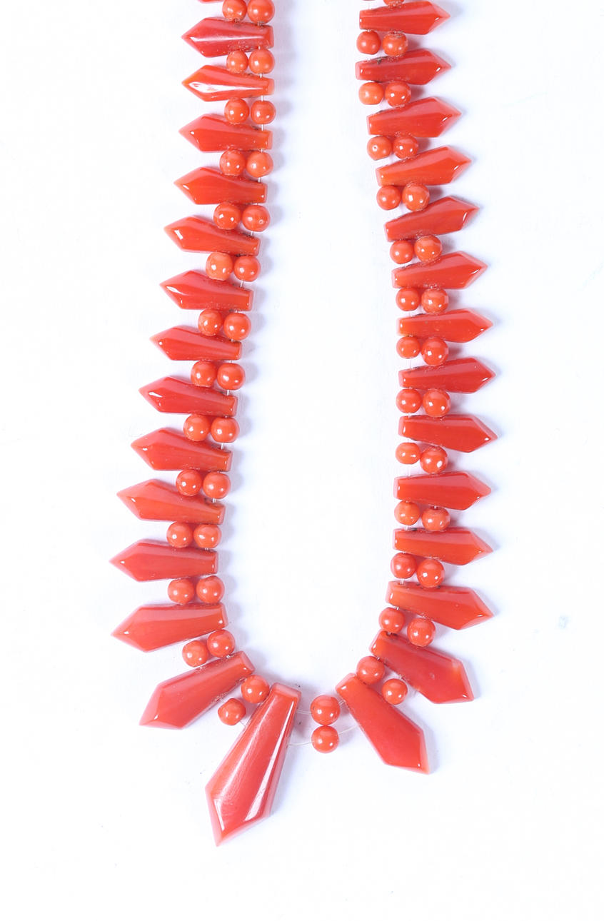 Formed from graduated elongated beads terminating in a point, each interspersed by two coral beads, 44cm long. Condition one round bead missing, necklace has been restrung but would benefit from better restringing. 9851