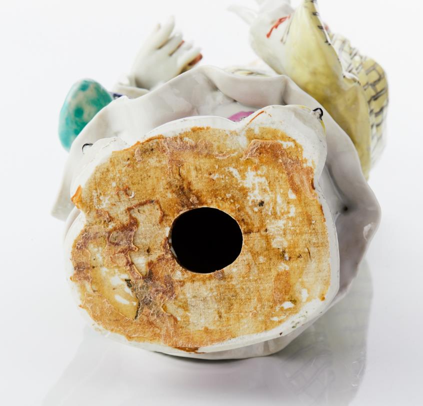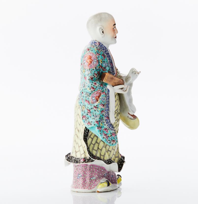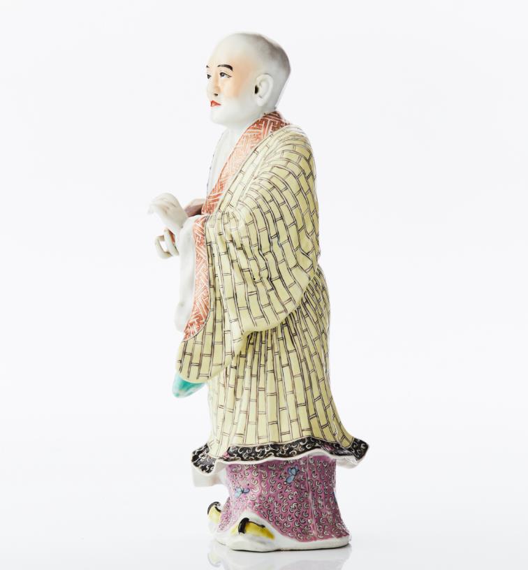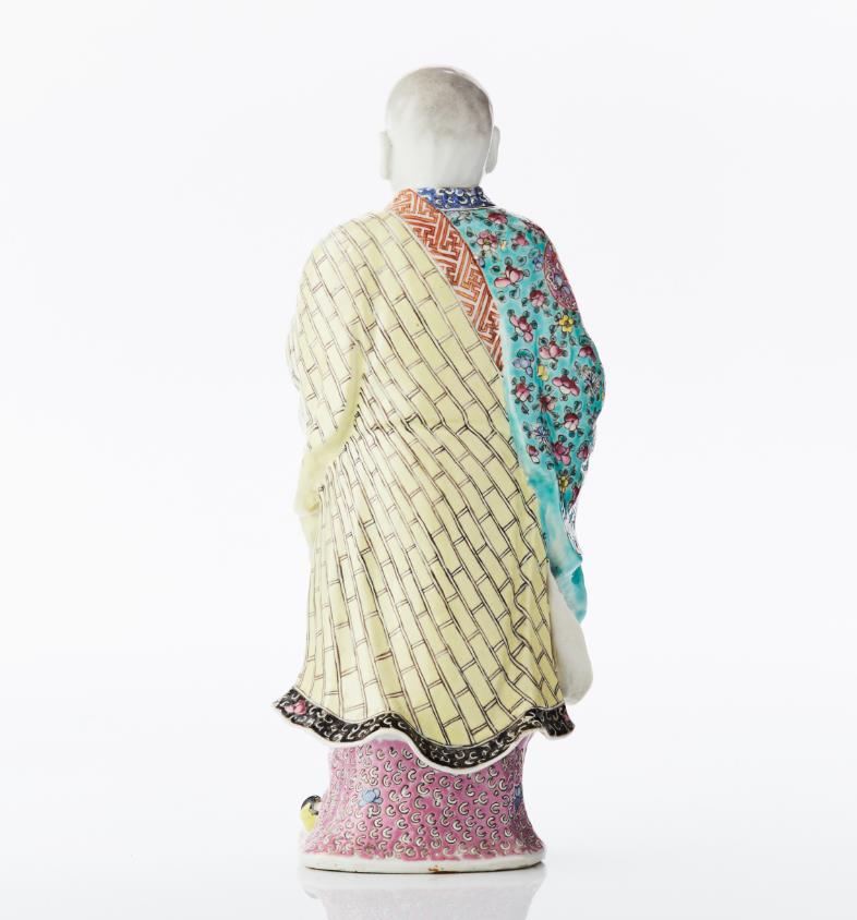A Famille Rose Porcelain Figure of a Standing Luohan Clad in multi-patterned robes, with his left hand raised in front of his chest, and holding an ingot in his right hand, painted in famille rose enamels, gilding and iron-red, the base unglazed. Period: mid 19th century. Height: 27.5 cm.