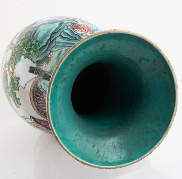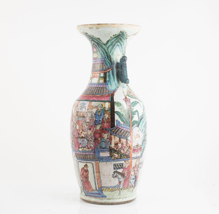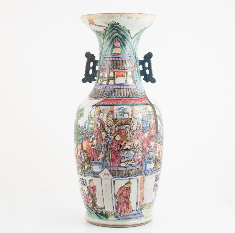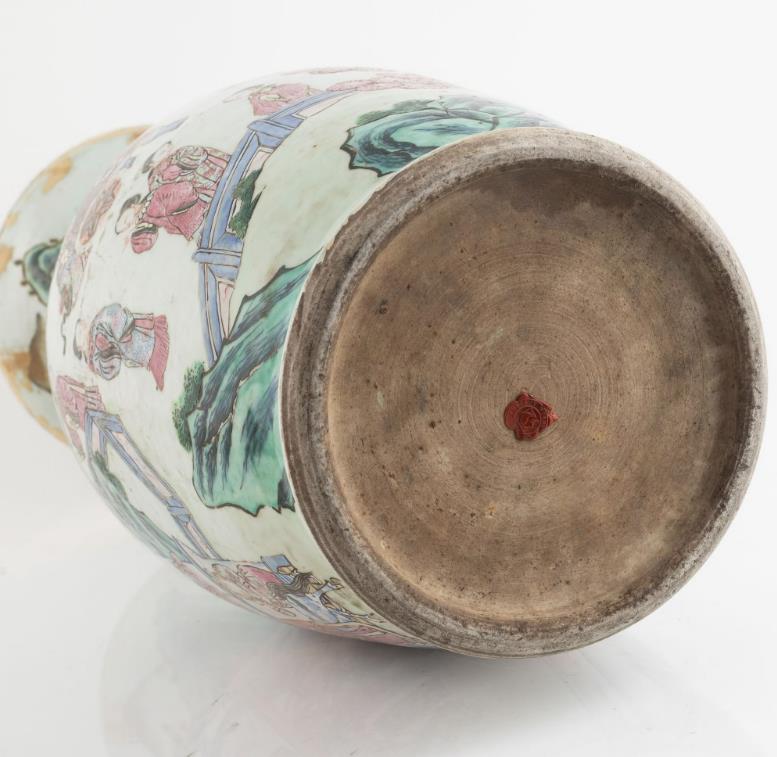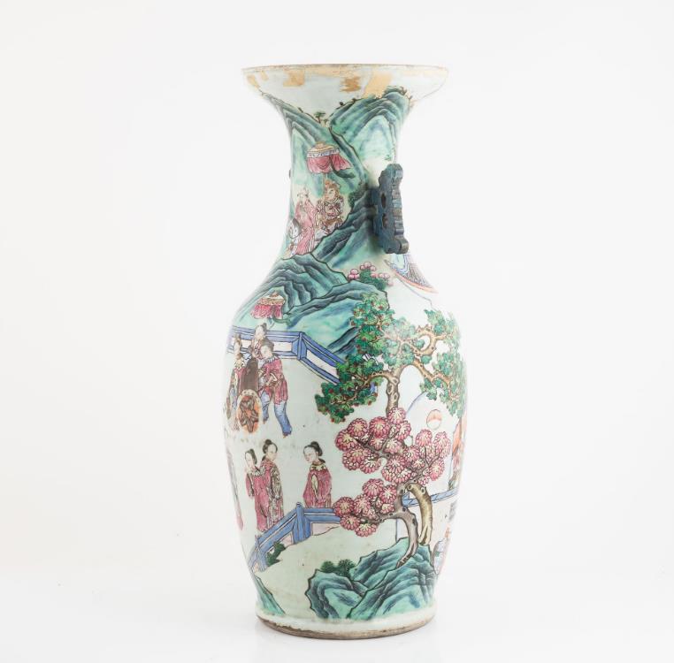 Baluster shape, sculpted handles. Decorated with scenes from court life with elegant ladies in a garden, scholars and riding men with horses in a mountanious landscape. Height 60.5 cm. Wear. Repairs.