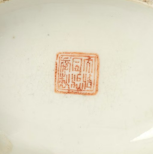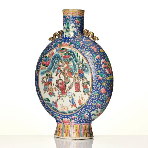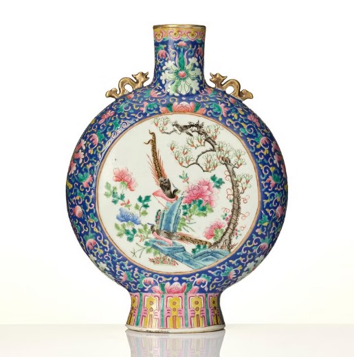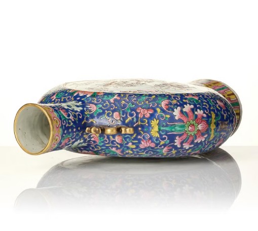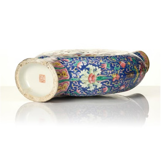 Round flattened shape with a tall neck and dragon handles, decorated in the famille rose palette with a figure scene to one side and a bird in a blossoming garden to the other side. Seal mark in red to base. Height 40.5 cm. Wear.