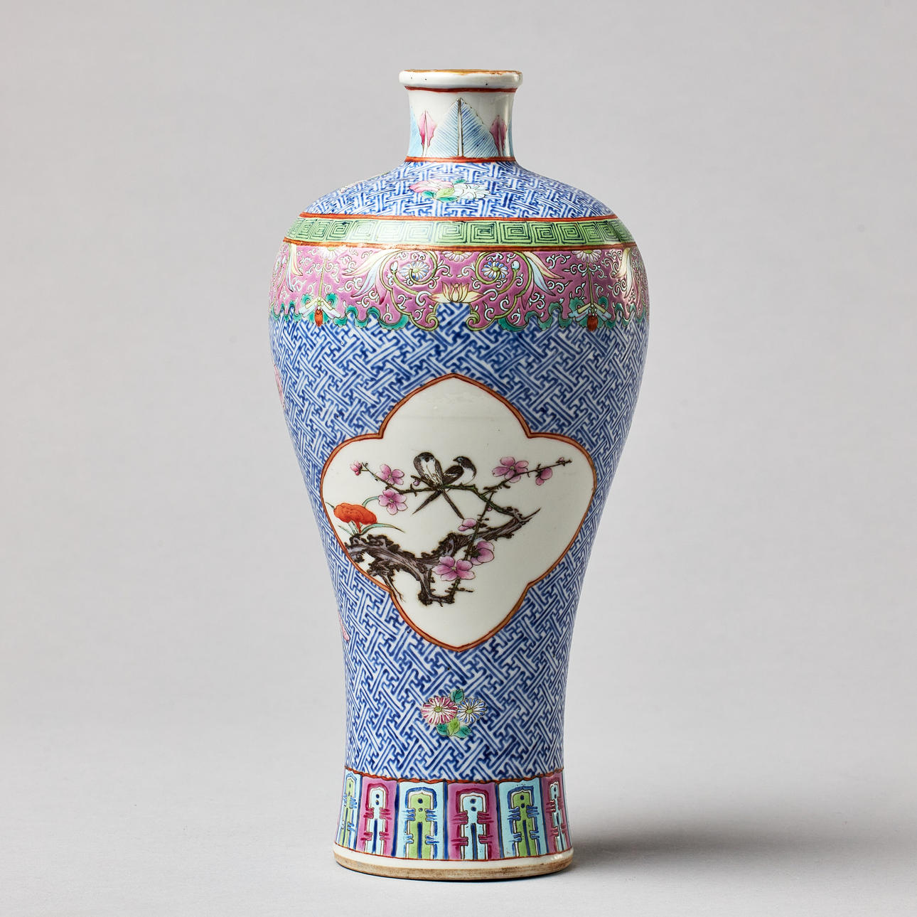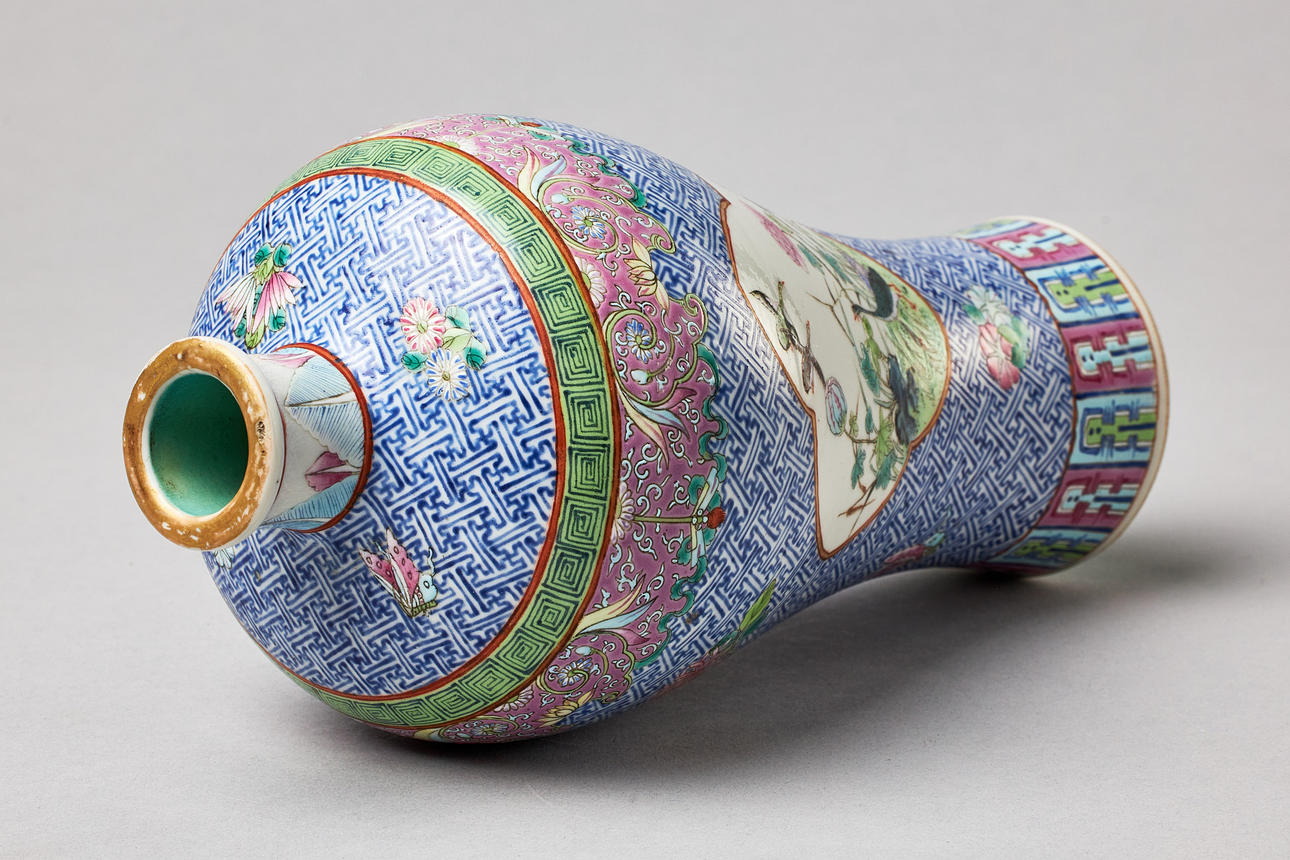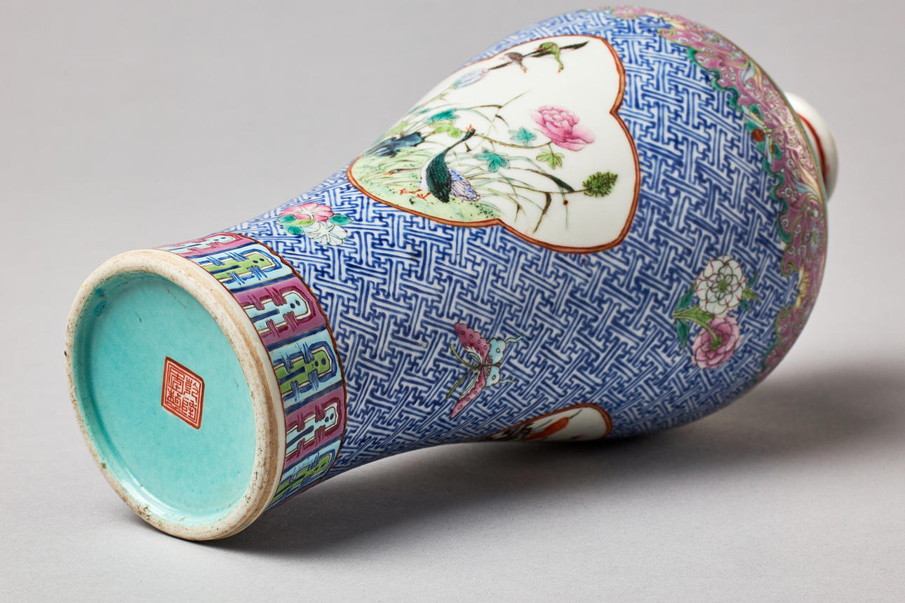 the sides enameled with a multi-colored floral band along the shoulder above two large bird and flower reserves surrounded by butterflies and flowers all on an intricate sky blue wanzi key-fret pattern ground, Republic period (1912-1949), height c. 22.5 cm. Condition Wear and firing defects. 29048