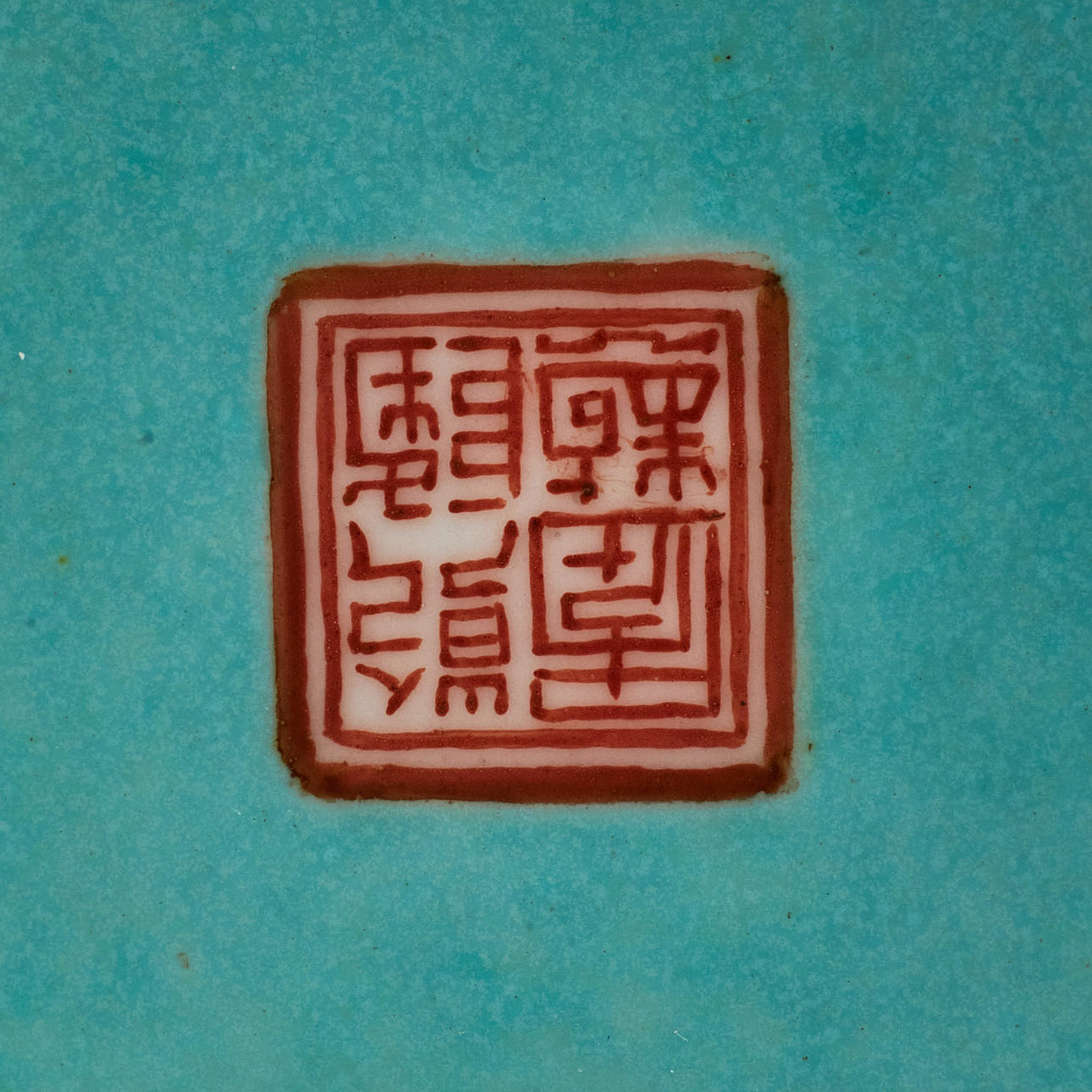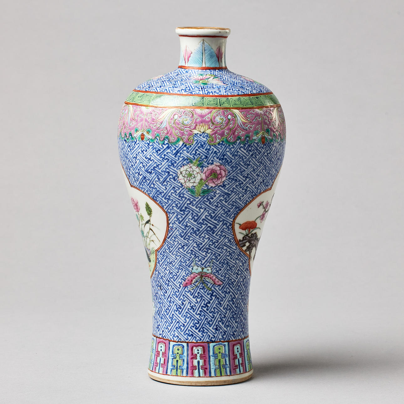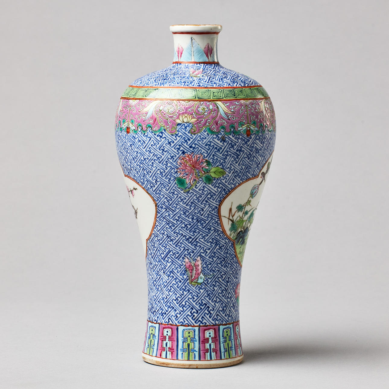 the sides enameled with a multi-colored floral band along the shoulder above two large bird and flower reserves surrounded by butterflies and flowers all on an intricate sky blue wanzi key-fret pattern ground, Republic period (1912-1949), height c. 22.5 cm. Condition Wear and firing defects. 29048